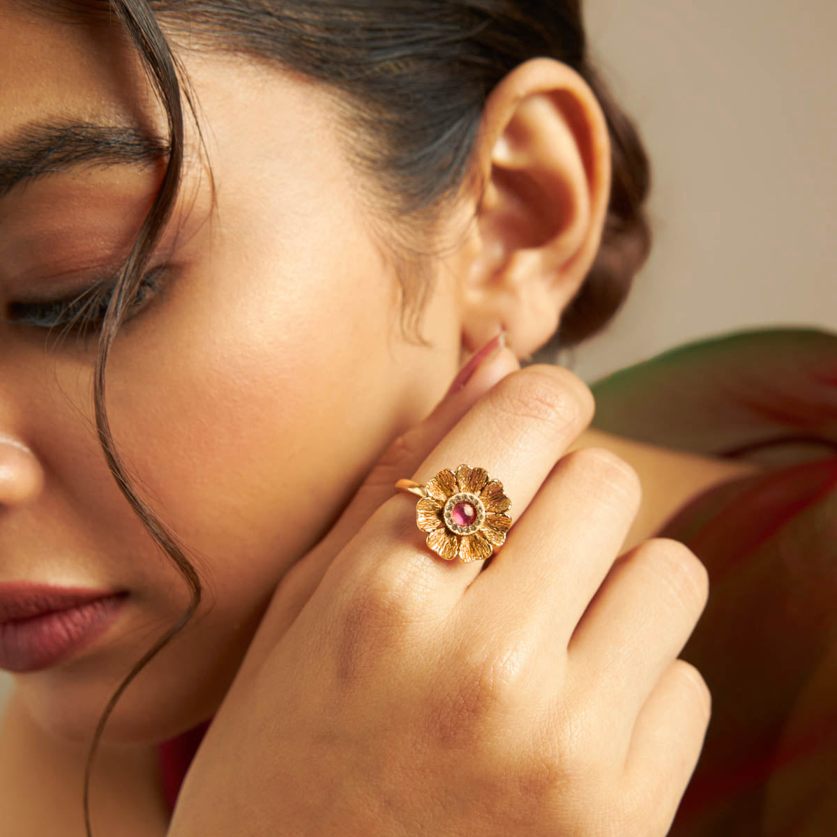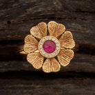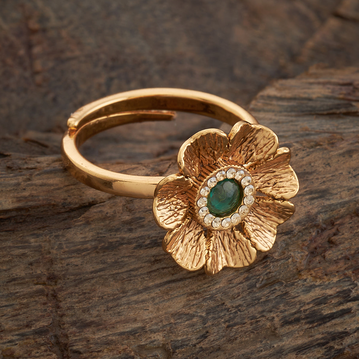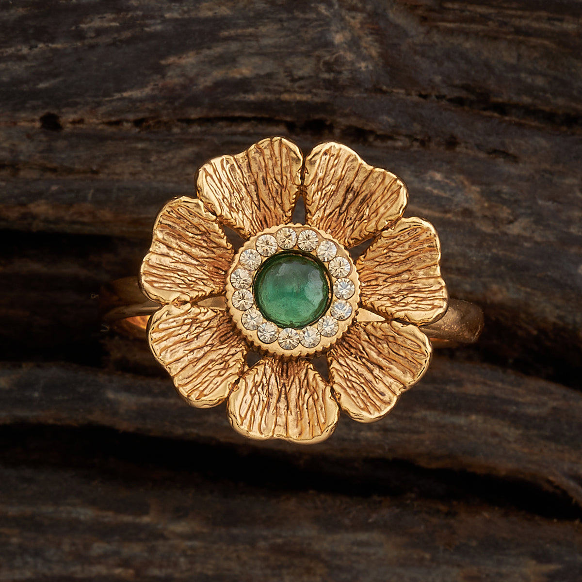You must have seen numerous rings while searching online, but our latest antique finger ring beats them all in terms of elegance and beauty. The charm of this ring comes from the green and ruby stones studded in the floral work details, and the gold polish enhances the shine of the final look. Trust it to be your favourite partner.