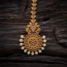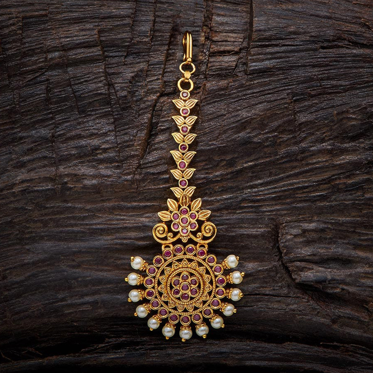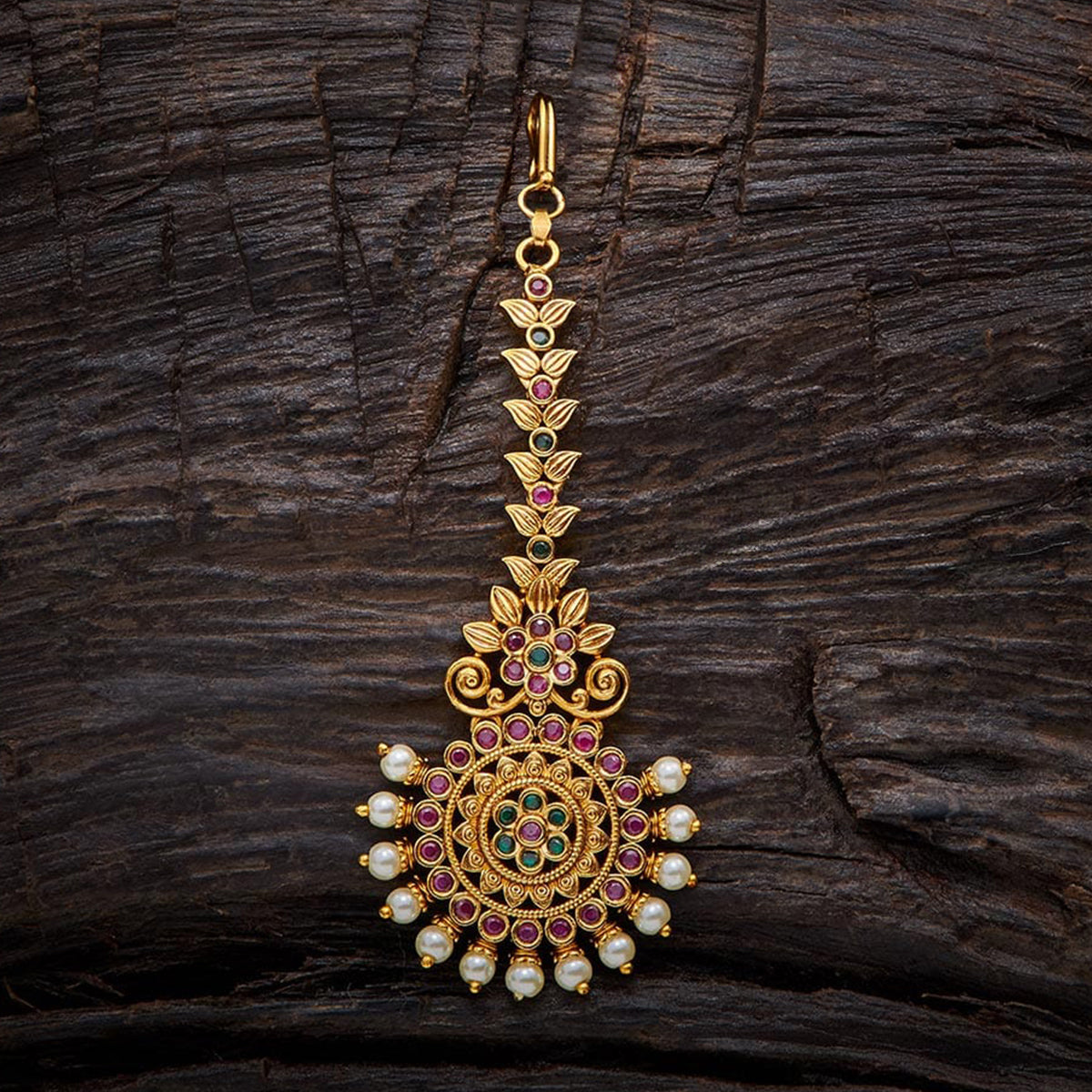 Adorn yourself with the Antique Tikka, a reflection of timeless beauty. Forged from a copper alloy and studded with synthetic stones, it captures the essence of classic traditions. The radiant gold polish amplifies its allure, making it an ideal choice for celebrations and ceremonies. Measuring 10 cm, it sits elegantly on the forehead, enhancing your traditional look.