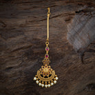 Looking for some beautiful hair accessories for a traditional event? This antique Tikka is a perfect piece to add to your traditional look. The floral carving and tiny leaf design embellished with Ruby stones and hanging pearls are alluring enough for a stunning presence. Style it with loose hair or any other hairstyle and impress everyone on this festive occasion.