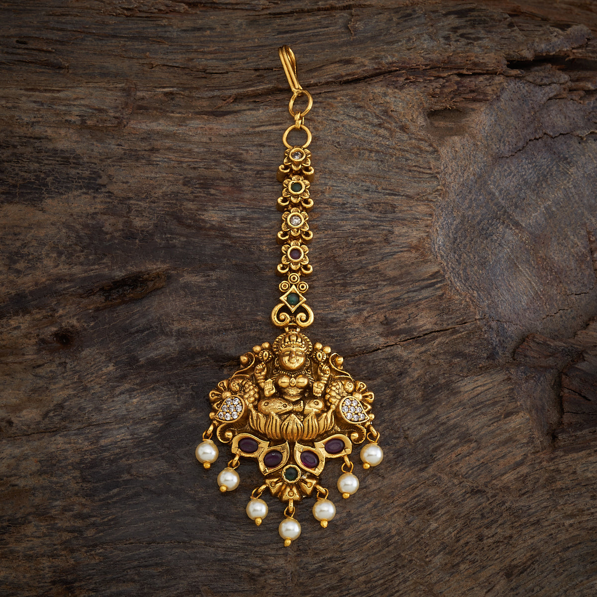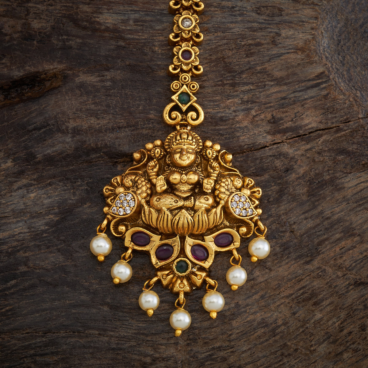 This antique tikka, embellished with ruby-green synthetic stones and gold polish, is a work of art in terms of design and craftsmanship that captures classic elegance and a rich cultural legacy. Because of its elaborate workmanship, vivid stones, and shiny gold finish, this magnificent piece is guaranteed to win hearts and spark admiration wherever it is worn.