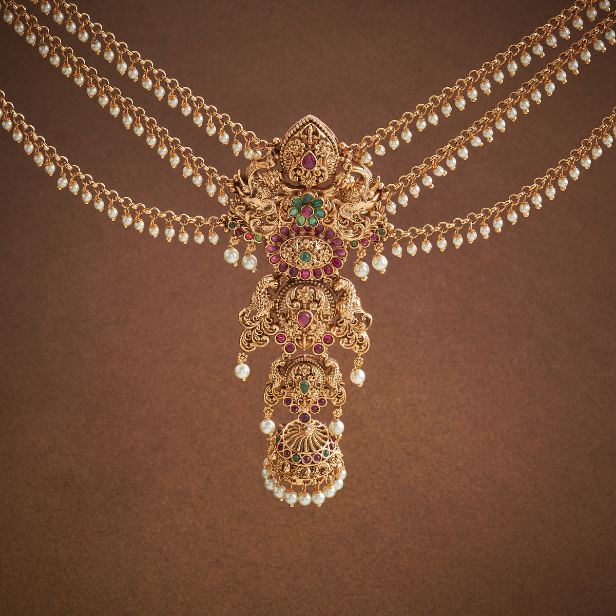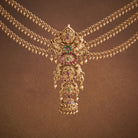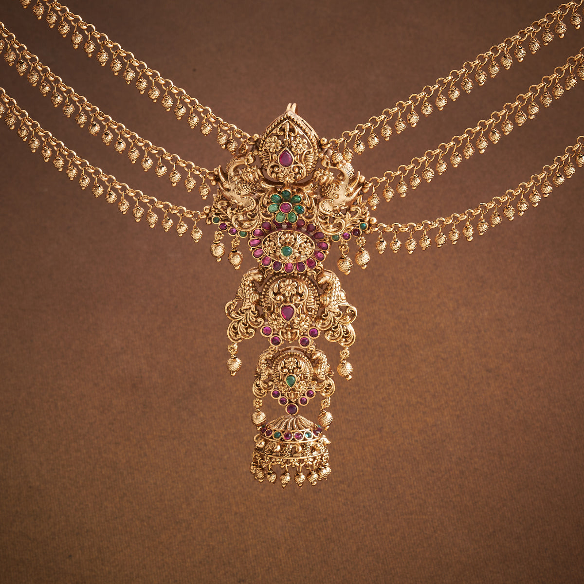 Shine bright with this antique hair brooch. Featuring a traditional design, it has ruby and green synthetic stones set in a rich gold polish. This accessory pairs best with flowy lehengas and soft curls. You can also style this with an evening gown for an Indo-Western look.