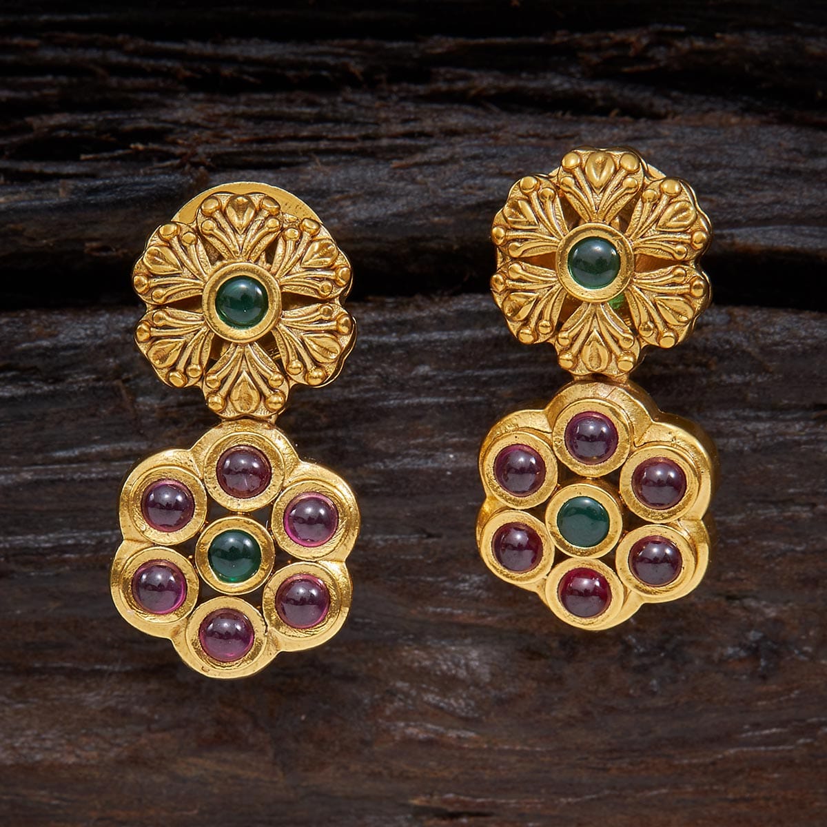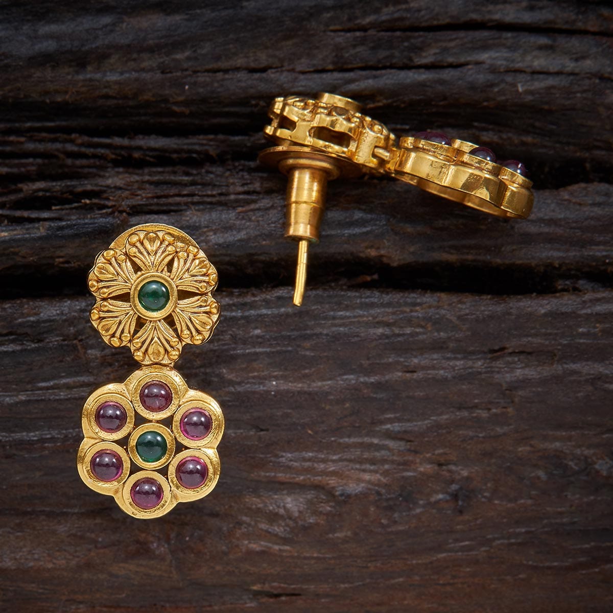 Rock a chic vibe with these antique earrings, crafted from copper alloy with a golden polish. Studded with green or ruby stones in a trendy floral design, they're the ultimate statement-making jewellery. These perfect push-back earrings are ideal for any occasion, seamlessly blending with your fusion outfits for that Gen Z flair.