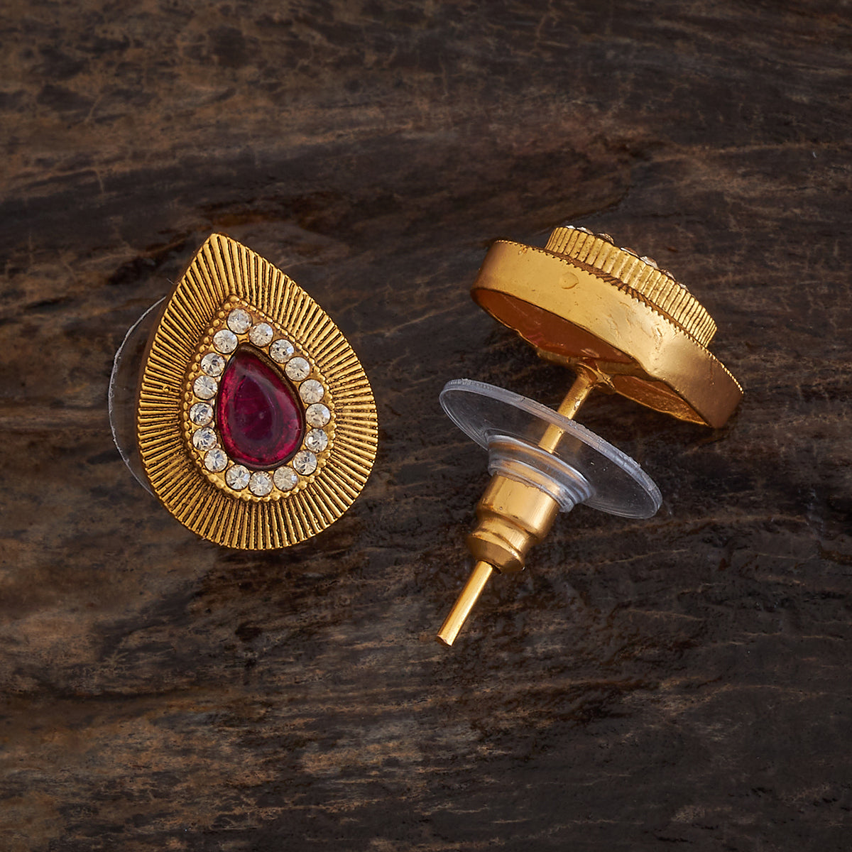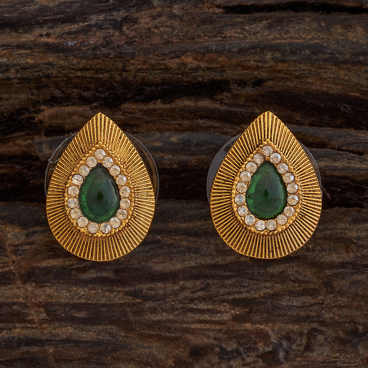 Step back in time with these antique earrings! Their unique design and golden polished finish make them a timeless addition to any wardrobe. Available in green and red stones, these earrings add a vintage touch to modern outfits. Wear the studs with a sleek bun to highlight their intricate details and make a statement!