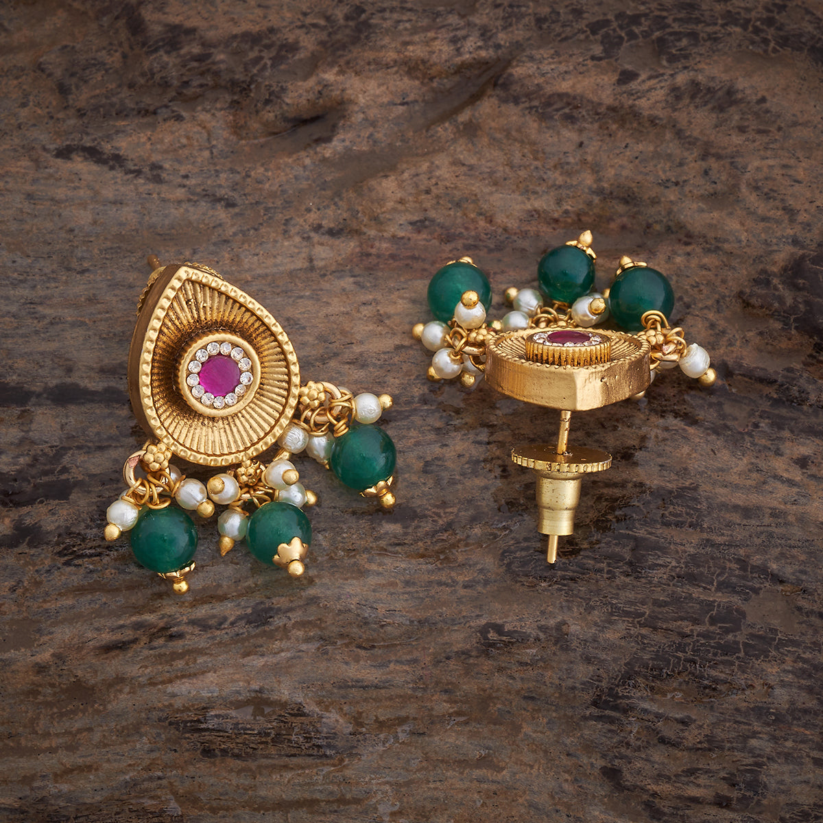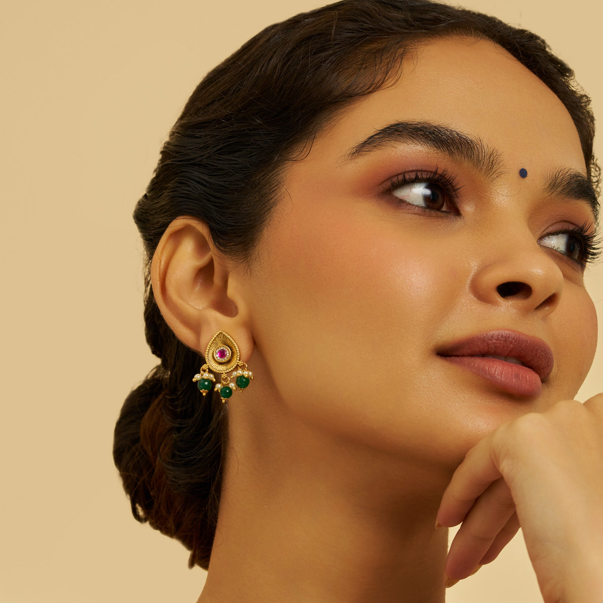 Add a pop of colour to your jewellery collection with Kushal's antique earrings! Available in vibrant ruby or ruby-green hues, these gold-polished studs bring a playful twist to any outfit. Made with synthetic stones and beads, they’re lightweight and comfortable for all-day wear. Perfect for dressing up or adding flair to your everyday look!