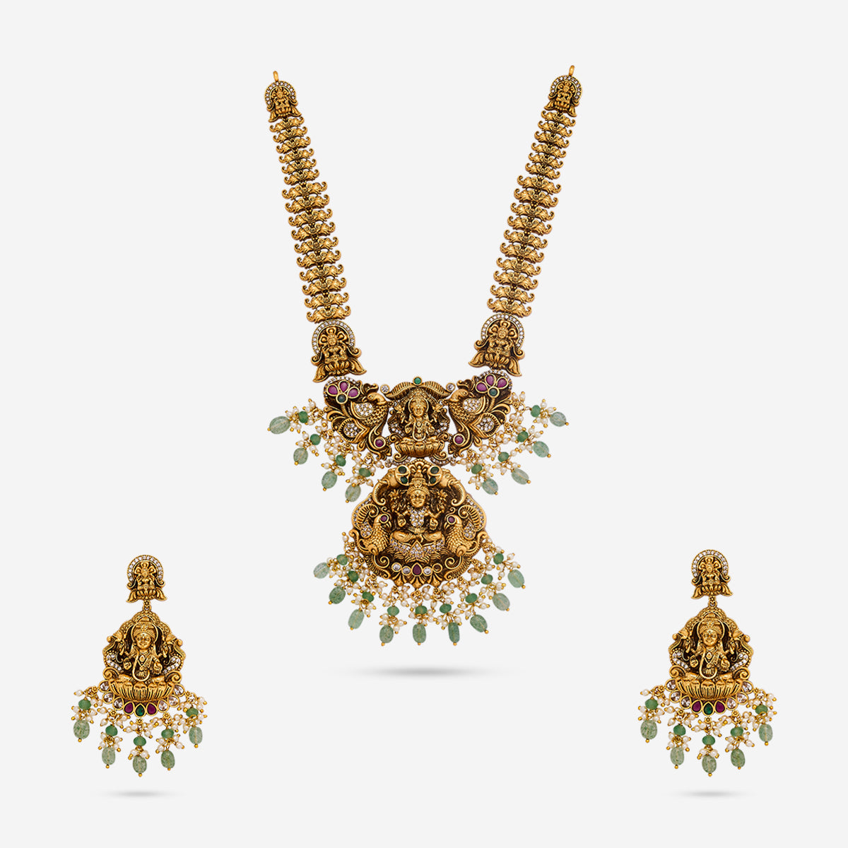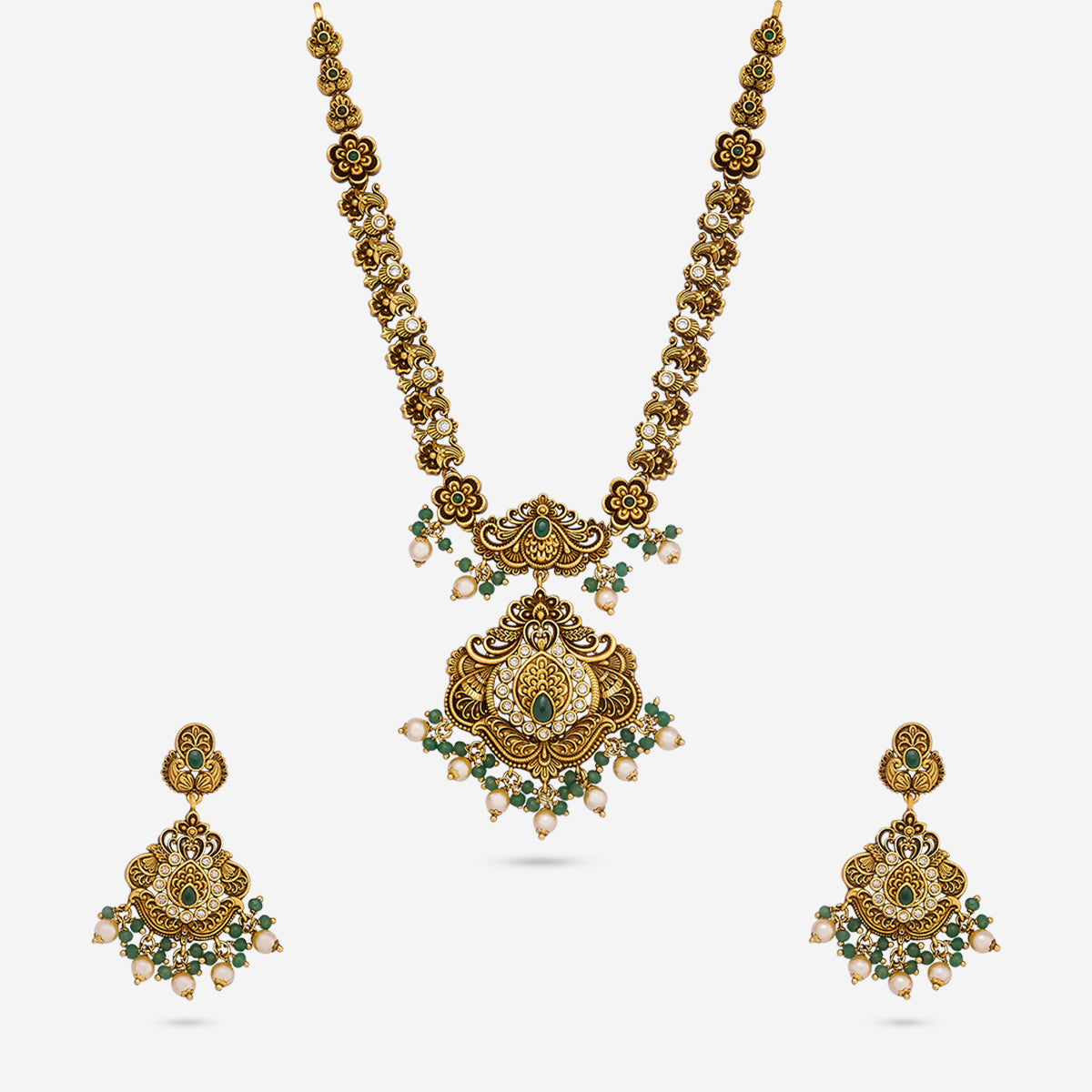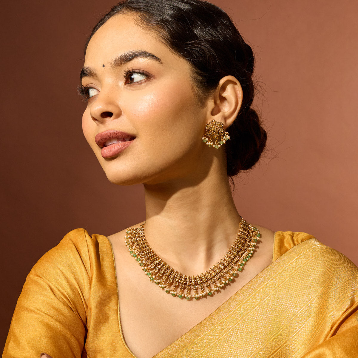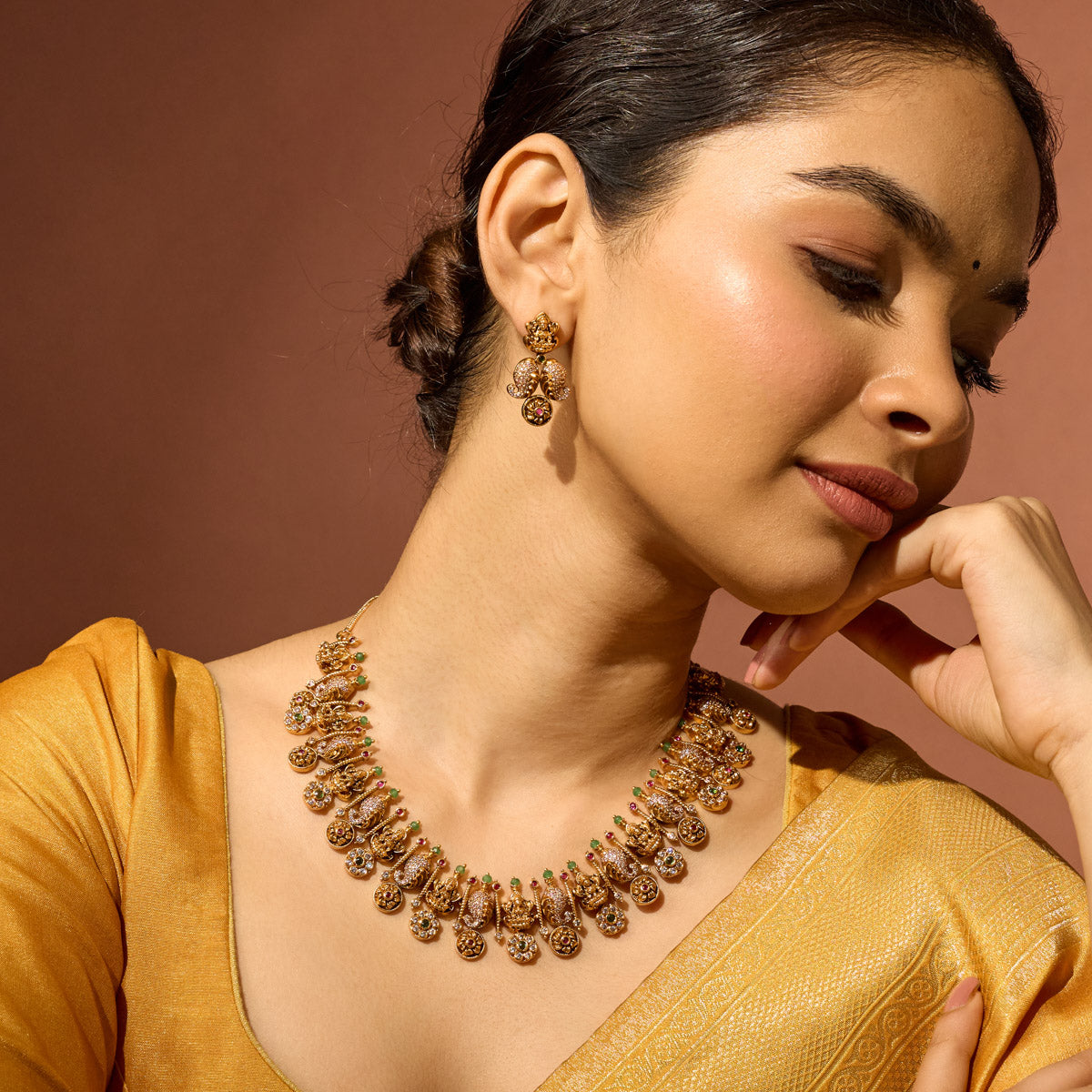Jewelry is always an expression of the wearer’s style, but when it comes to antique-style jewelry, the wearer is tasked with carrying the honor of our country’s esteemed craftsmanship. Known for intricate details and life-like features, antique-style jewelry brings a certain grandeur and opulence to the wearer. Perfect for pairing with attire like sarees and lehengas, make antique necklace sets your traditional must-haves!