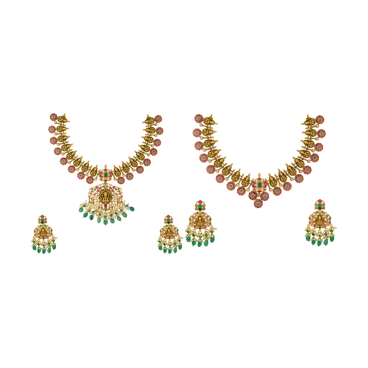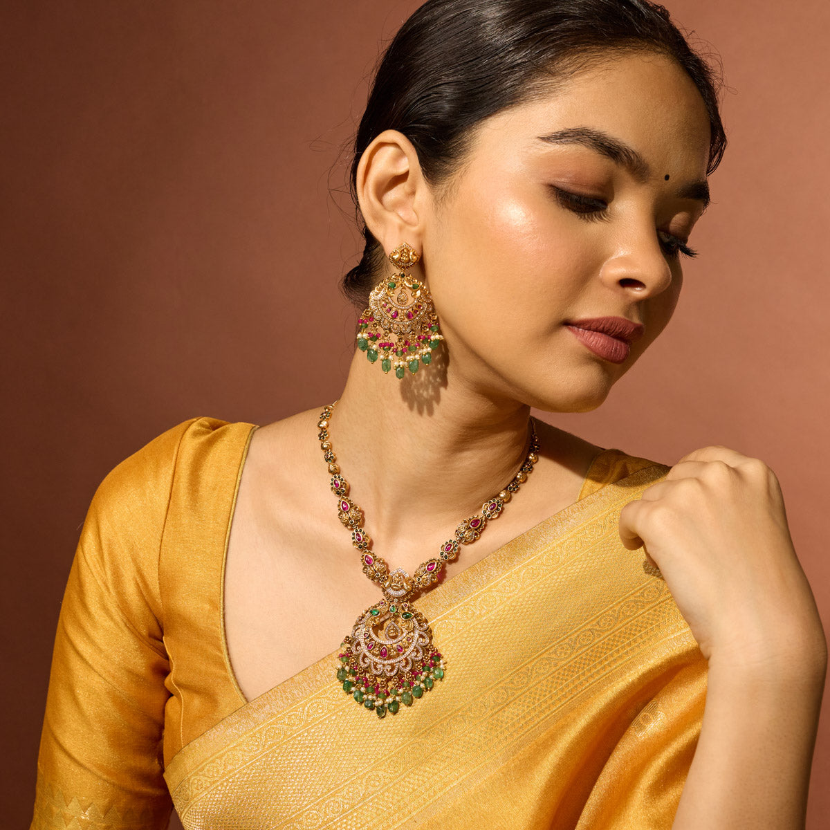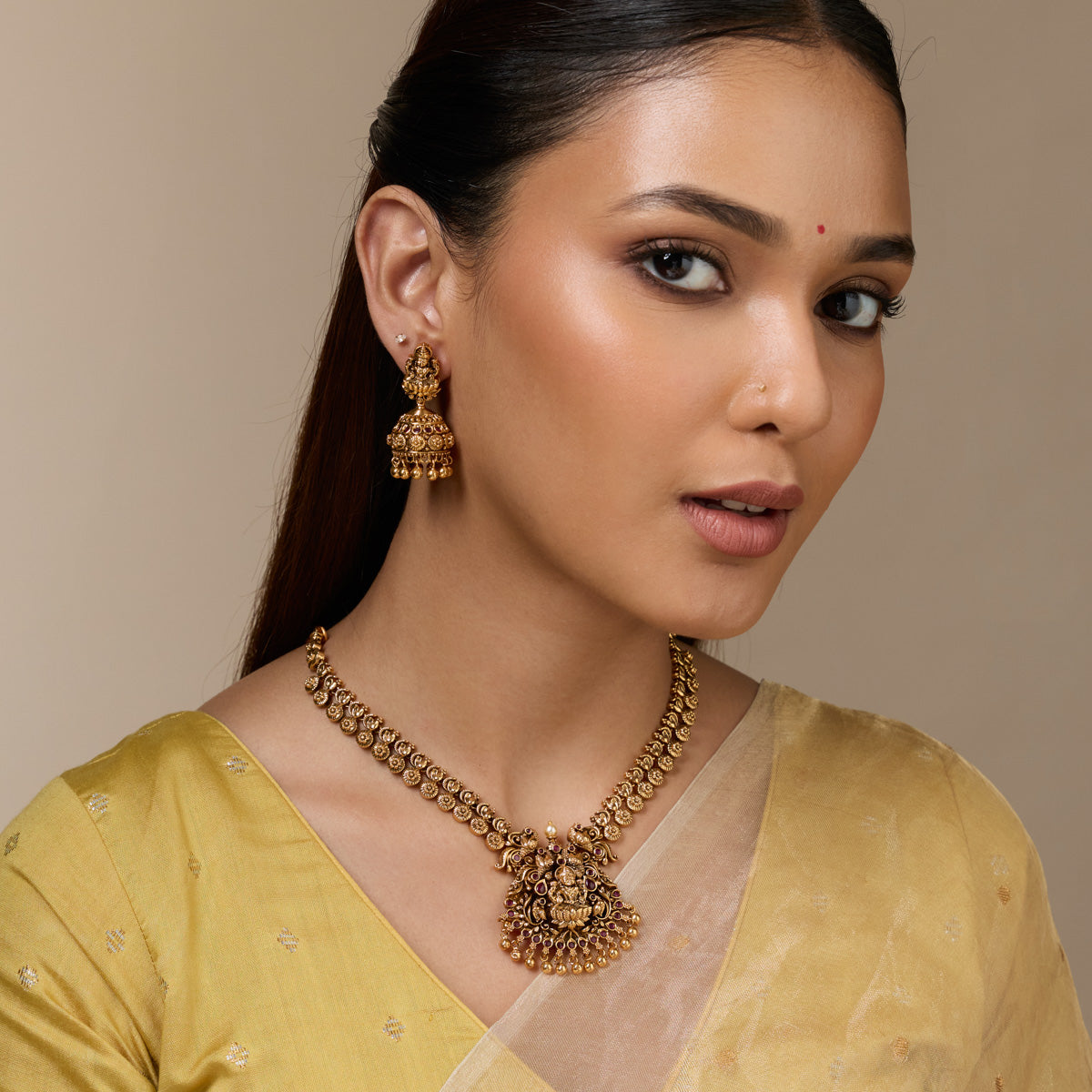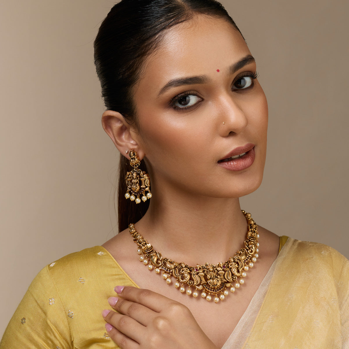 Jewelry is always an expression of the wearer’s style, but when it comes to antique-style jewelry, the wearer is tasked with carrying the honor of our country’s esteemed craftsmanship. Known for intricate details and life-like features, antique-style jewelry brings a certain grandeur and opulence to the wearer. Perfect for pairing with attire like sarees and lehengas, make antique necklace sets your traditional must-haves!