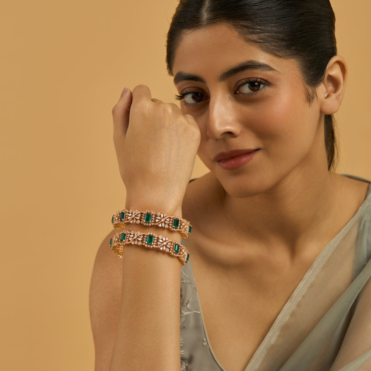 Bangles are something more than just accessories. They denote culture, tradition and style. This piece of jewelry has remained the epitome of grace and a definition of feminity in Indian culture. Be it everyday walks of life or special occasions, our great collection of bangles is for all. Explore our stunning range of Indian bangles and bangle set designs to find your perfect match.