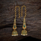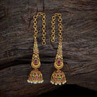 All types of earrings look magnificent and dazzling, but earrings with ear chains have a unique elegance. Allow our latest pair of antique earrings to give you this elegance this wedding season. The ruby and green stones studded in these jhumkas will make you the star of the event, and the gold polish ensures to keep all eyes on you.