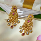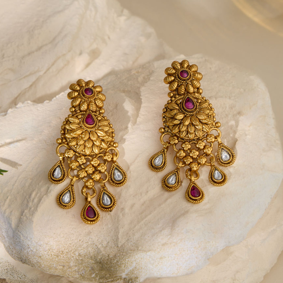 Indulge in elegance with Kushal's antique earrings, featuring a temple gold finish. Adorned with red and emerald synthetic stones, these earrings blend traditional charm with exquisite craftsmanship. Perfect for special occasions, they match with any traditional attire, making you stand out effortlessly.