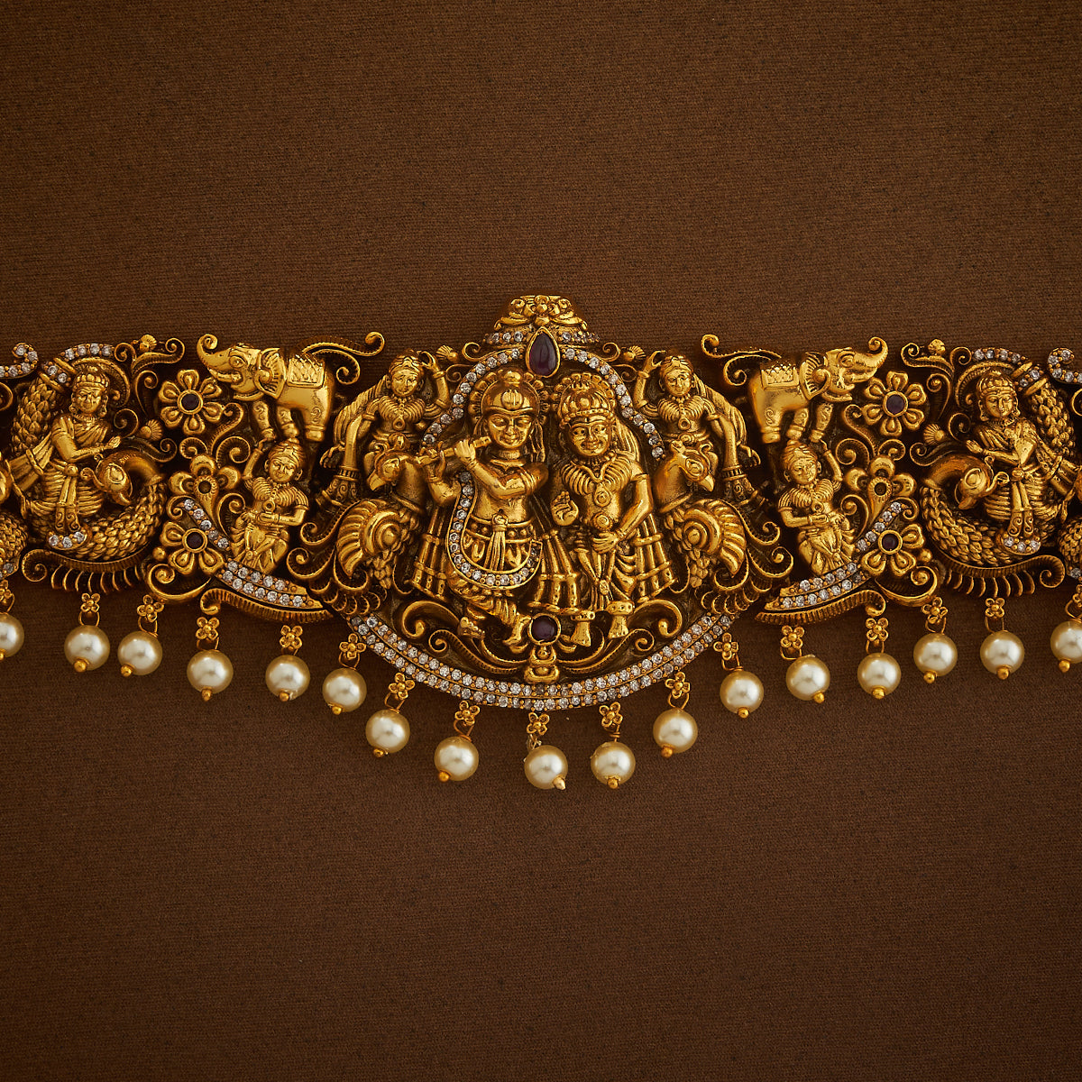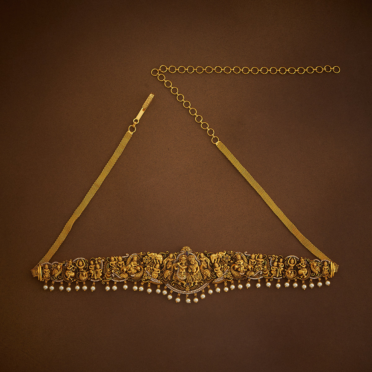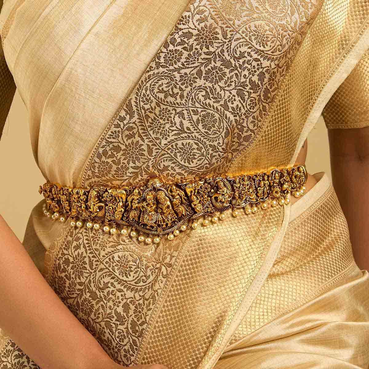 Take a look at this very unique and gorgeous accessory - our antique belt. Crafted with a temple motif, this accessory features ruby coloured synthetic stones and beads and a gold-coloured polish. Made from copper alloy, it adds a touch of class to any ensemble. Elevate your style with this exquisite piece for your next festive event.