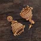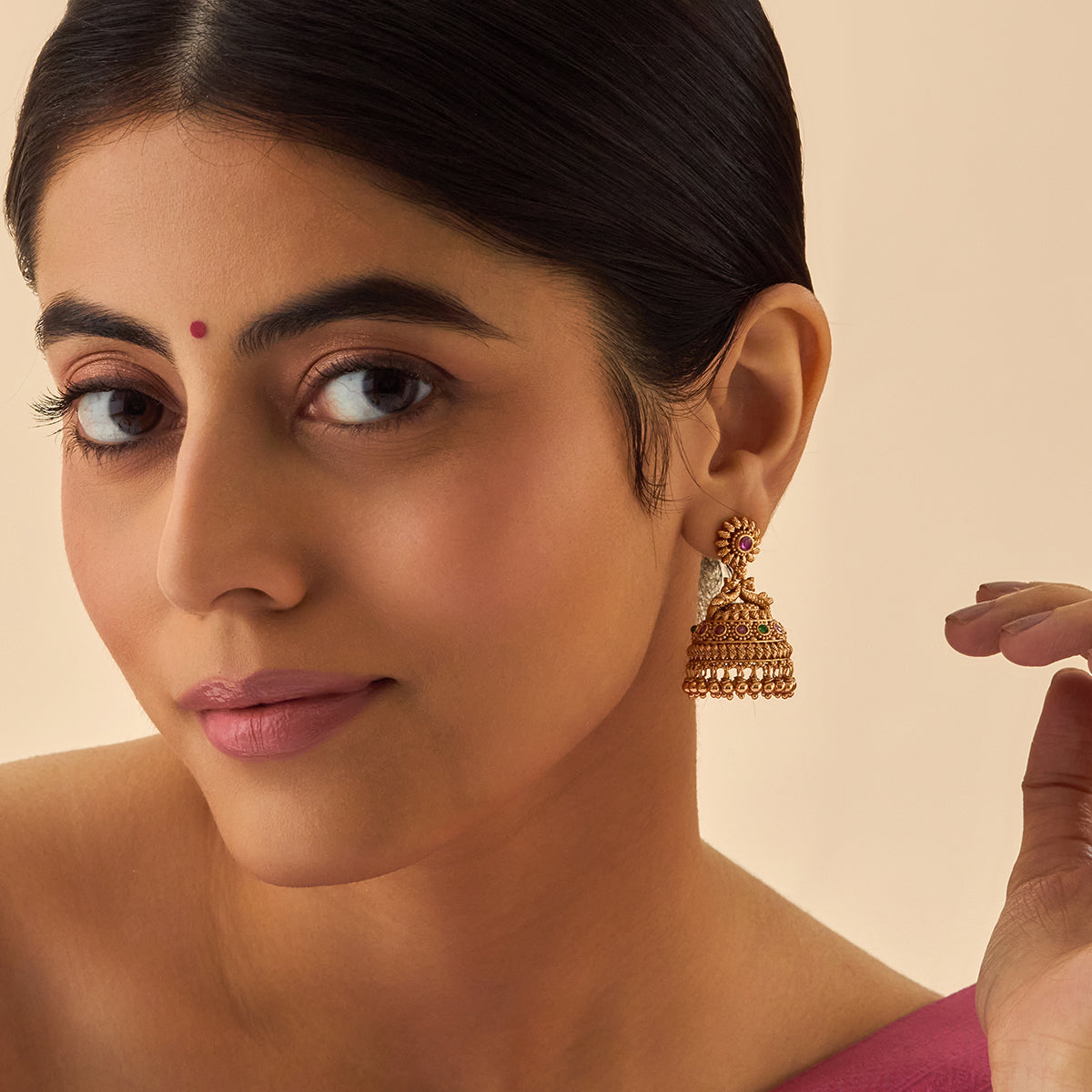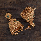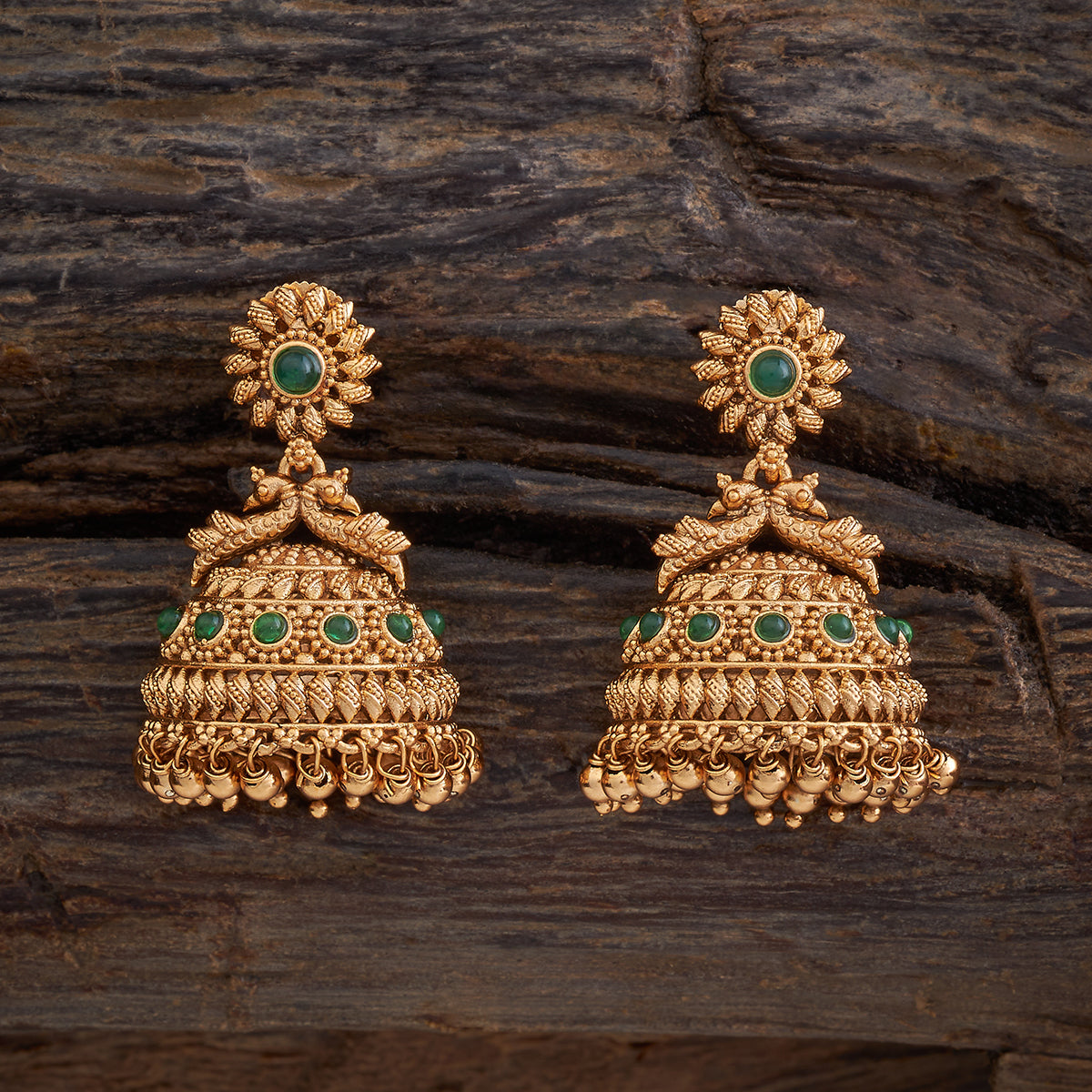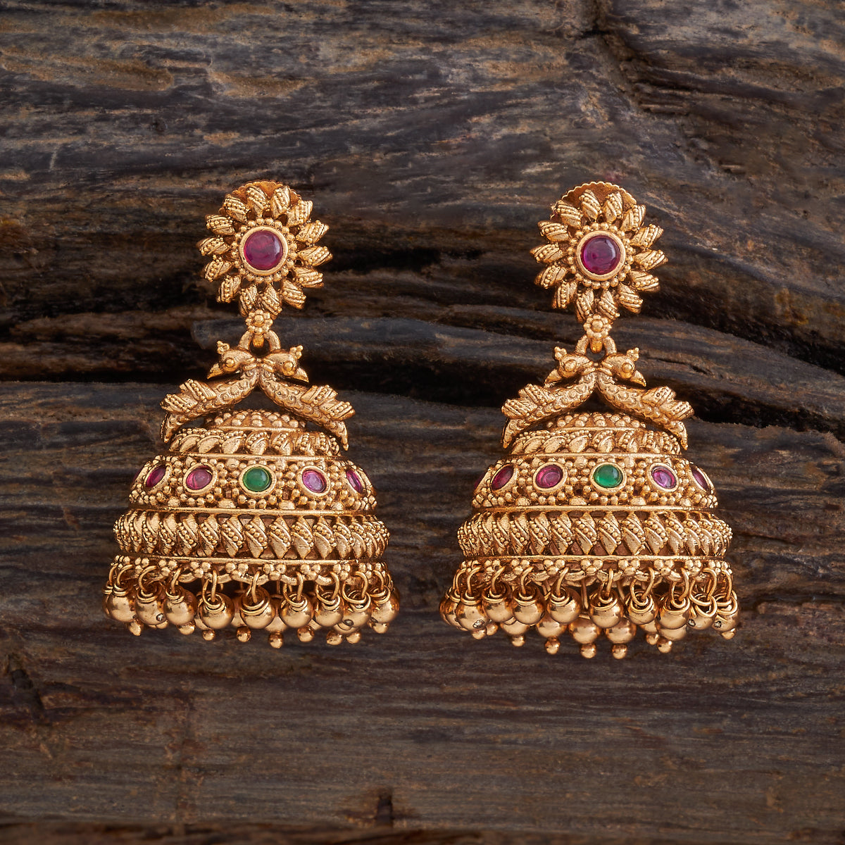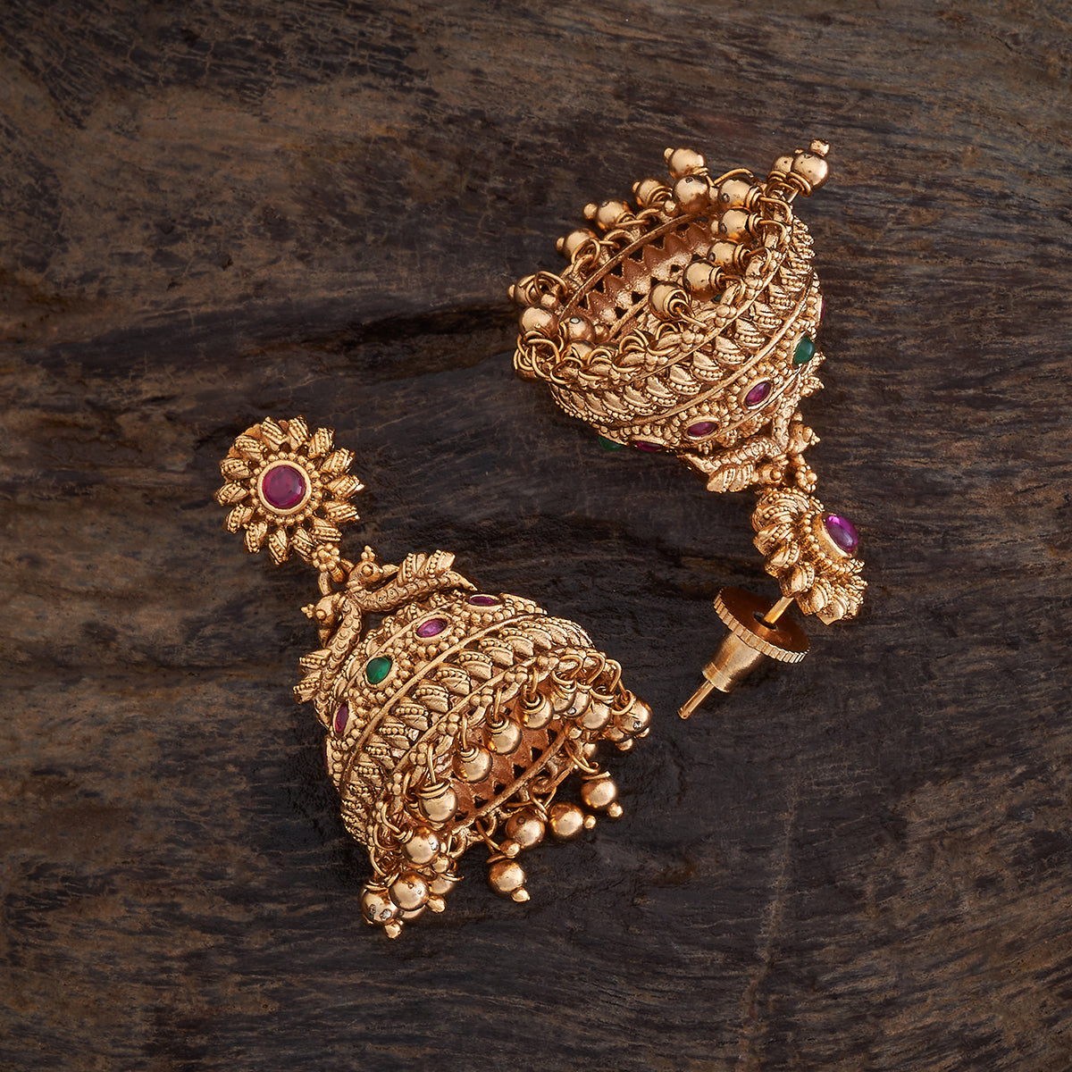 Transform your look with these beautifully crafted antique earrings, crafted with a premium copper alloy. Adorned with synthetic stones in shades of green, ruby, or ruby-green, this pair of jhumkas is perfect to enhance your ensemble. With a push-back closure, these majestic gold-polished earrings provide the most comfortable feel.