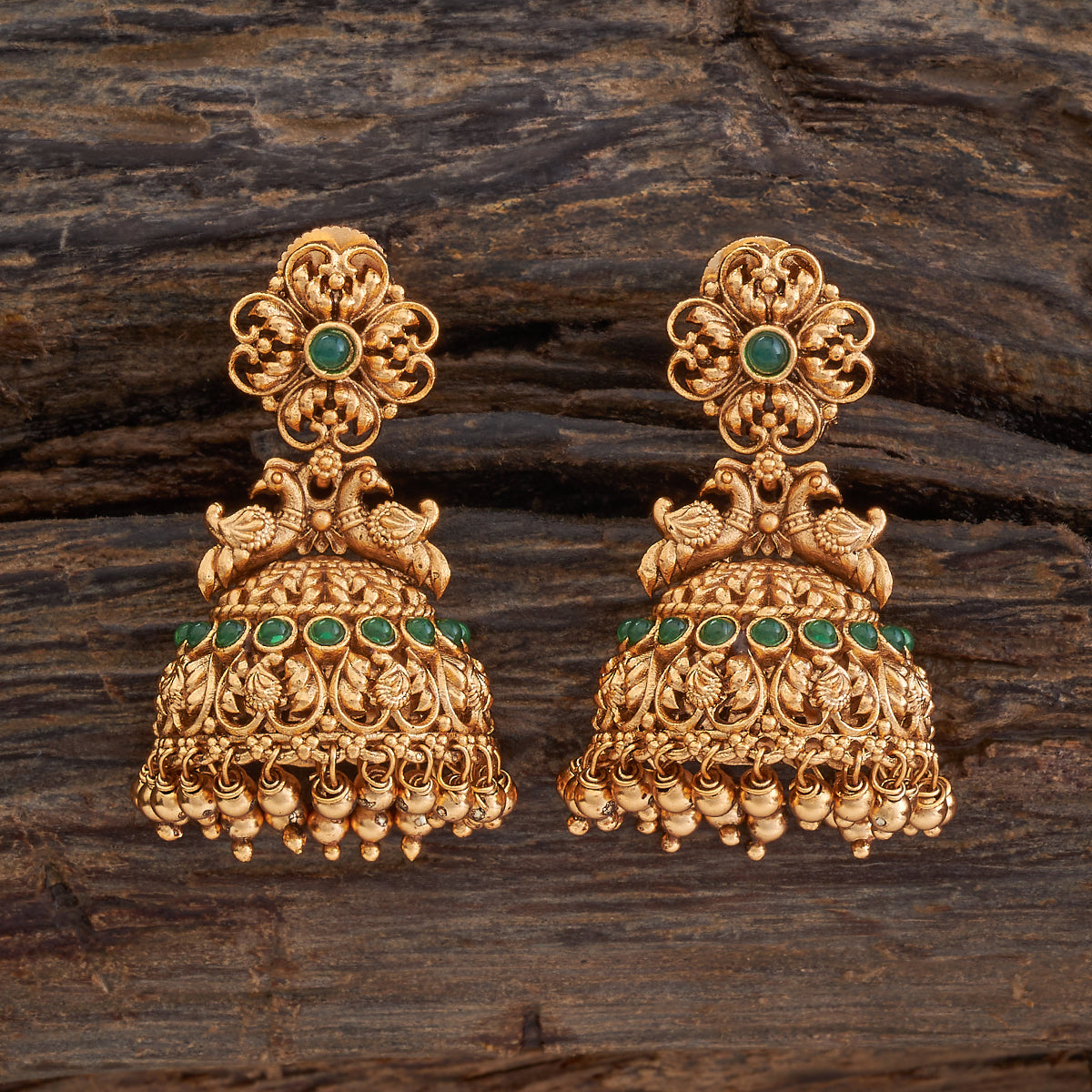Pair these antique jhumka earrings with a saree or lehenga for a classic, traditional look. Featuring intricate designs with green or ruby synthetic stones and a gleaming gold polish, these earrings add a touch of elegance to any festive or cultural occasion. A timeless addition to your jewellery collection.