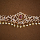 Ideal for adding a touch of effortless glam and refined elegance to any outfit, this zircon belt from Kushal's Fashion Jewellery is designed to fit comfortably on your waist while showcasing impeccable craftsmanship. Styled with sparkling zircon stones and elegant beads in a rich ruby hue, this gold-polished belt exudes opulence and style.