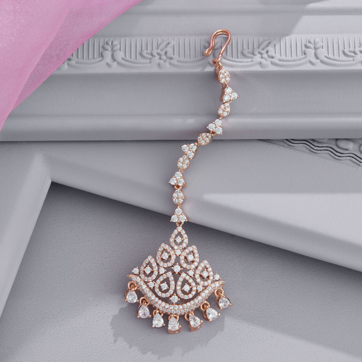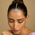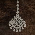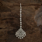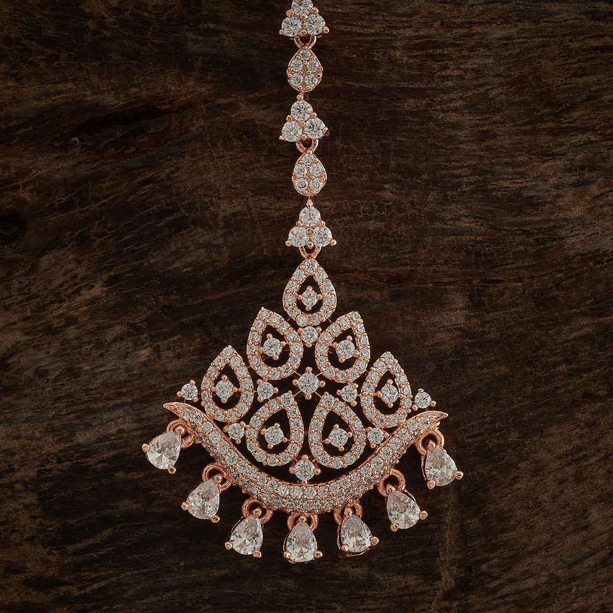 Make a princess statement with Kushal's zircon tikka, featuring zircon stones in a stunning rhodium or rose-gold finish. The drops of zircon stones add a touch of elegance, making it a perfect pairing for a silver lehenga. This exquisite piece will make you feel like a princess on your special day.
