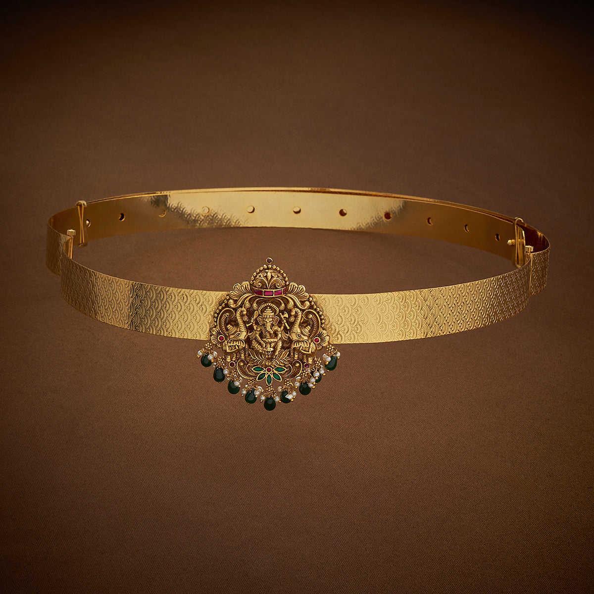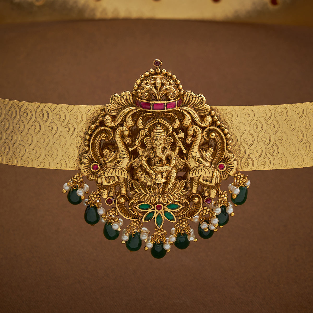 Our gorgeous antique belt, a classic piece with fine detailing, will elevate your ethnic elegance. This belt exudes a sense of royalty thanks to its ruby-green stones, beads, and gleaming gold polish, which evoke regal elegance. For a regal look, the exquisite design of lord Ganesha blends perfectly with traditional attire.