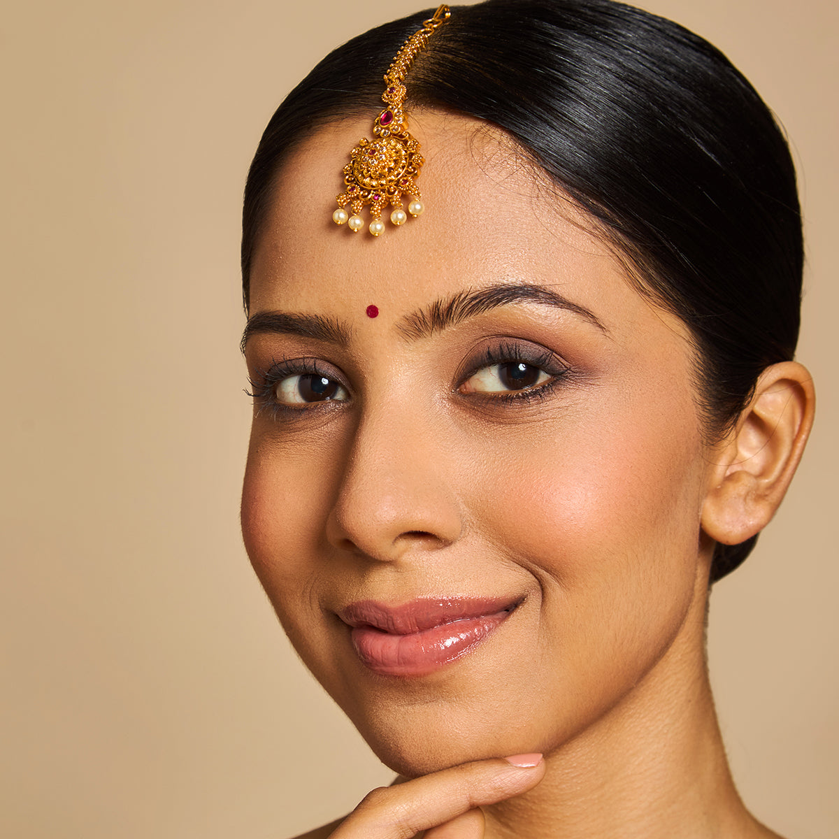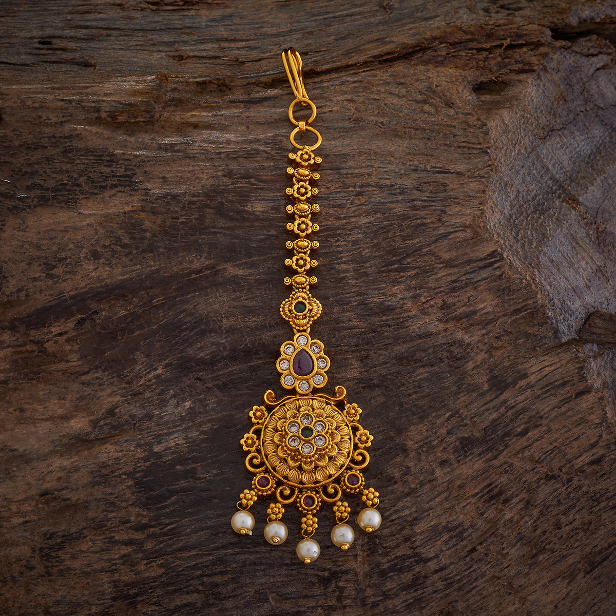 Elevate your look with this antique tikka by Kushal's Antique Jewellery Collection. Crafted with premium copper alloy, this maang tikka is adorned with elegant synthetic and zircon stones in the shades of ruby and ruby green. With a golden polish, this tikka is a perfect addition to all your traditional outfits.