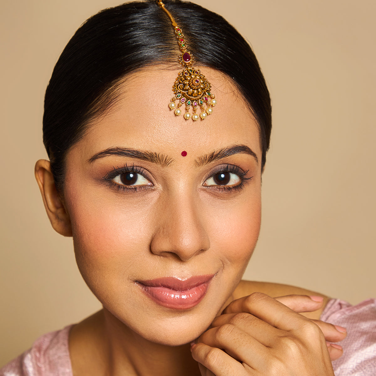 Embrace your Indian heritage with this antique tikka, crafted from copper alloy with a radiant golden polish. Adorned with vibrant ruby and green stones, it adds a touch of elegance and tradition to any look. Perfect for showcasing your cultural pride, this mang tikka is a timeless accessory.