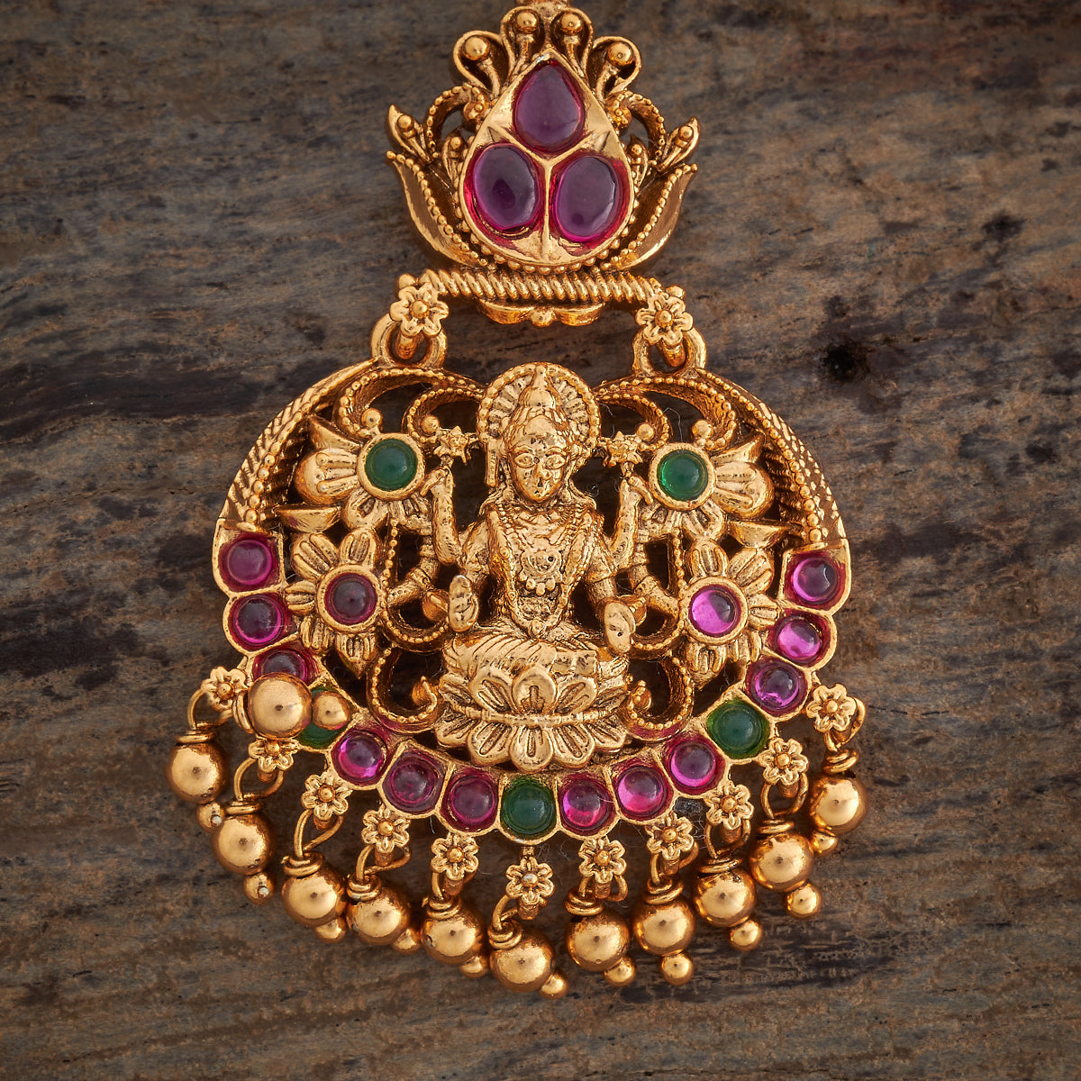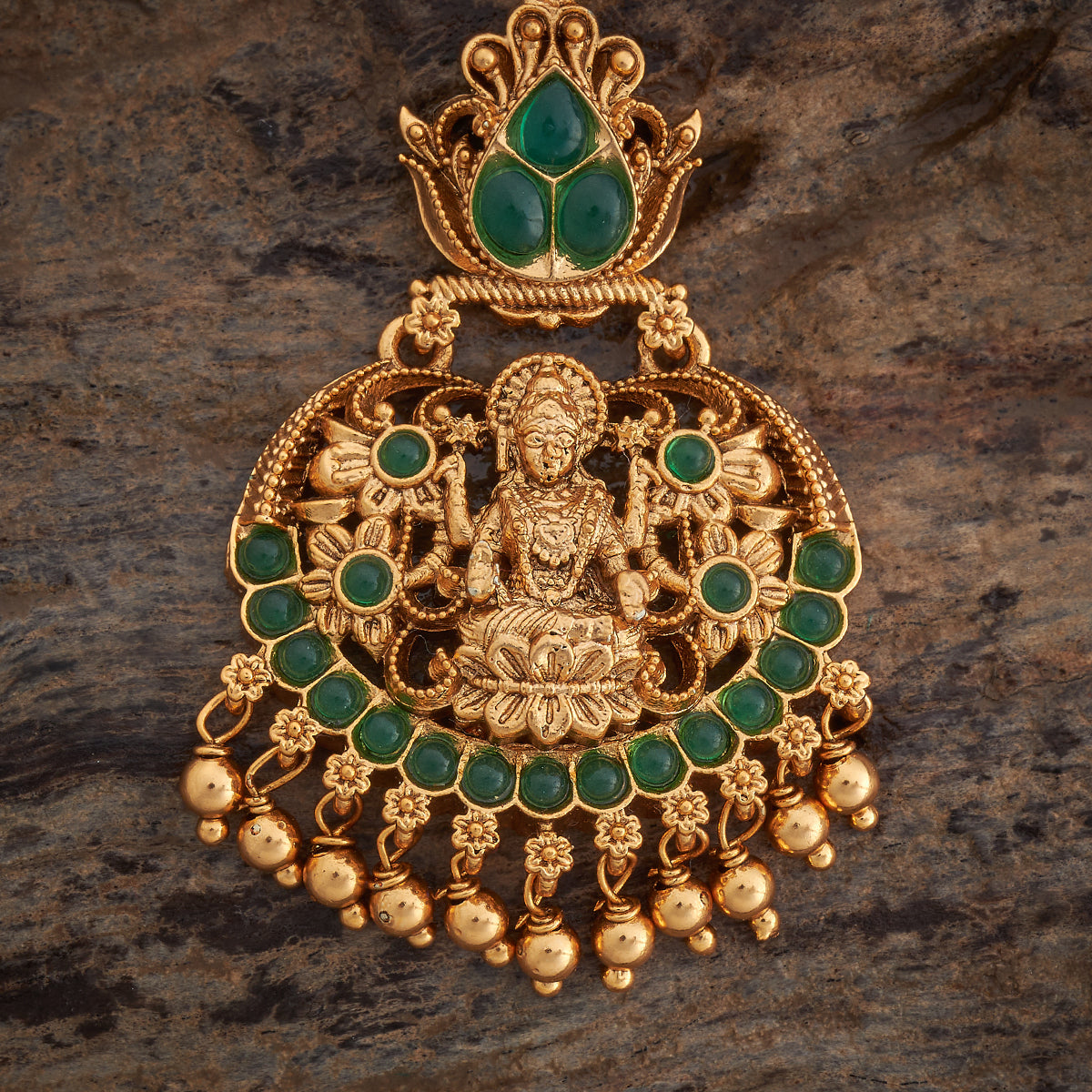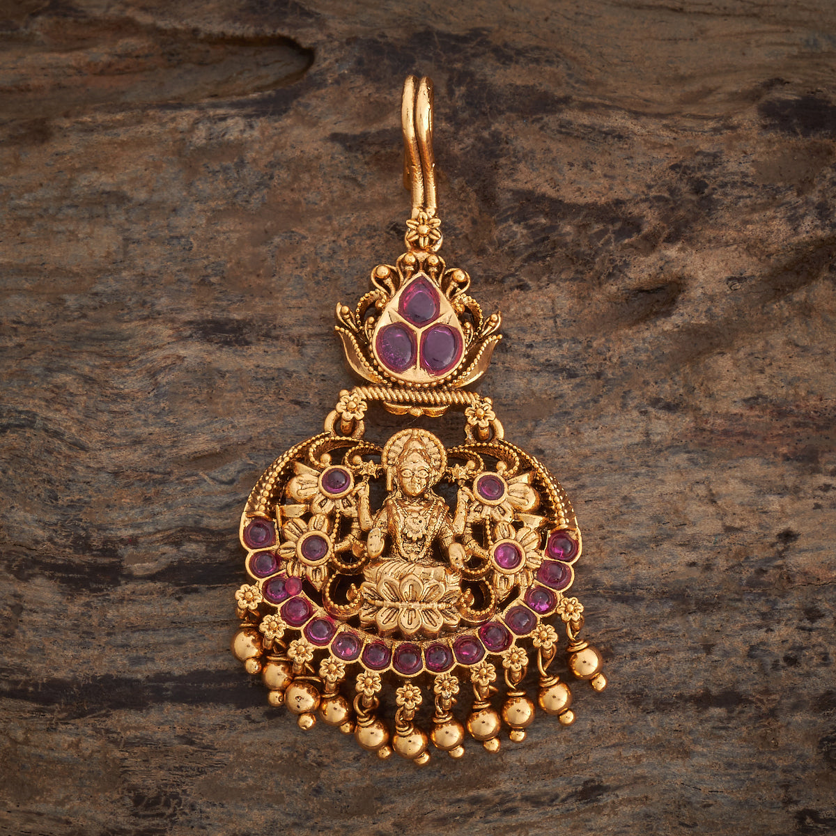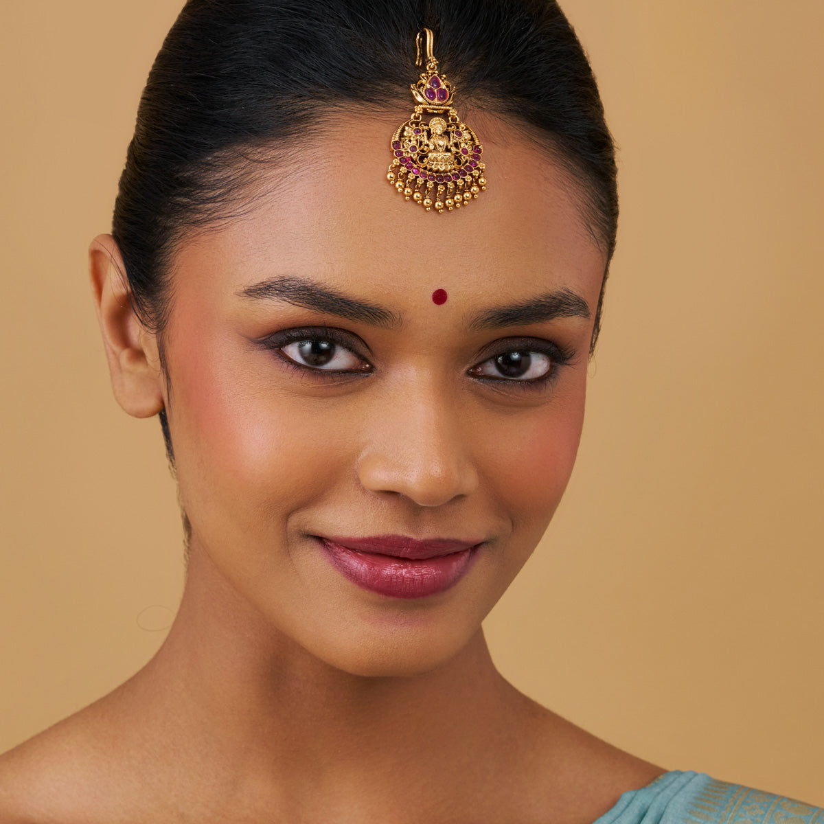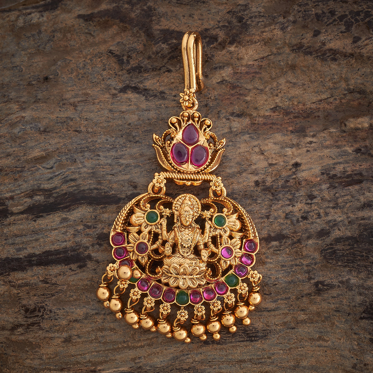Make your outfit with this antique tikka, available in multiple colour options. Choose between green, ruby and ruby-green options to make a striking style statement. Its luxe gold polish adds an alluring charm. Crafted from copper alloy, it’s embedded with shiny stones. Pair it with a traditional lehenga choli for an ethnic look.