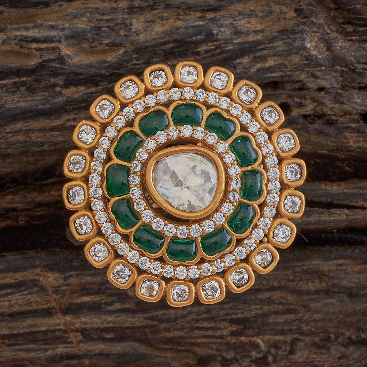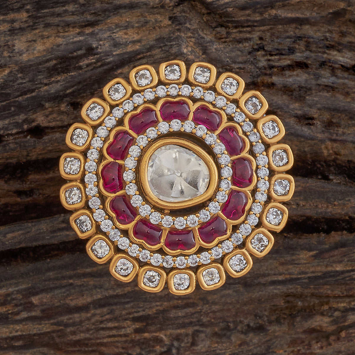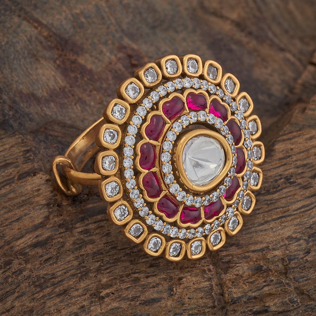 This beautiful Kundan finger ring adds instant sparkle to any outfit. The layered design featuring a white stone in the middle surrounded by coloured zircon stones adds glamour to any ensemble. You can choose between red or green stones to go with your outfit. Wear it with a traditional saree or a stylish dress to shine at special events.