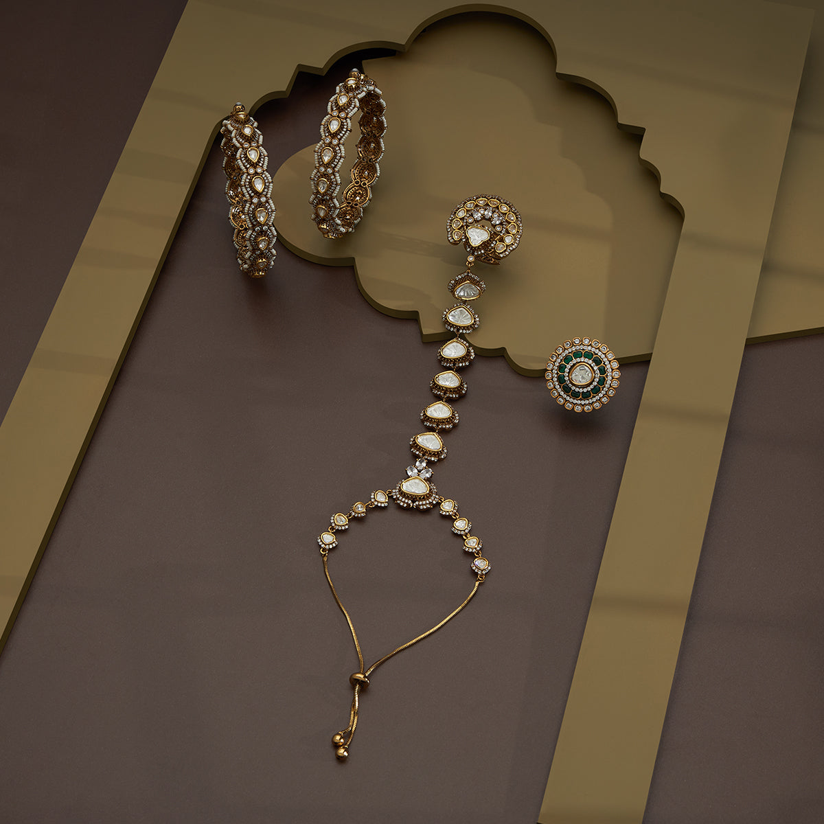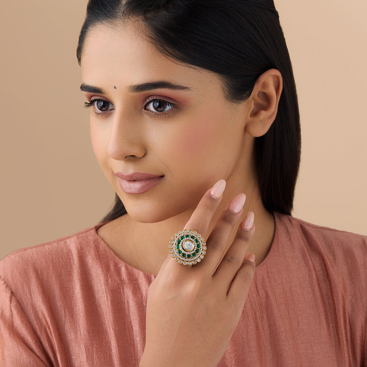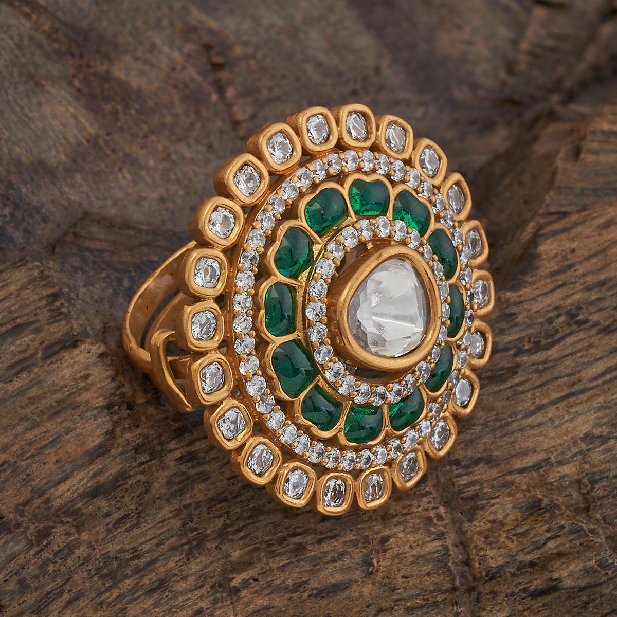 This beautiful Kundan finger ring adds instant sparkle to any outfit. The layered design featuring a white stone in the middle surrounded by coloured zircon stones adds glamour to any ensemble. You can choose between red or green stones to go with your outfit. Wear it with a traditional saree or a stylish dress to shine at special events.