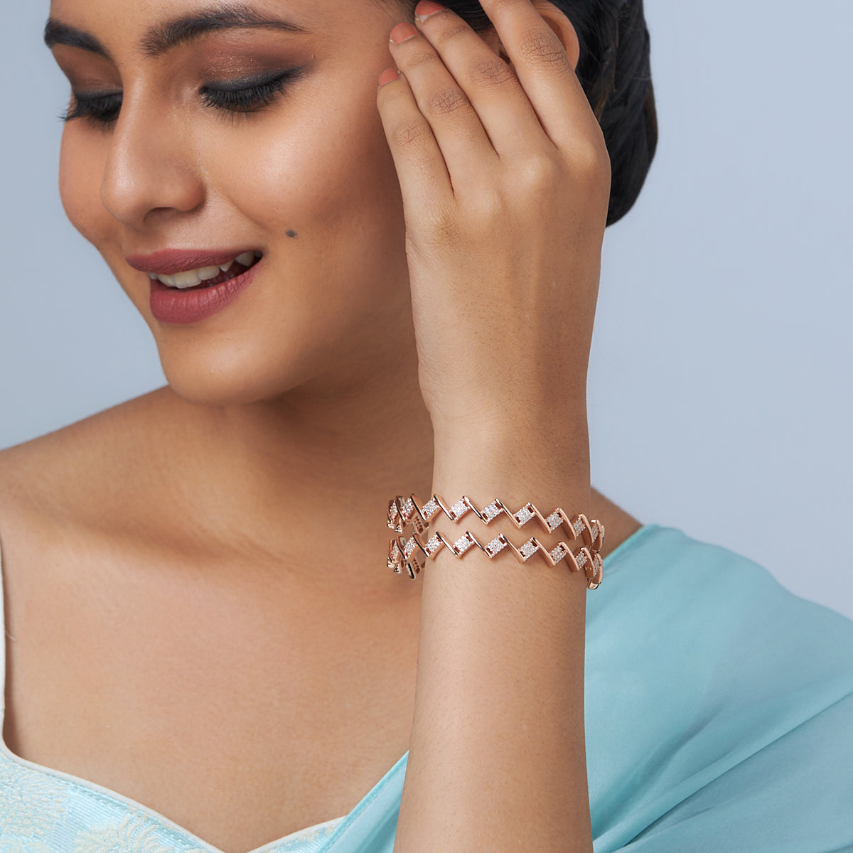 We take pride in presenting our unique and eye-catching white zircon bangle with rose gold polish. Its unique design and detailed zircon work can make everyone fall in love with it. Its lightweight and beautiful work is more than enough to make you the centre of attraction on your occasions.