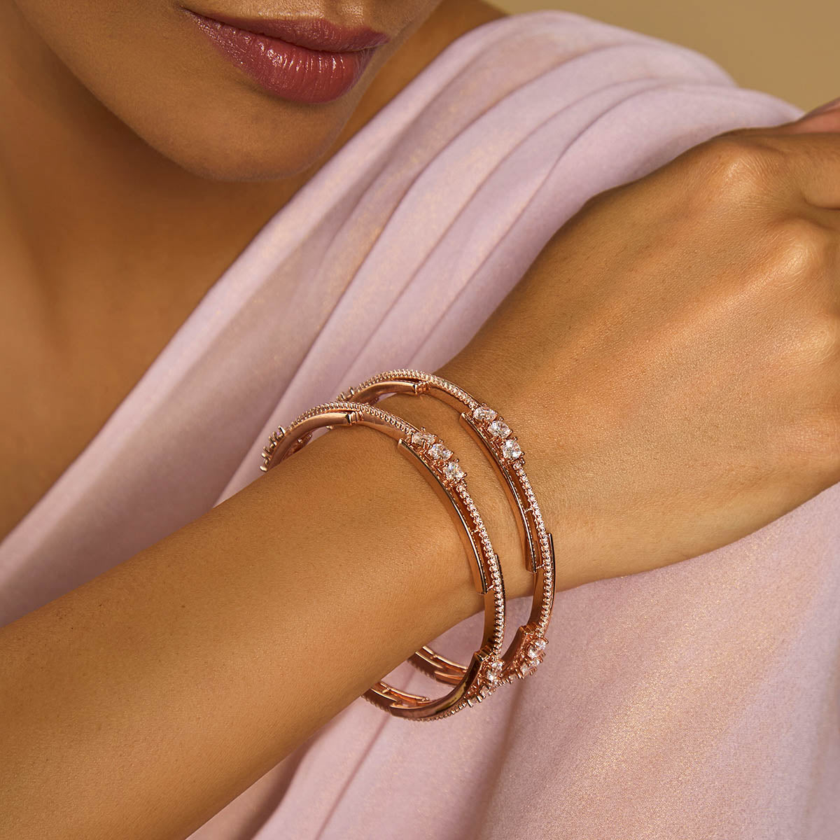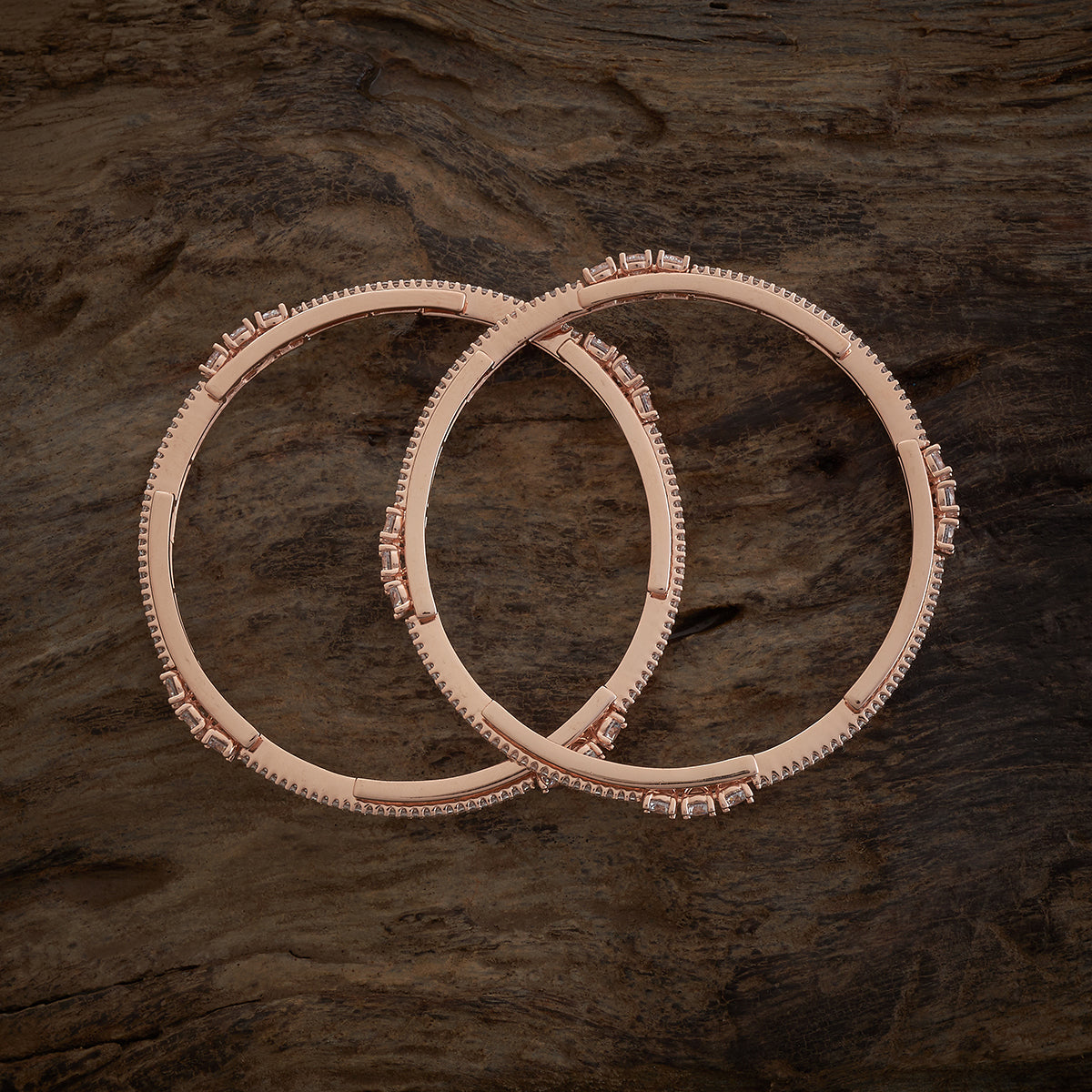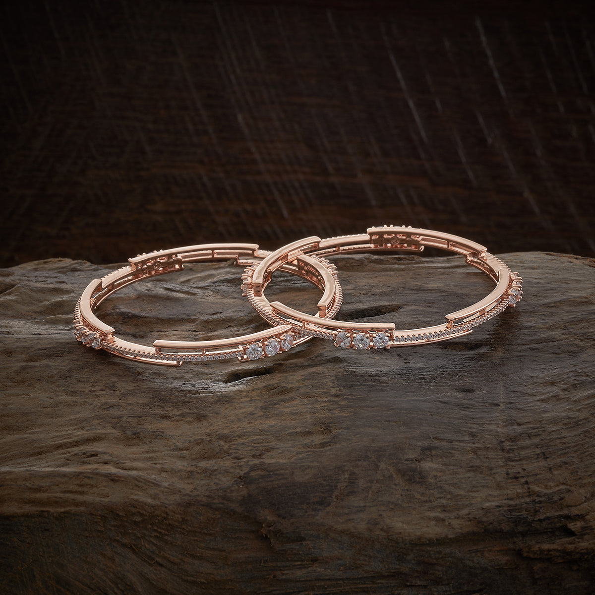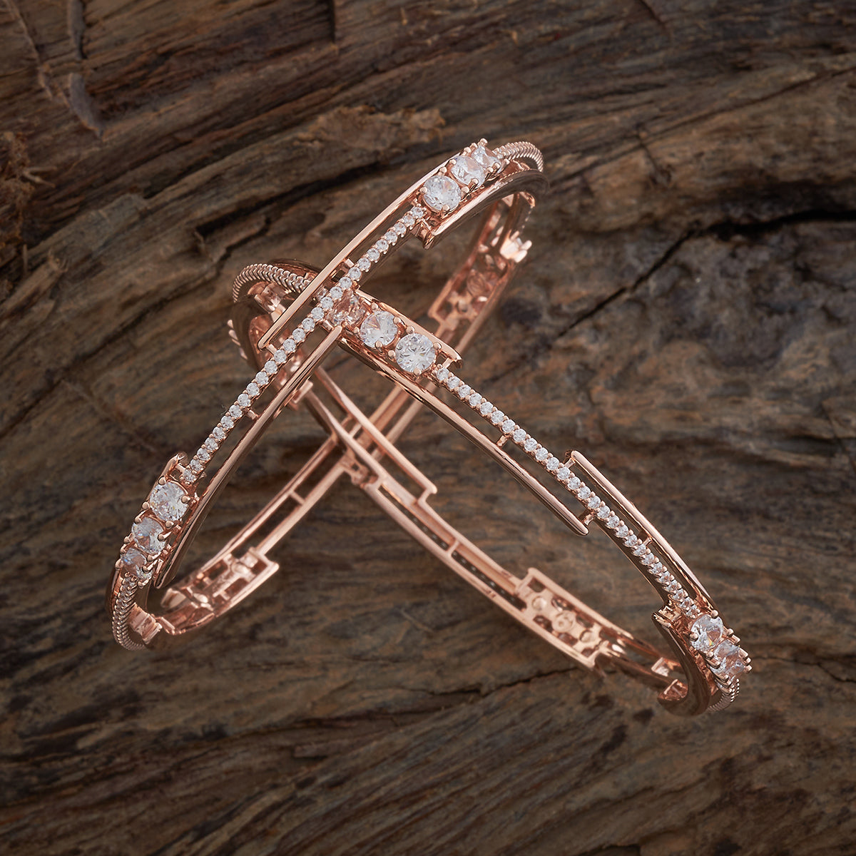 Illuminate your style with Kushal's zircon bangle, featuring radiant white zircon stones set in a luxurious rose gold-polished copper alloy. Lightweight, this elegant bangle combines timeless beauty with modern flair. Available in sizes 2-8, it ensures a perfect fit for every wrist.