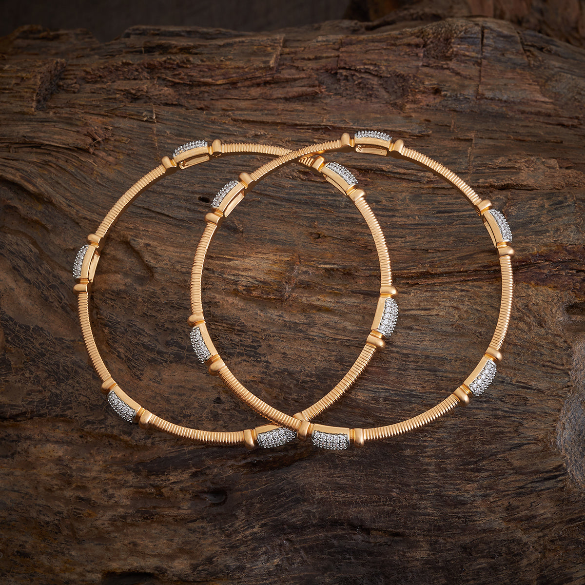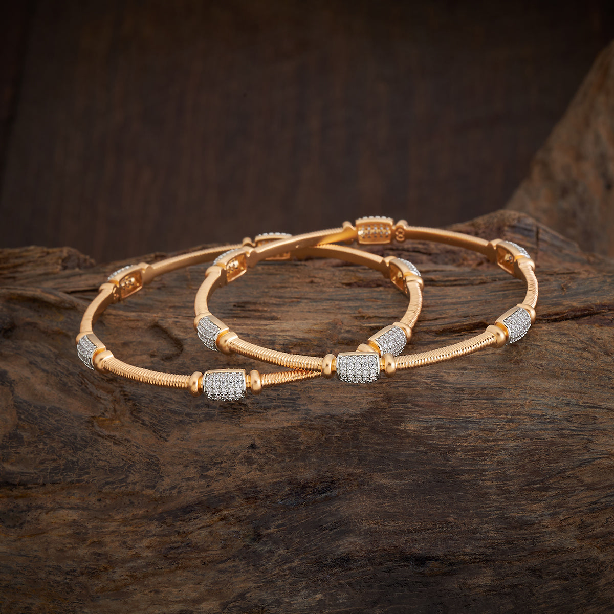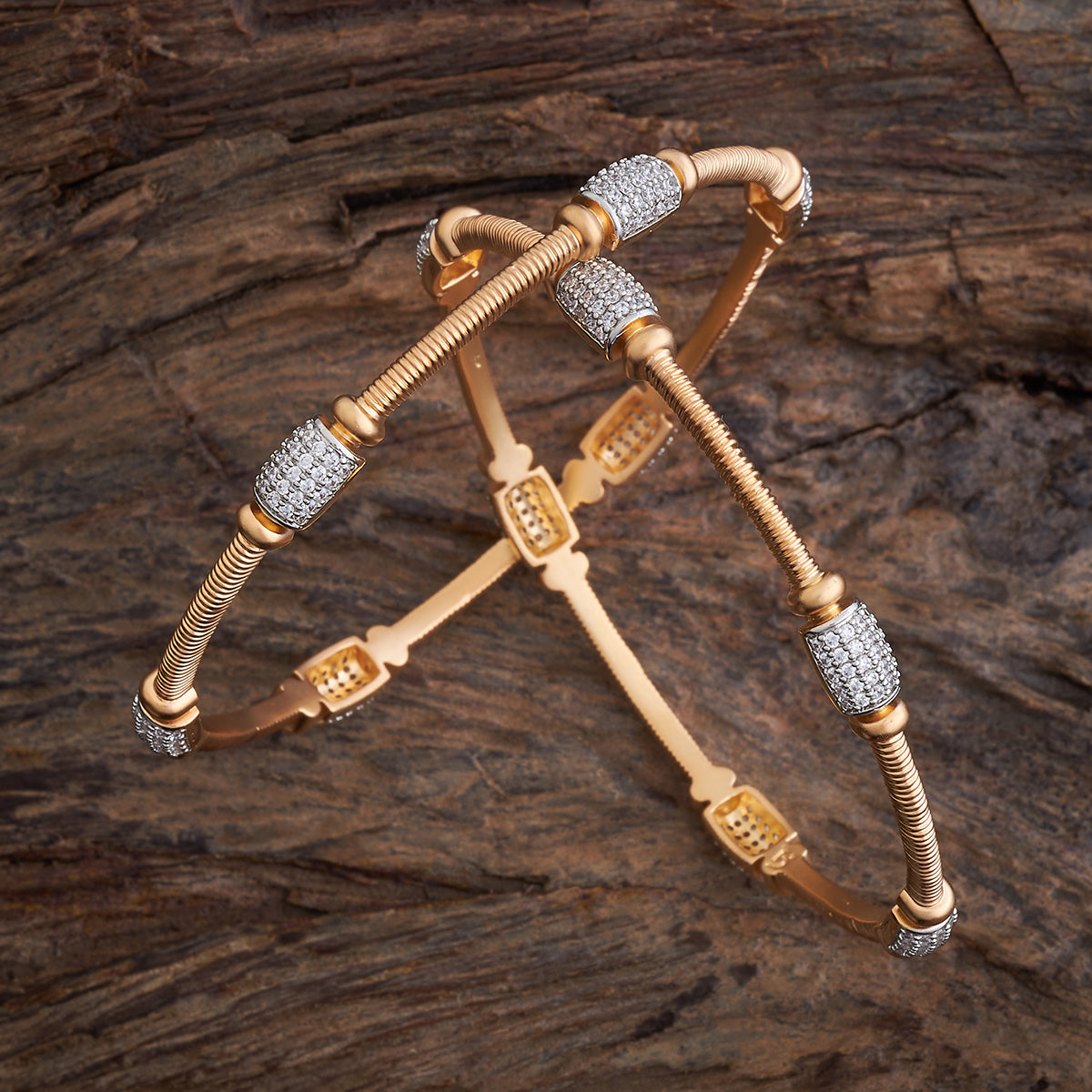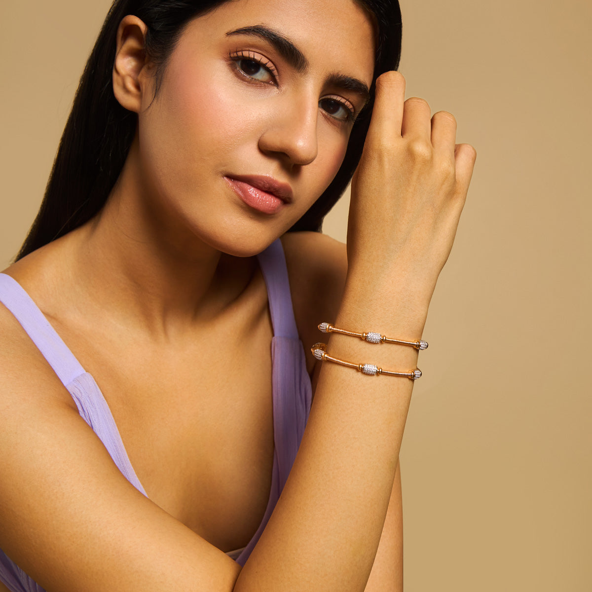 Unleash your inner diva as you make a statement with this zircon bangle. The blend of contemporary flair makes it ideal for both formal and casual events. The white stone colours and rhodium-gold polish make it one-of-a-kind. Style the pair of bangles with an Angrakha suit and strappy heels.