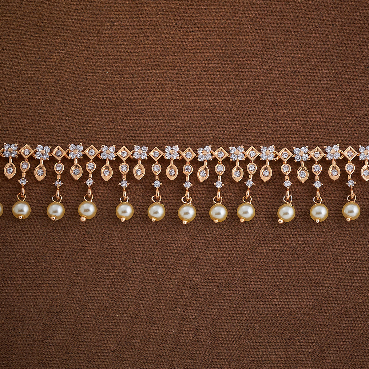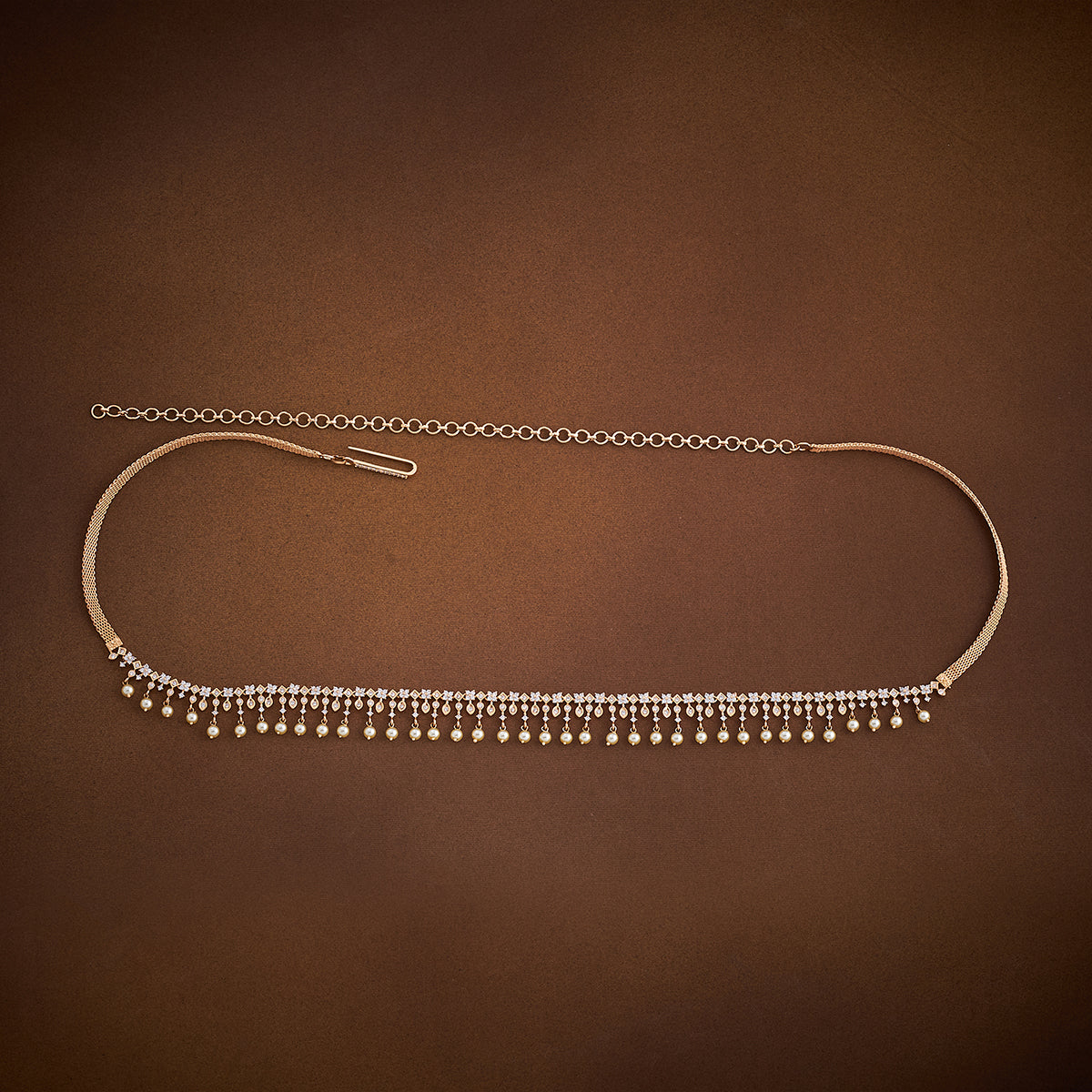 Define your waist with the mesmerising zircon belt, a statement accessory that exudes glamour and sophistication. Adorned with shimmering white zircon stones set in gold polish, this belt adds a touch of sparkle to any ensemble. Whether worn with dresses or over tunics, it accentuates your silhouette with its dazzling charm and adds a hint of luxury to your look.