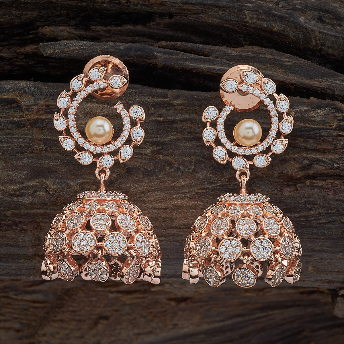 Put on these stunning zircon jhumka earrings to create a timeless look. Their bright gold and rose gold polish complement white stones, making them the perfect accessory for weddings and other festive occasions. The hanging jhumkas in an eye-catching pattern shall perfectly enhance your style.