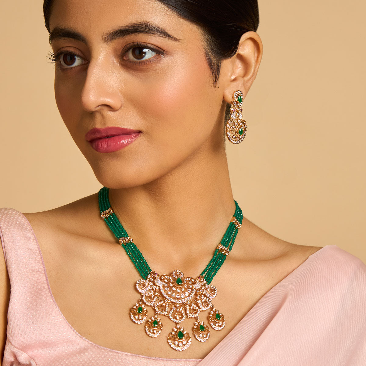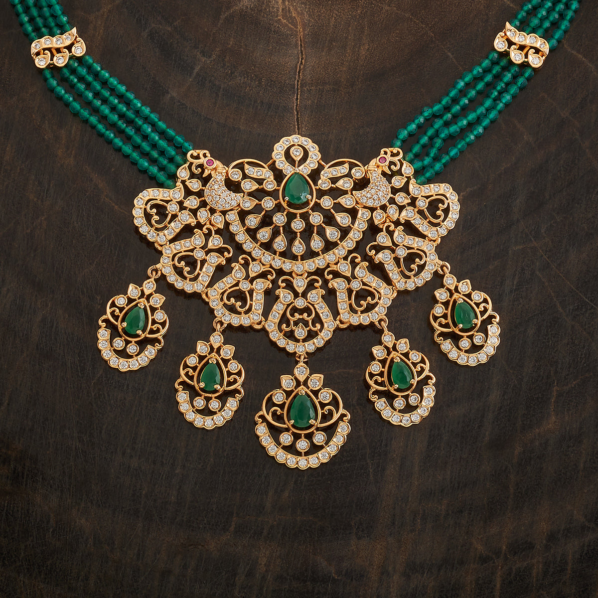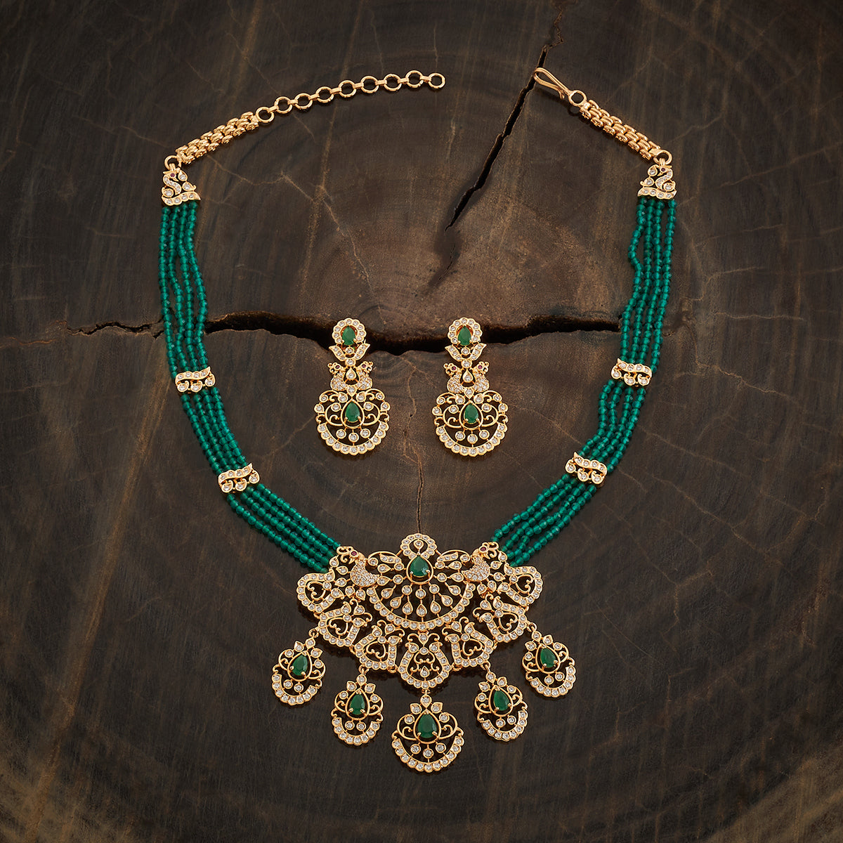 Uplift your look with this exquisite zircon haaram necklace from Kushal's Fashion Jewellery, featuring a prominent pendant adorned with ruby or green zircon stones and beads. Finished in gold polish, it pairs perfectly with Indian and Indo-Western outfits. Complete your ensemble with its matching hanging earrings for a stunning finish.