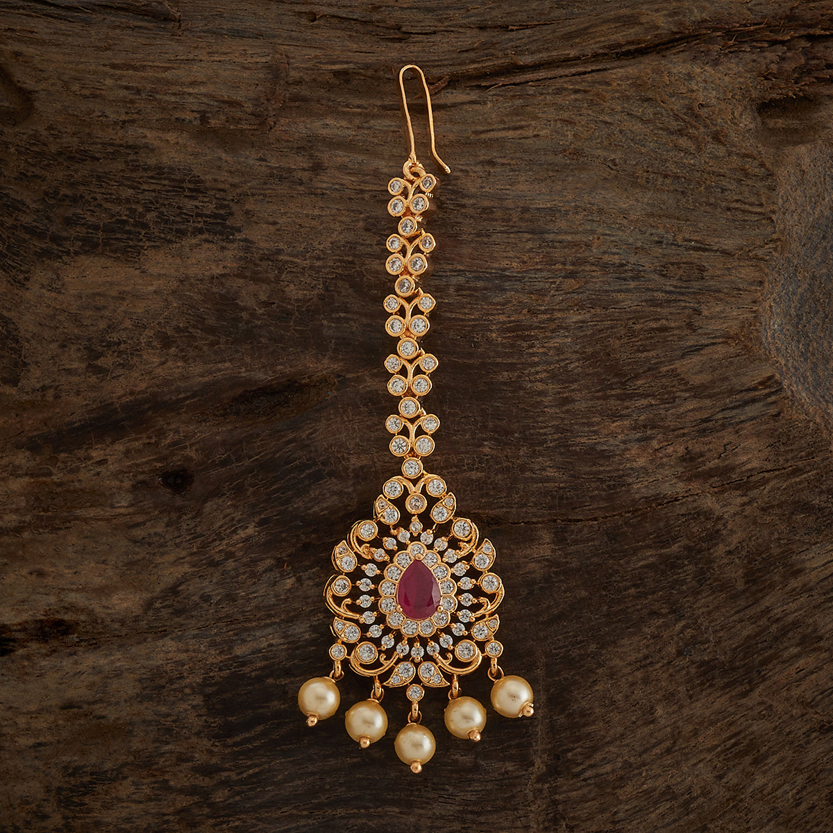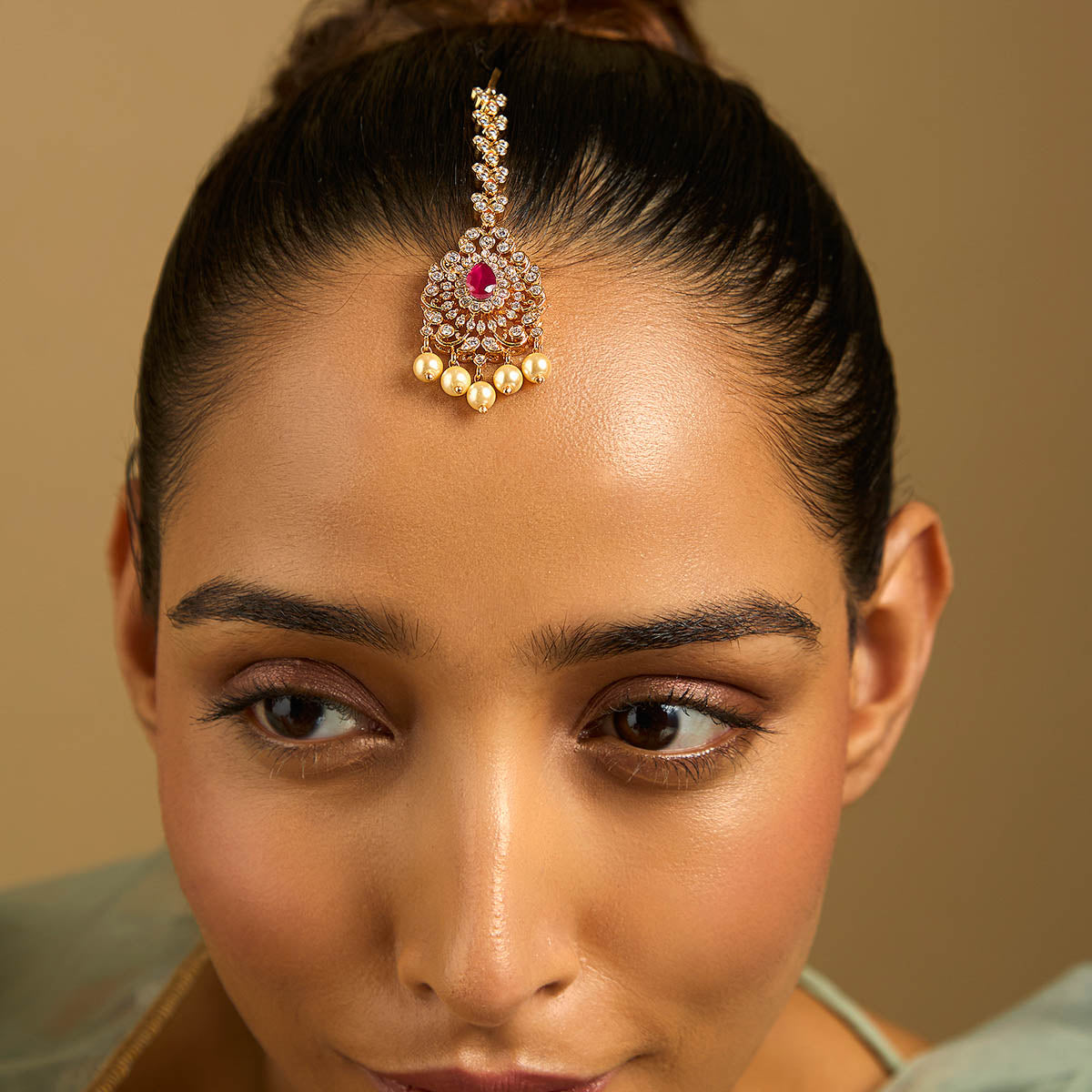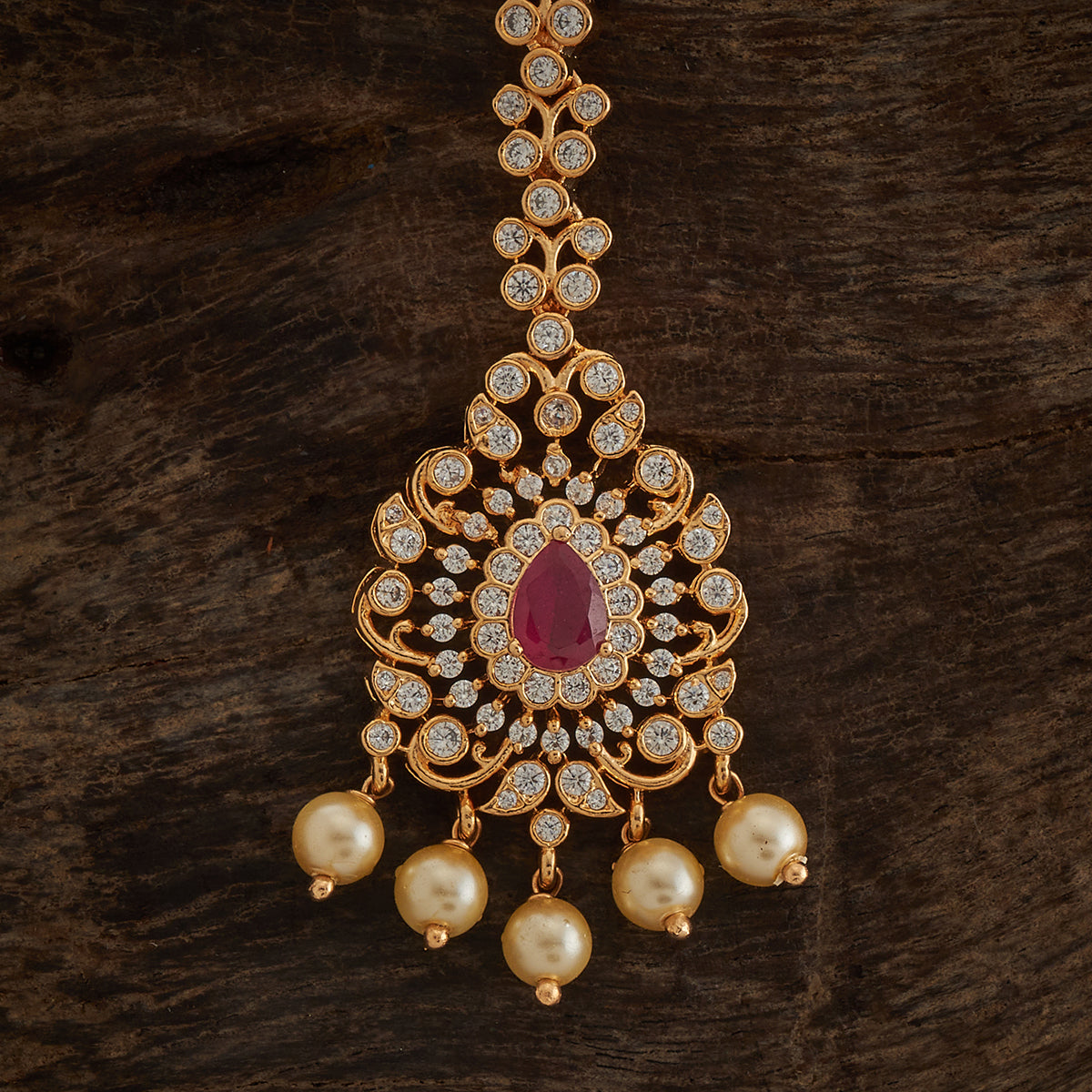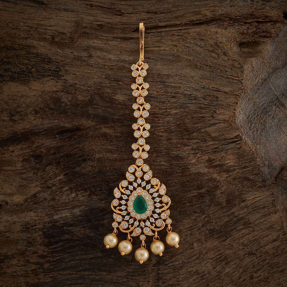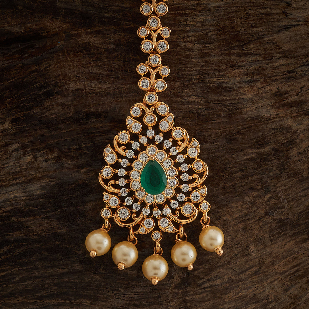 Add a regal touch to your ensemble with Kushal's zircon tikka, featuring a single emerald or ruby stone surrounded by zircon stones and set in luxurious gold finish. The hanging pearls adds a modern twist, making it perfect for weddings and special occasions. Elevate your look with this exquisite piece this social season!