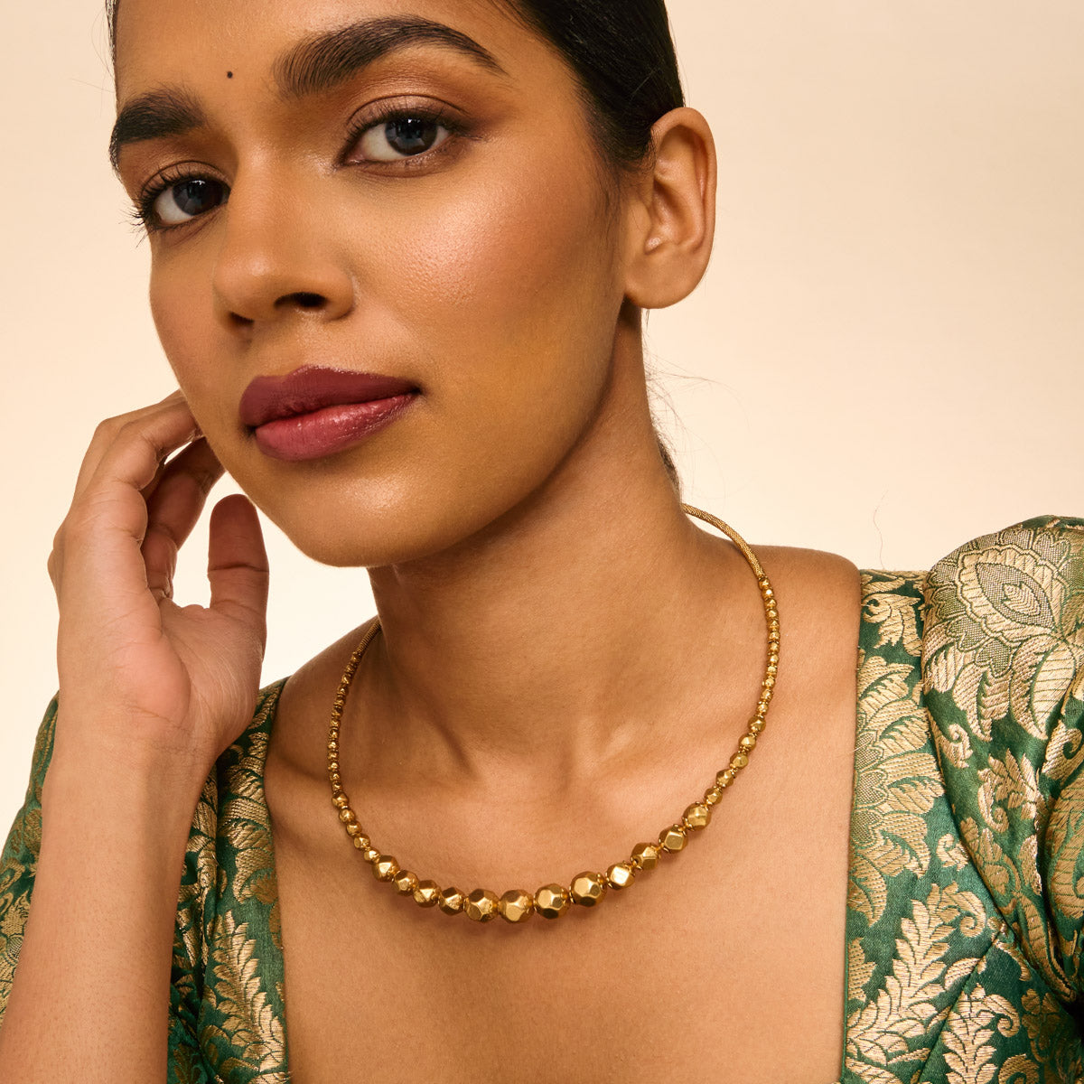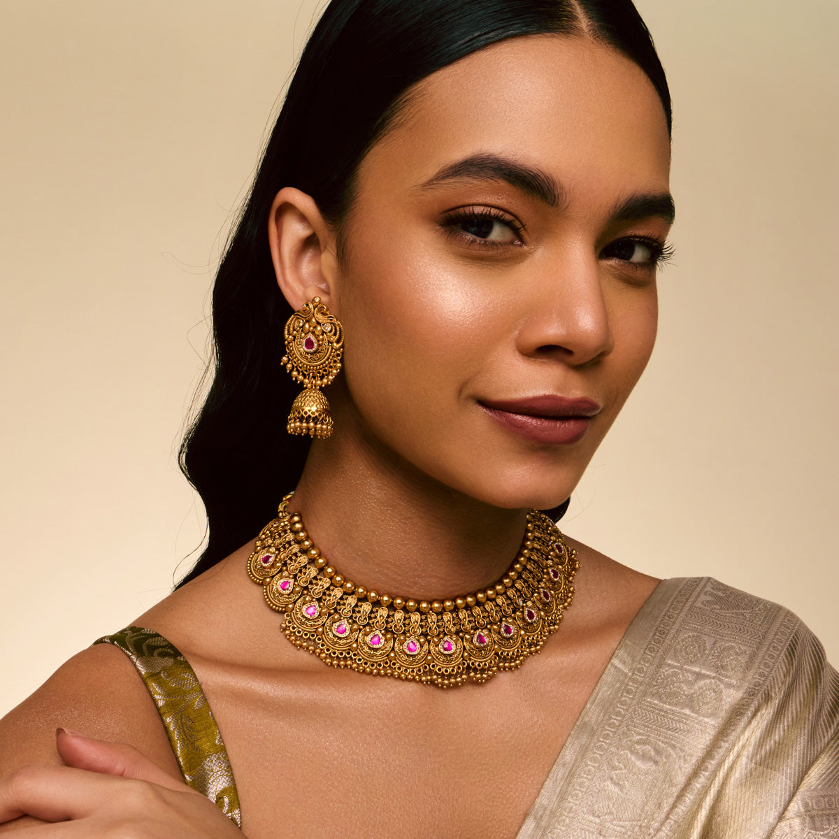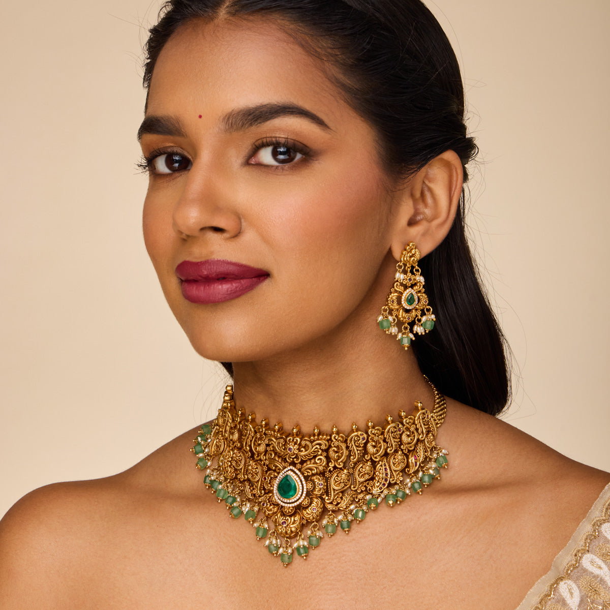 Traditional Look: Pair an Indian choker necklace with a saree or lehenga for an elegant and timeless look. Complement your choker with matching earrings and a Mangalsutra for a balanced and cohesive look.