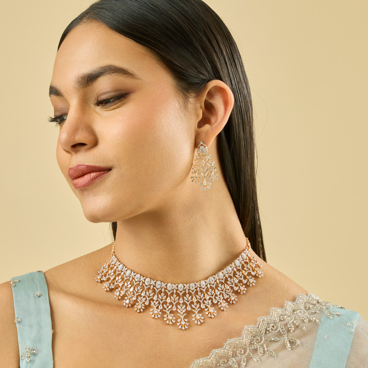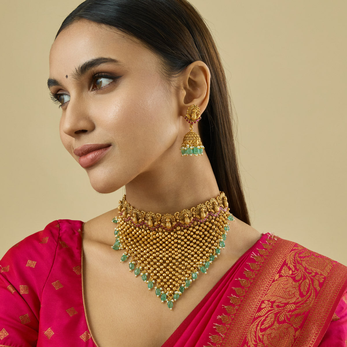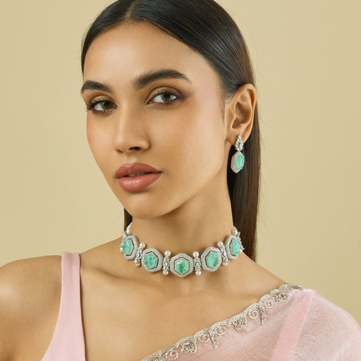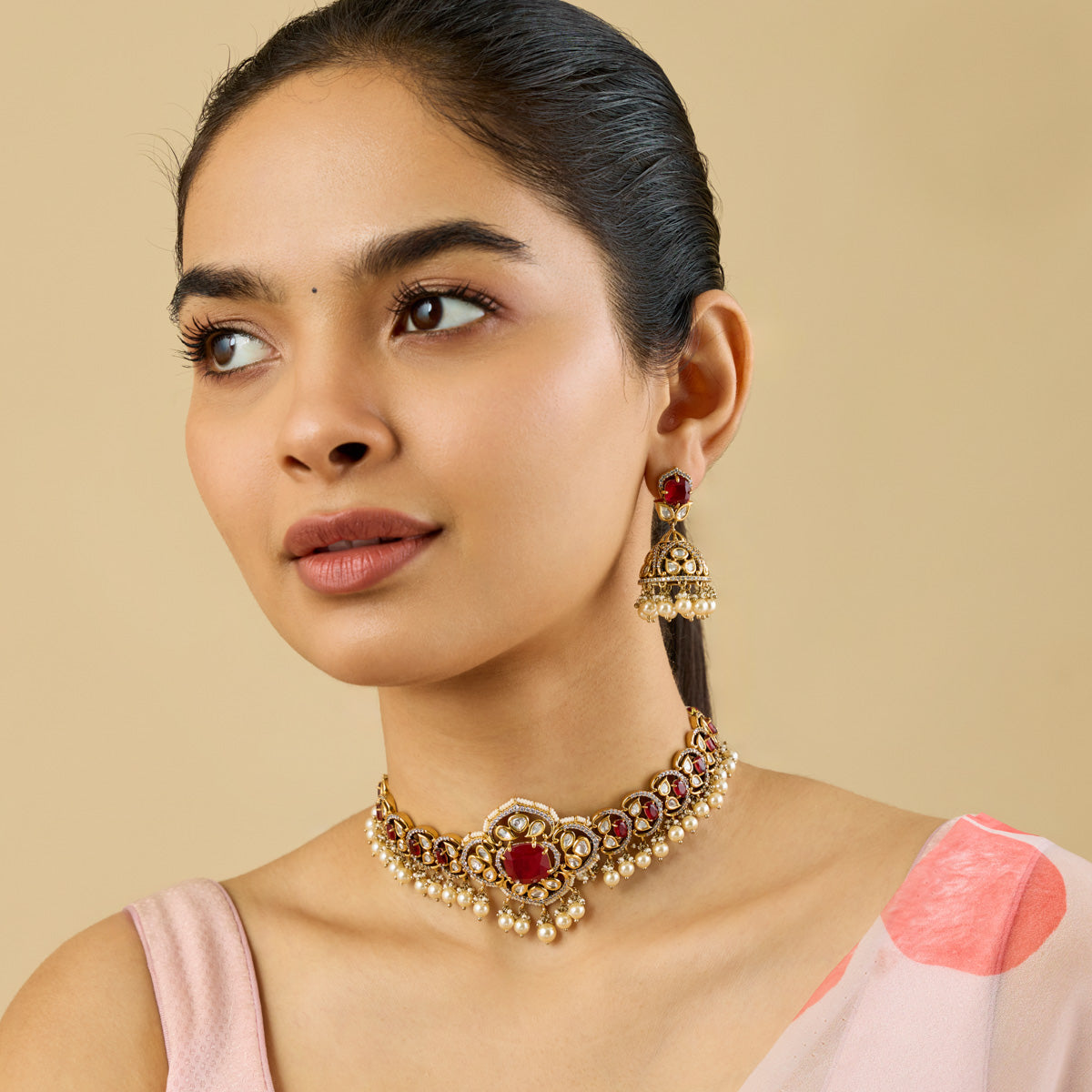 Traditional Look: Pair an Indian choker necklace with a saree or lehenga for an elegant and timeless look. Complement your choker with matching earrings and a Mangalsutra for a balanced and cohesive look.