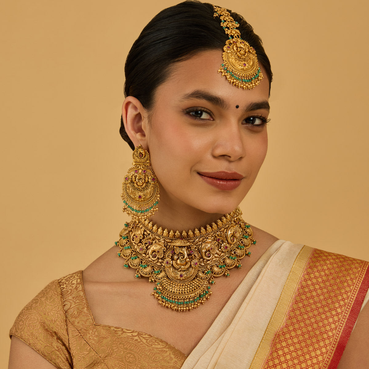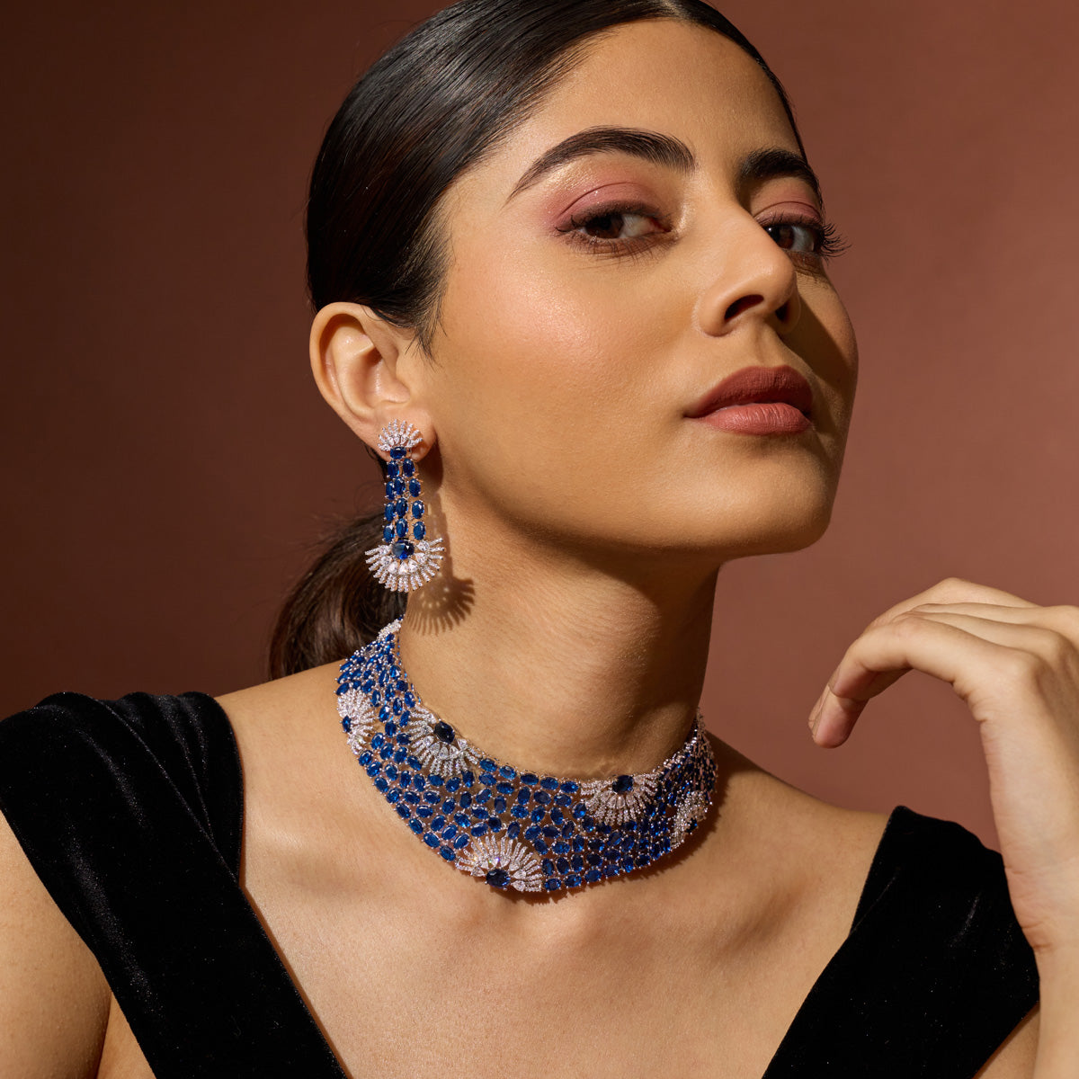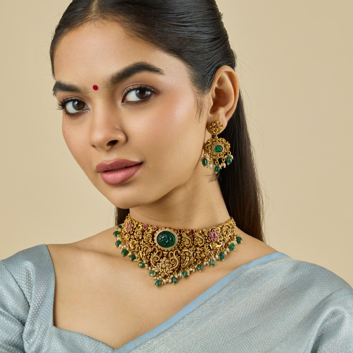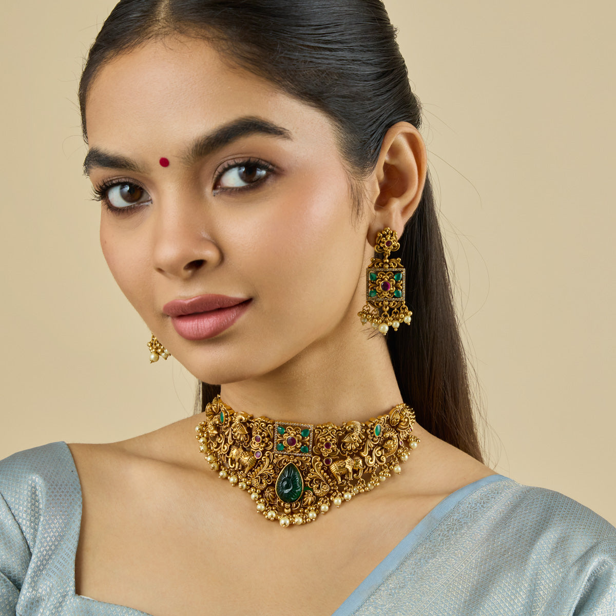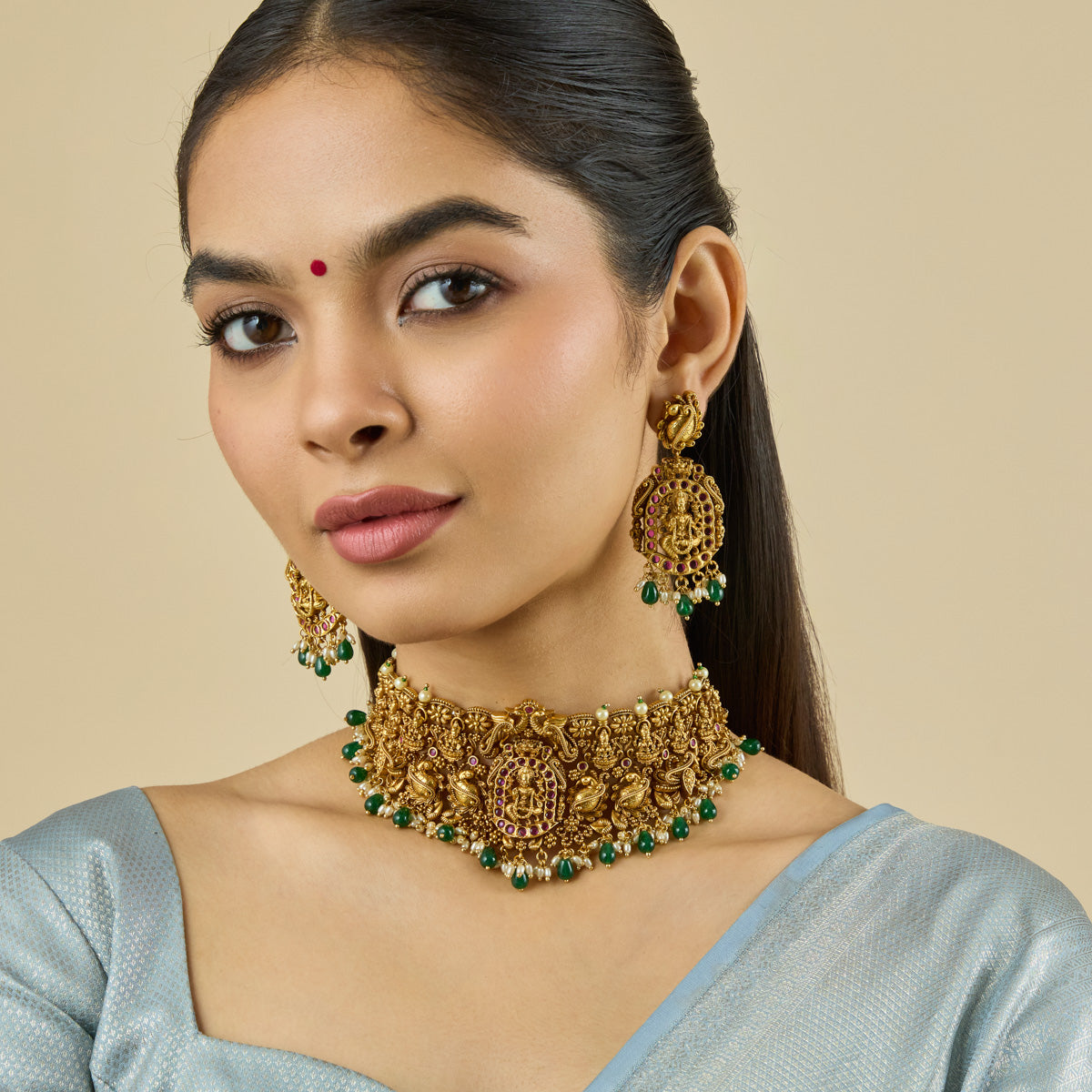 Traditional Look: Pair an Indian choker necklace with a saree or lehenga for an elegant and timeless look. Complement your choker with matching earrings and a Mangalsutra for a balanced and cohesive look.