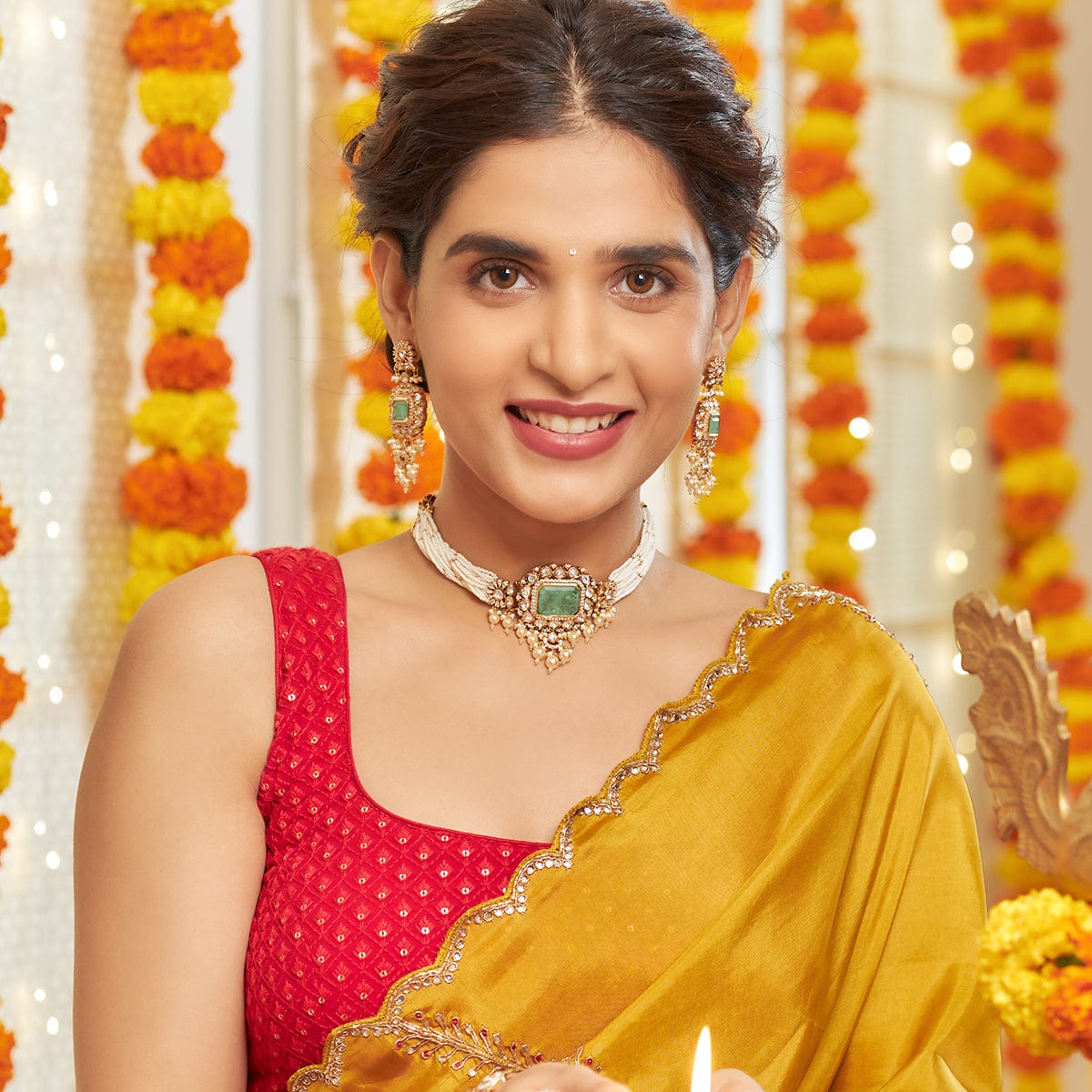 Traditional Look: Pair an Indian choker necklace with a saree or lehenga for an elegant and timeless look. Complement your choker with matching earrings and a Mangalsutra for a balanced and cohesive look.