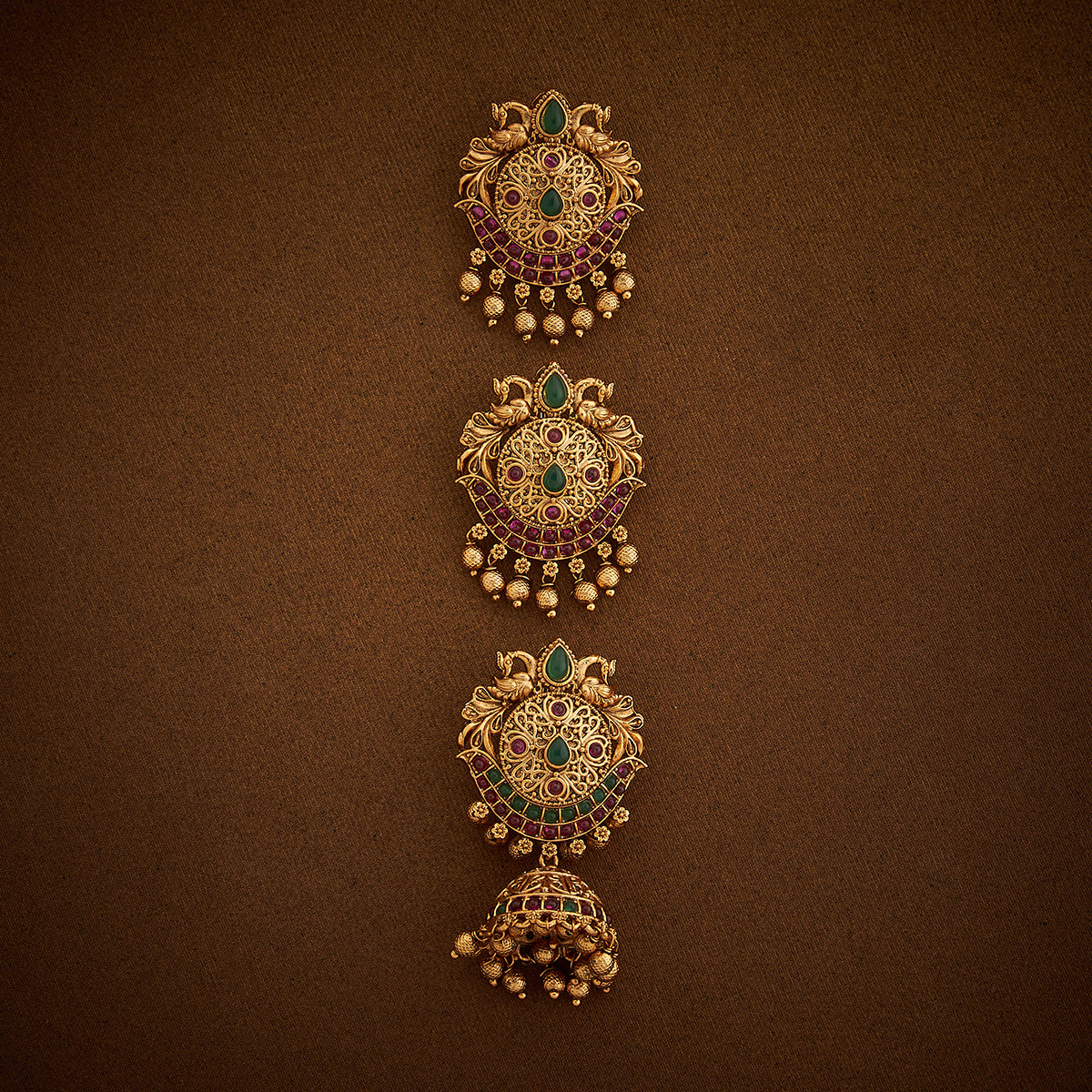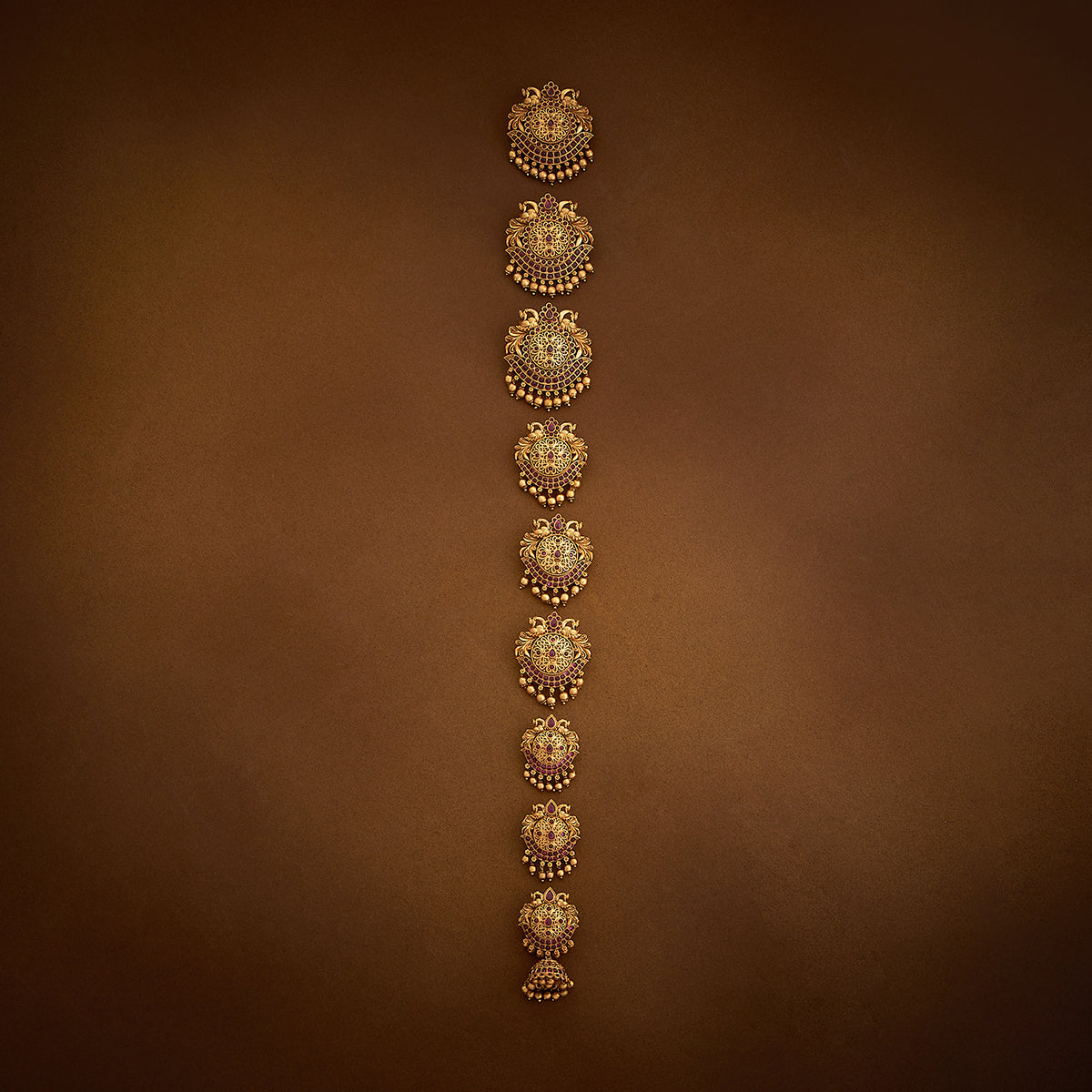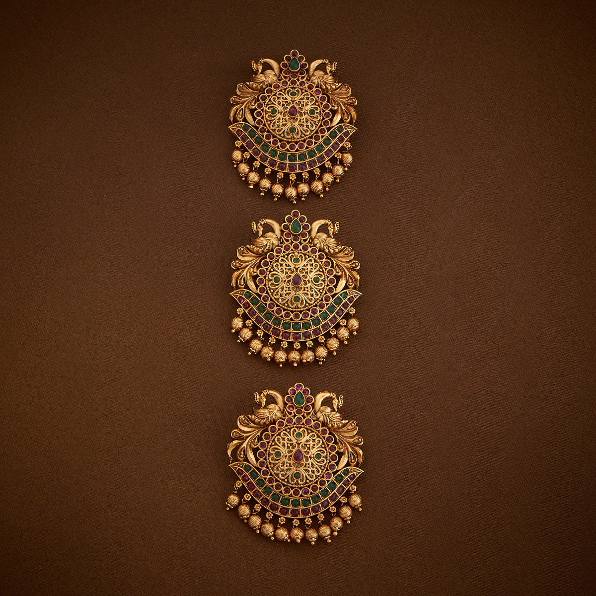 Elevate your style with Kushal's antique choti! Antique choti featuring vibrant red or a mix of red and green synthetic stones and a golden polish, it has elegance and charm. Crafted from long-lasting copper alloy, this set of 9 individual pieces adds a touch of glamour to traditional attire. Stand out and shine at any occasion with this stunning accessory!