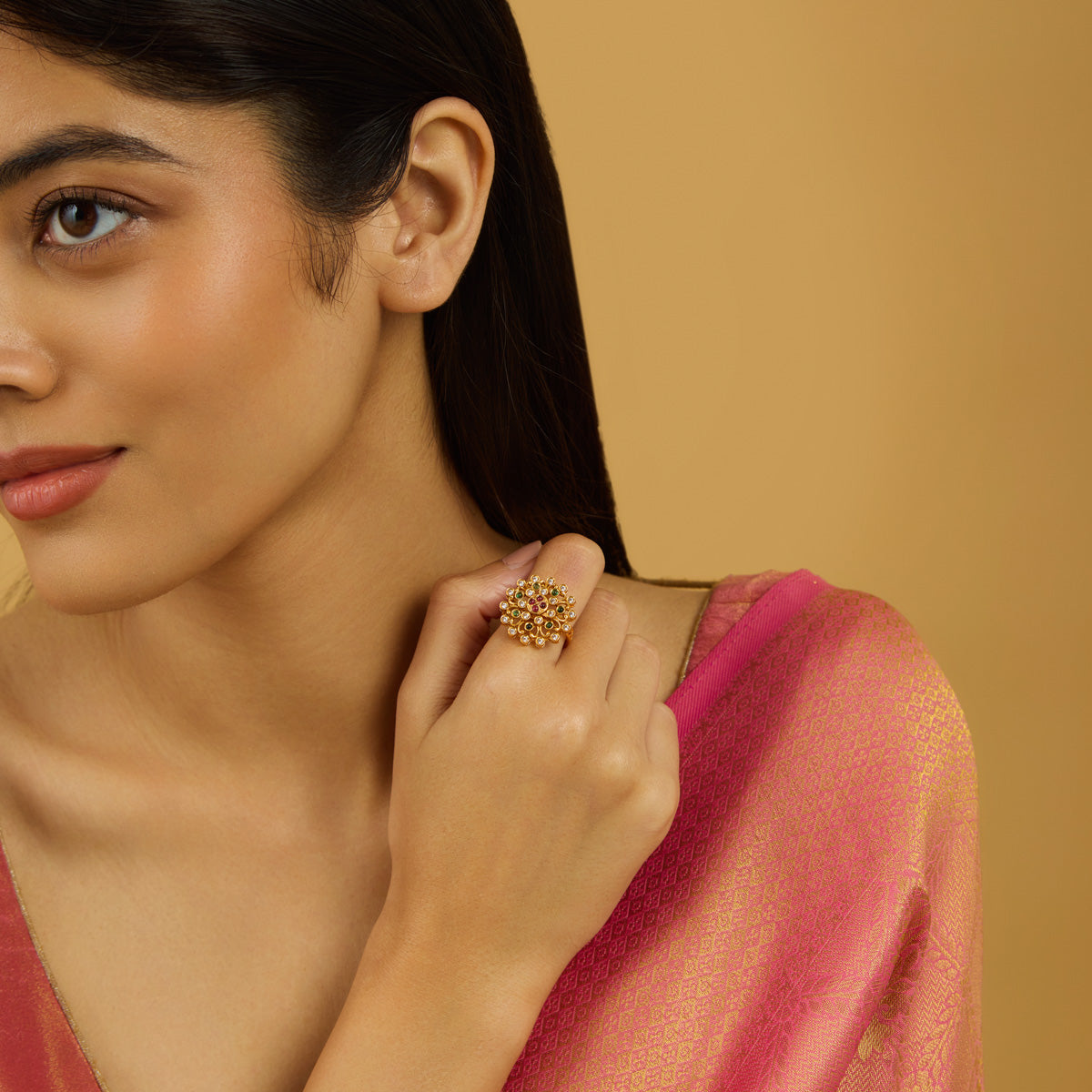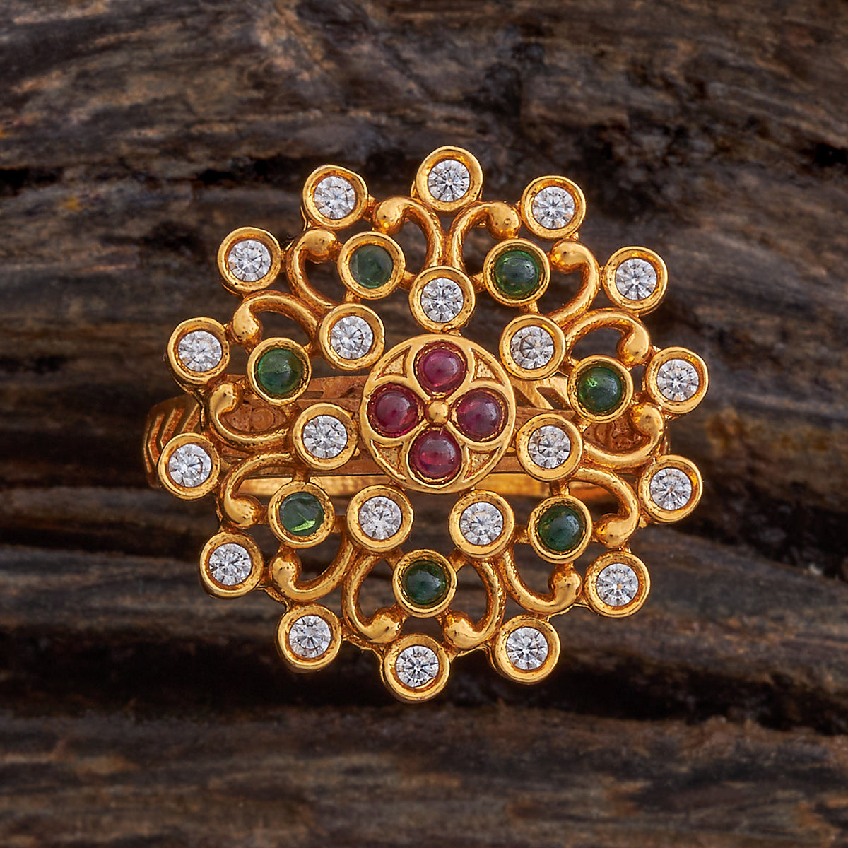 Glam up your look with a vintage charm with Kushal's antique finger ring. Featuring a striking mix of ruby-green or white stones, this gold-polished ring combines synthetic stones and zircons for a unique, eye-catching design. Adjustable for the perfect fit, it’s the ideal accessory to elevate your everyday look or complete your evening ensemble.