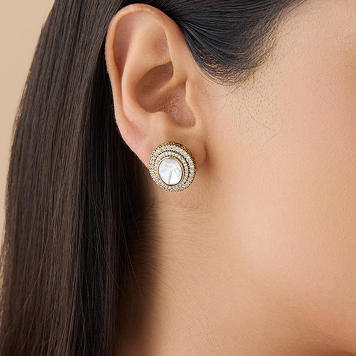Style Kushal's kundan earrings with your favourite saree and become the star of the show wherever you go. Crafted with precision from copper alloy, these Victorian-polished earrings feature white kundan stones that add effortless glam to your everyday ensemble. These stud earrings are secured with a push-back closure to ensure comfort all day long.