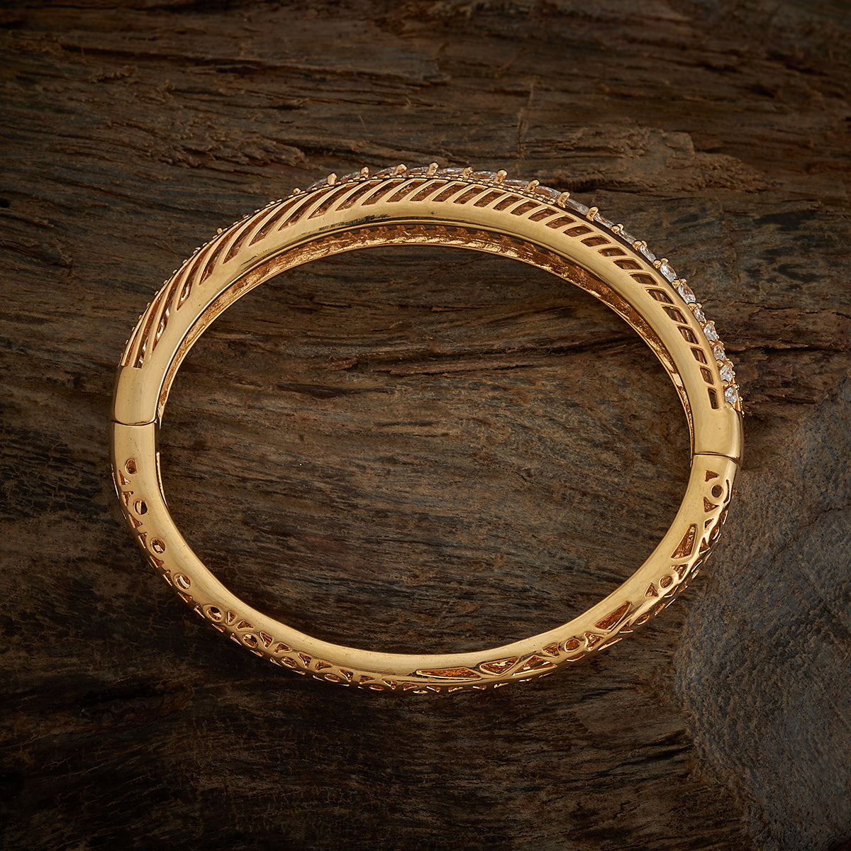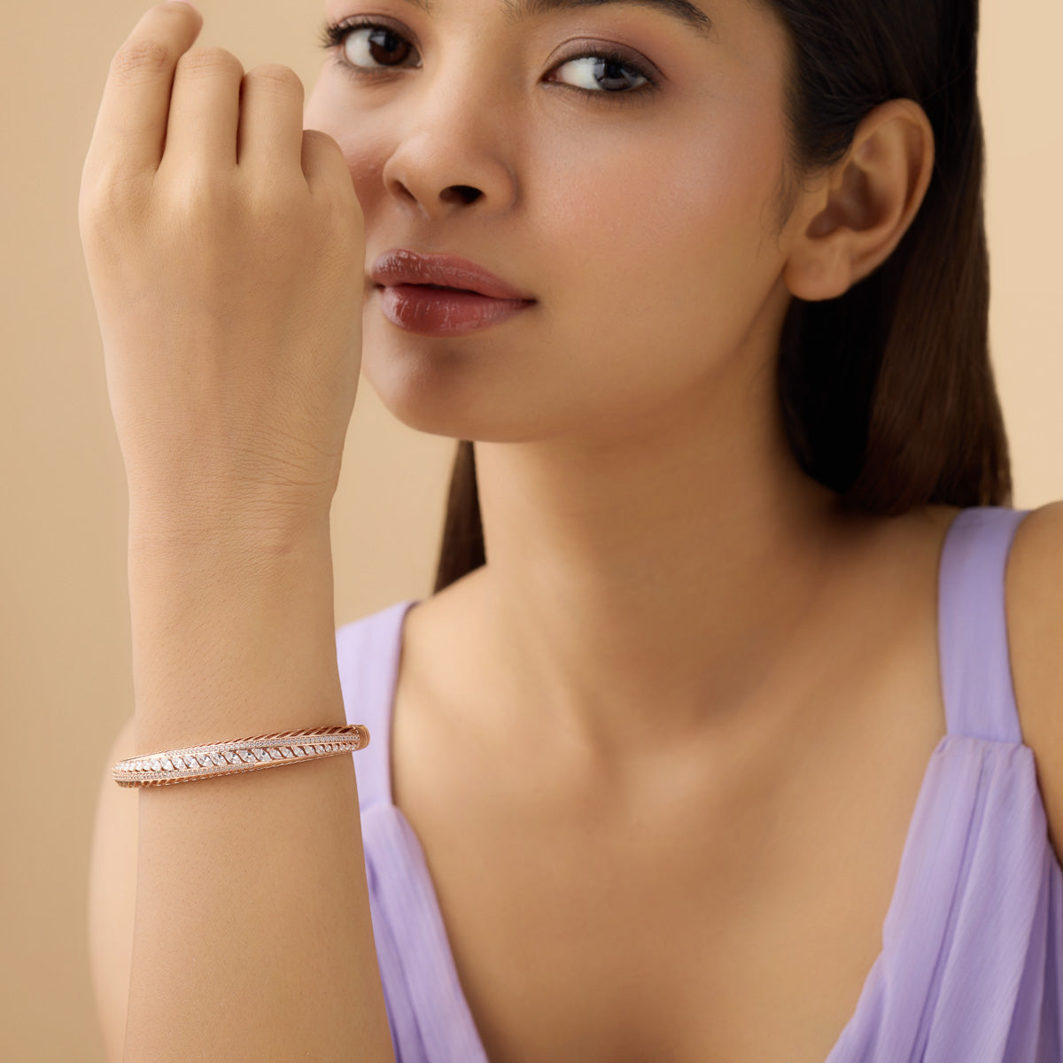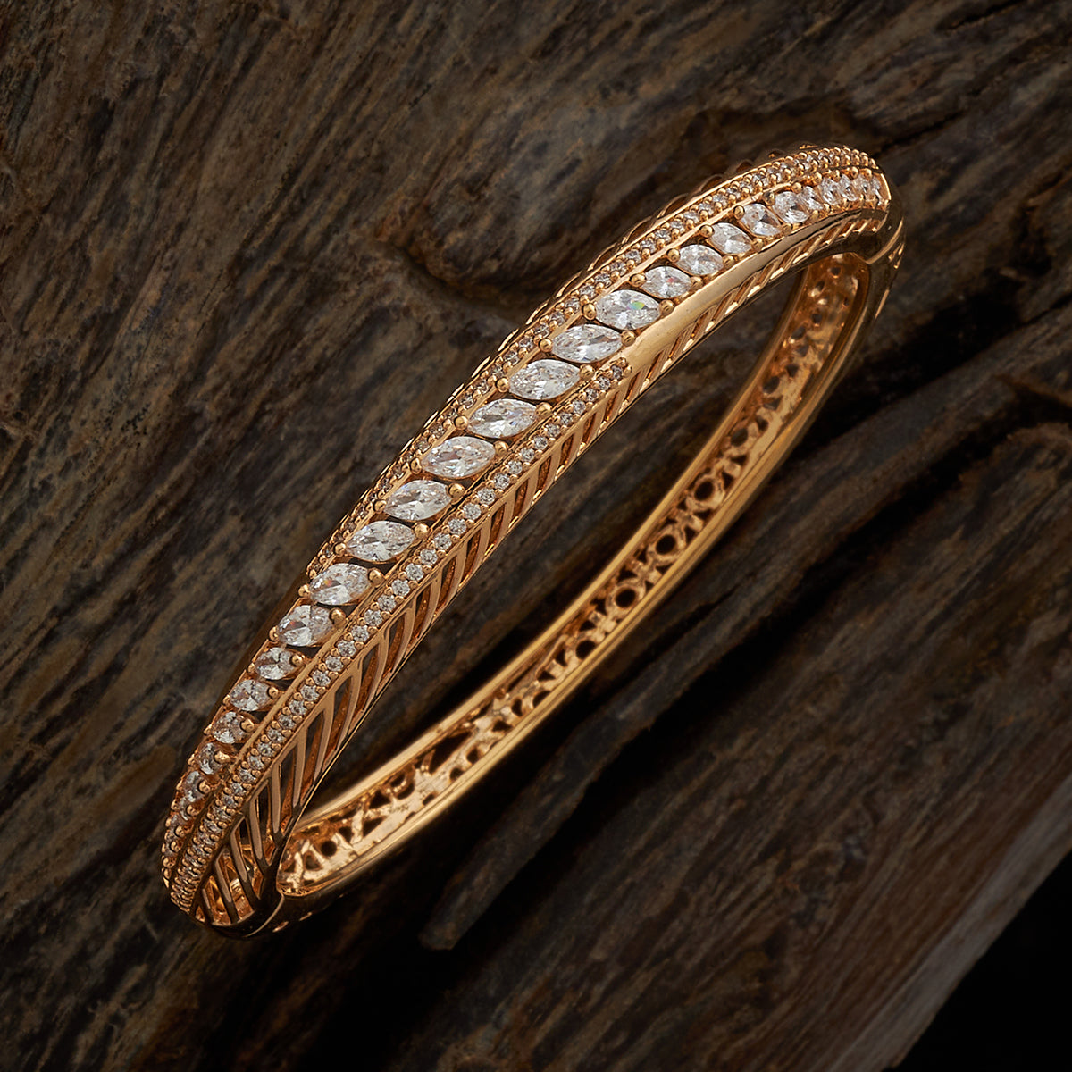 Kushal's stunning zircon kada will up your wrist game! The zircon kada is personalised with a gold, white or rose gold polish. Crafted with glittering zircon stones on a copper alloy base, this bangle lends elegance and sophistication to any outfit. It is ideal for adding sparkle to your everyday appearance or making a statement at big occasions.