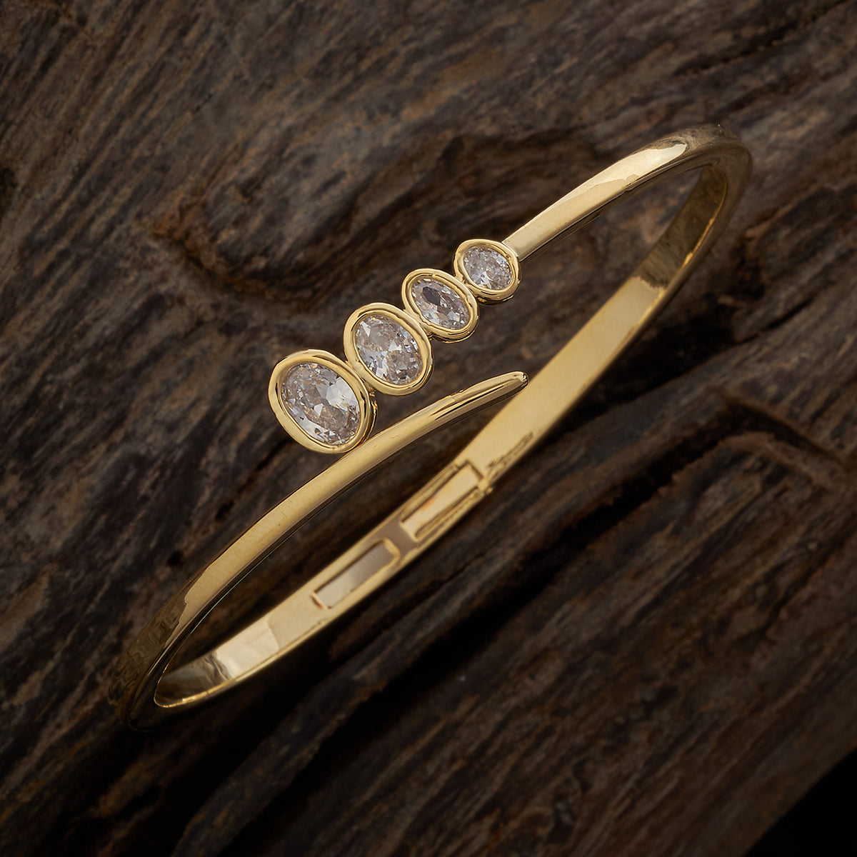 Kushal's zircon kada promises to be a treasured piece that brings joy and elegance to every outfit. Crafted from copper alloy and styled with white zircons, this kada is available in three radiant finishes - gold, rhodium and rose gold, allowing you to choose the perfect hue to match your style.