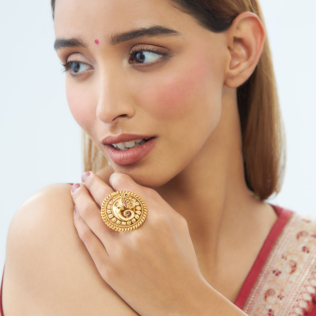 It is time to bedazzle others with our unique antique finger rings. Our Lord Ganesh-embossed design finger ring offers a blessed outlook. The copper alloy ensures the sturdiness of the product. The synthetic stones add an aesthetic charm to the rings. Choose our ruby coloured rings for your exceptional look.