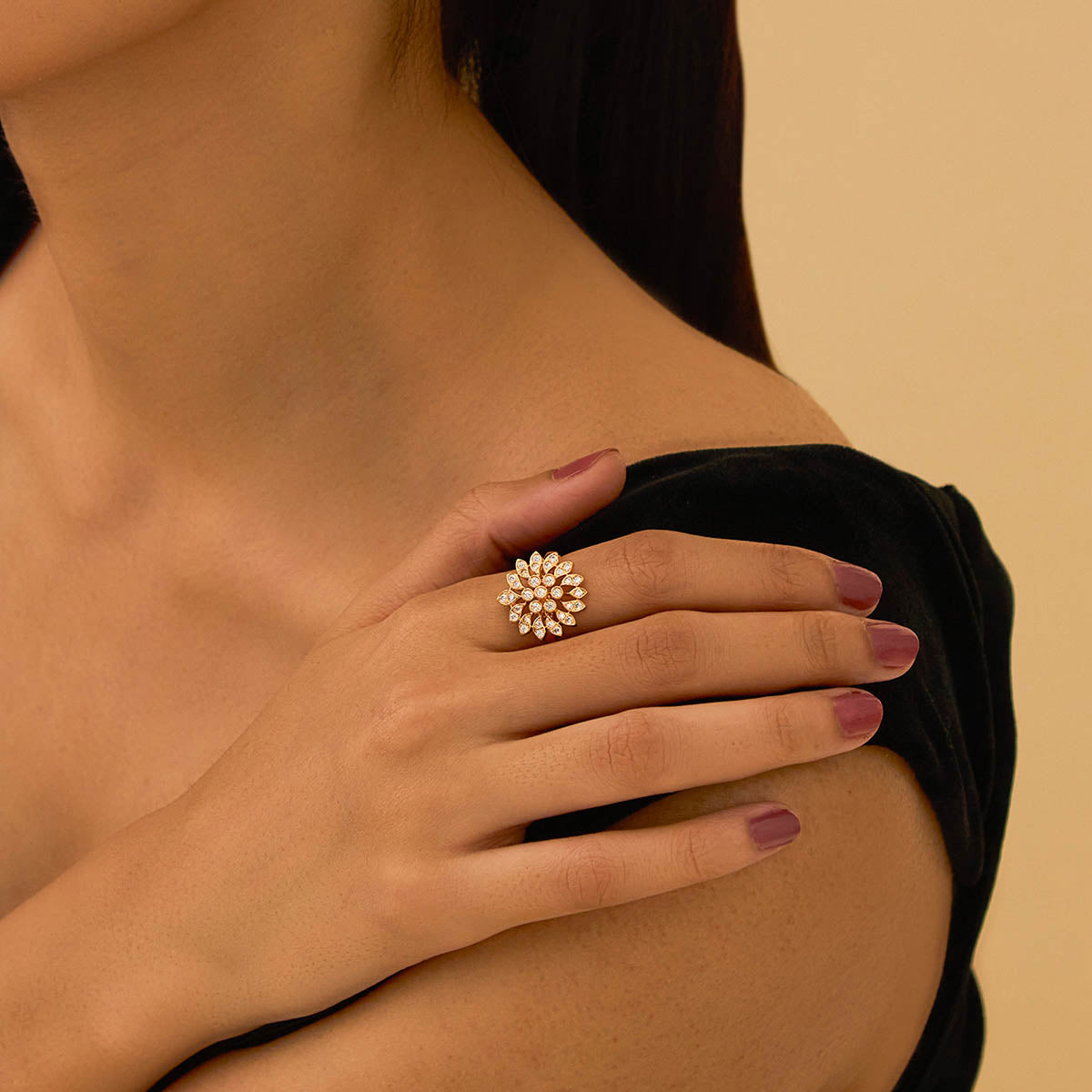 Radiate sophistication with our Gorgeous Gold Polished White Zircon Finger Ring. Meticulously crafted, this ring combines opulent gold polish with sparkling white zircon, exuding timeless elegance and luxury.
