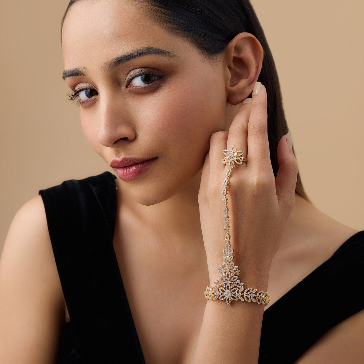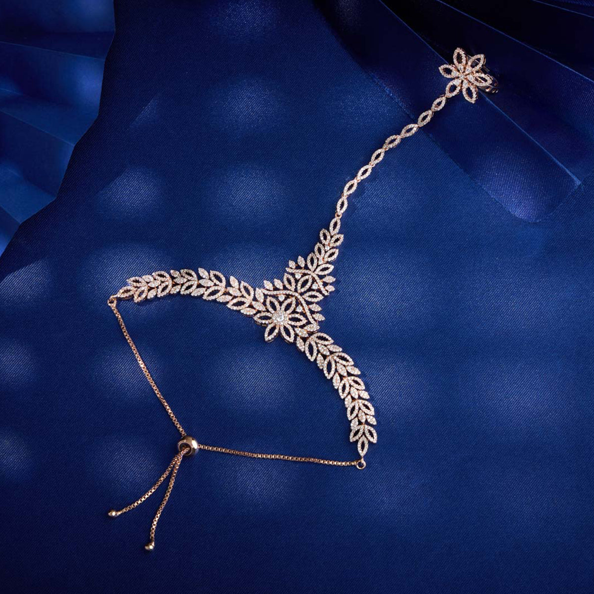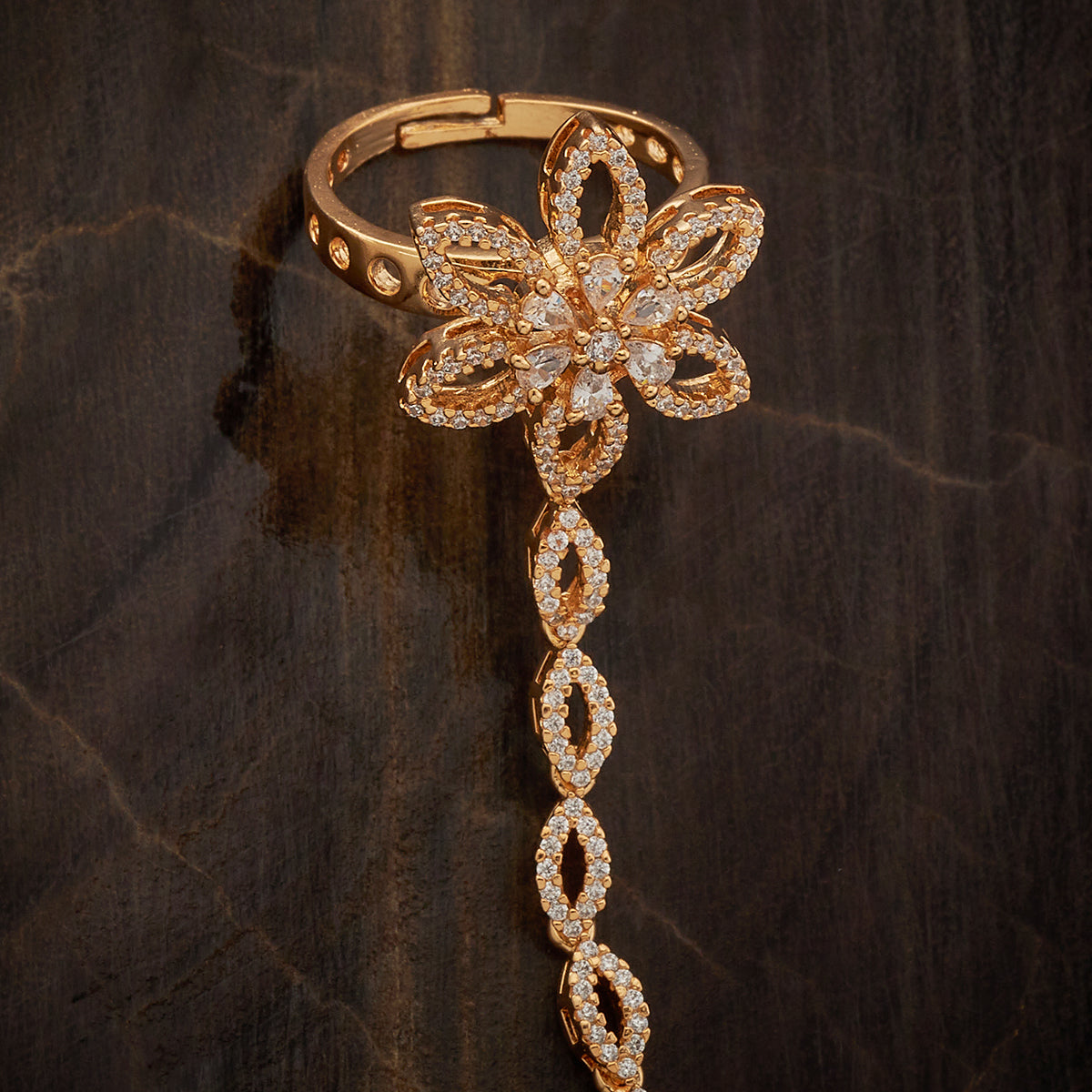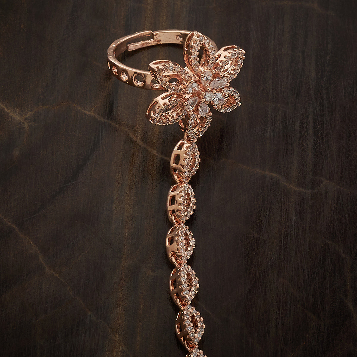Kushal's zircon hathpan will elevate your style! This adjustable item comes in gorgeous gold, rose gold, and rhodium polish and has a copper alloy base embellished with brilliant zircon stones. This hathpan is ideal for any event, combining ancient tradition with modern brilliance. Let your hands do the talking!