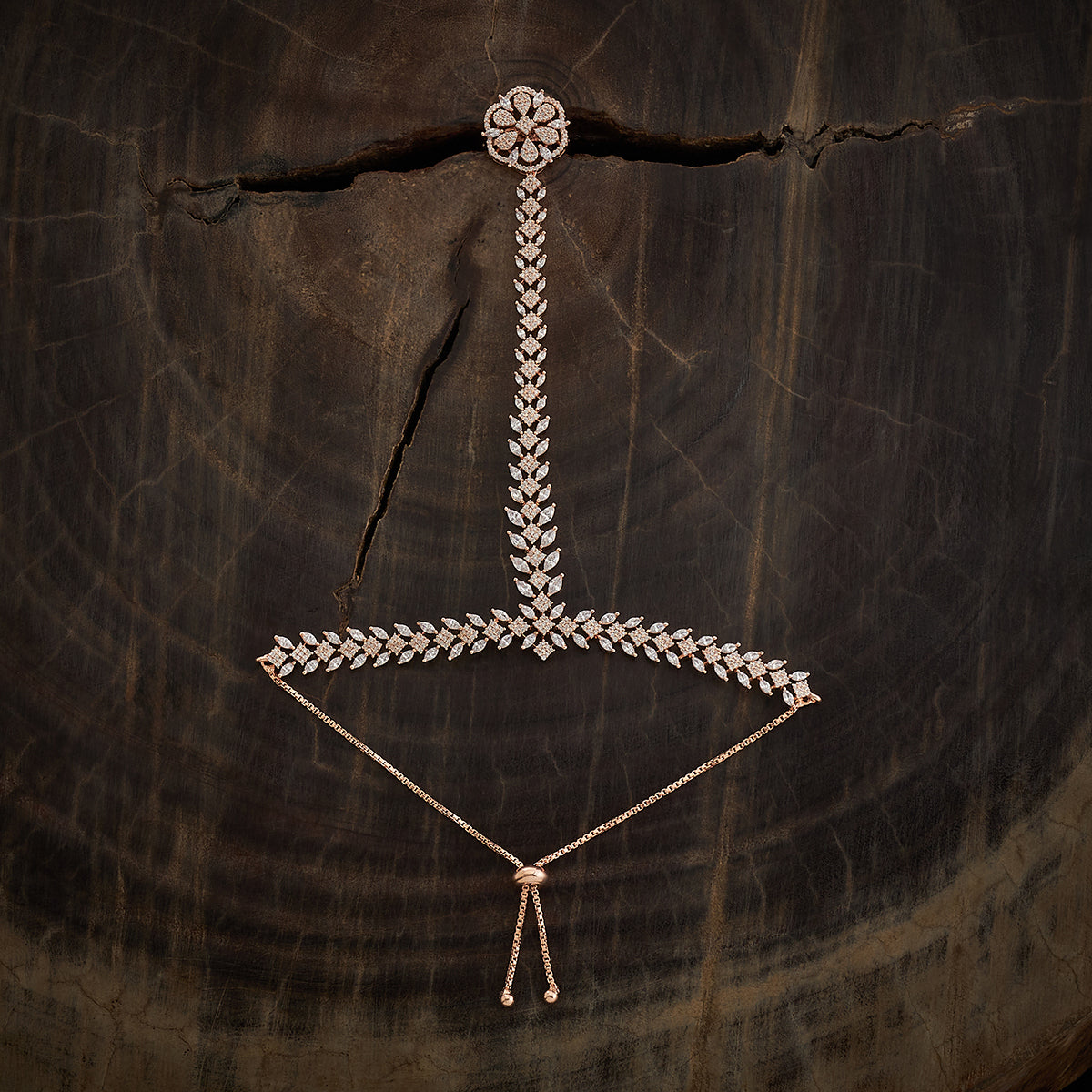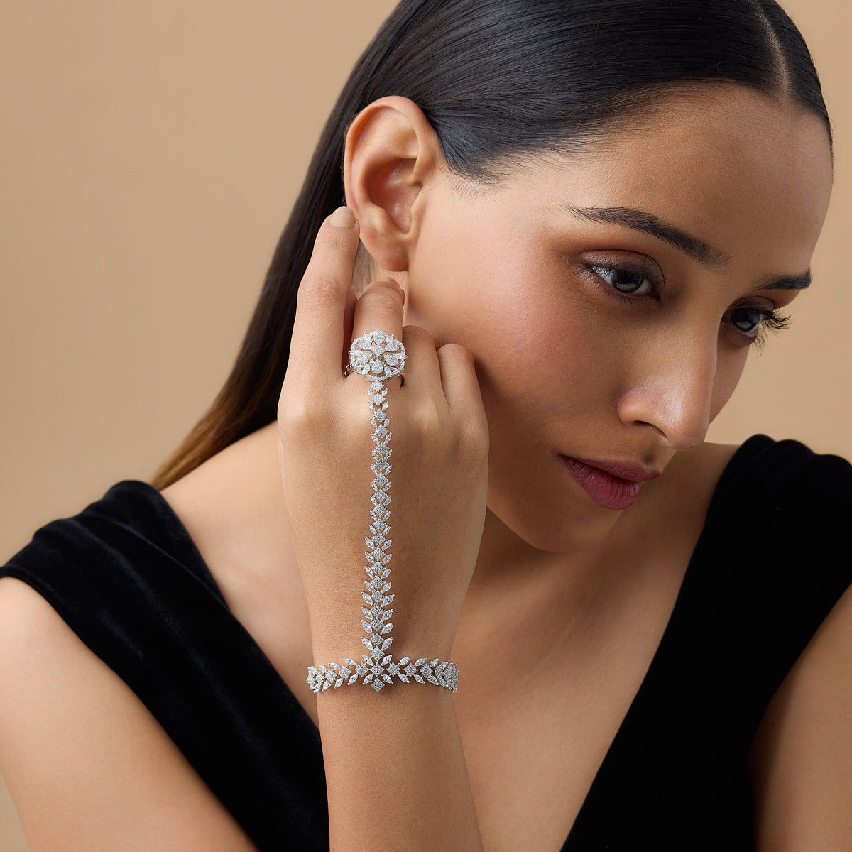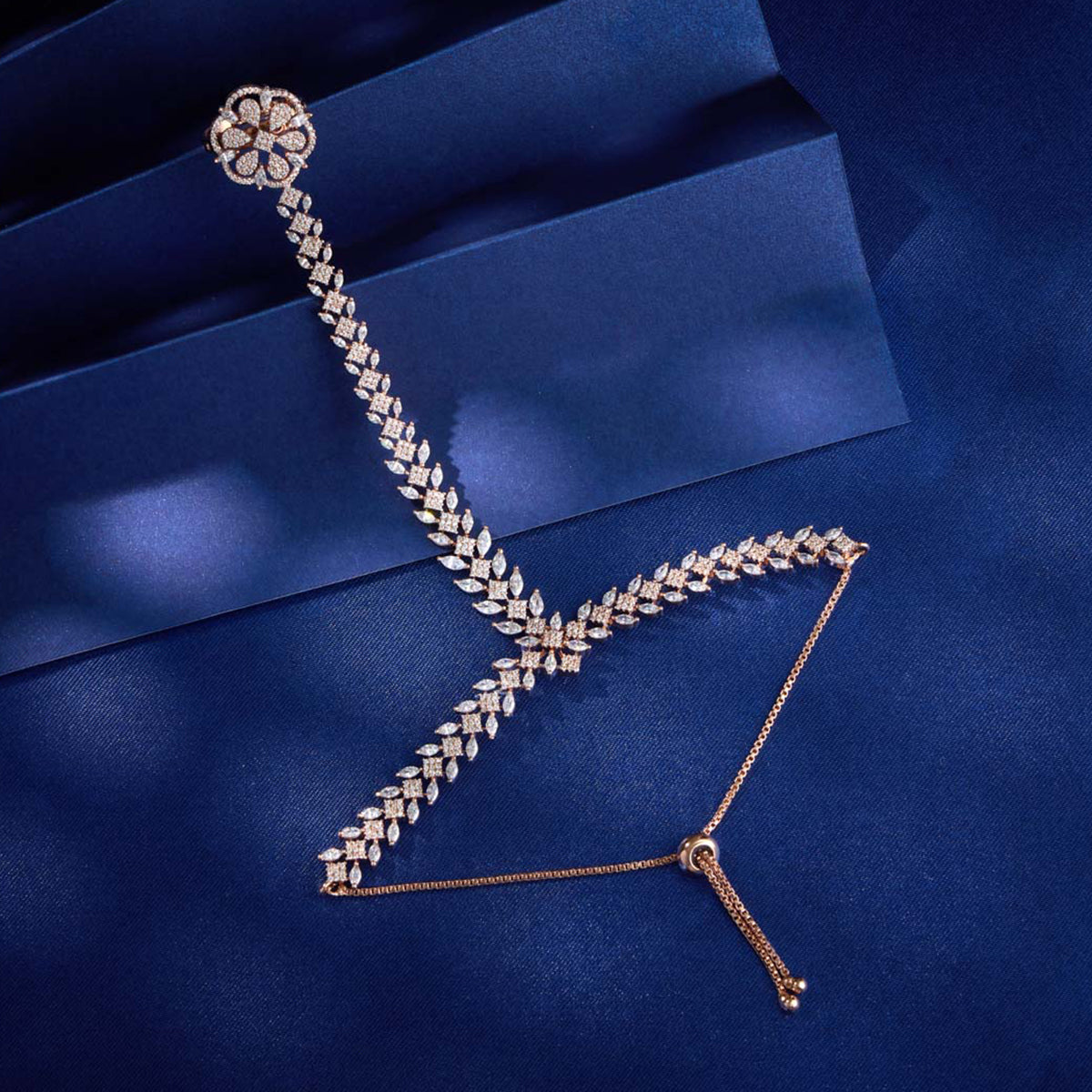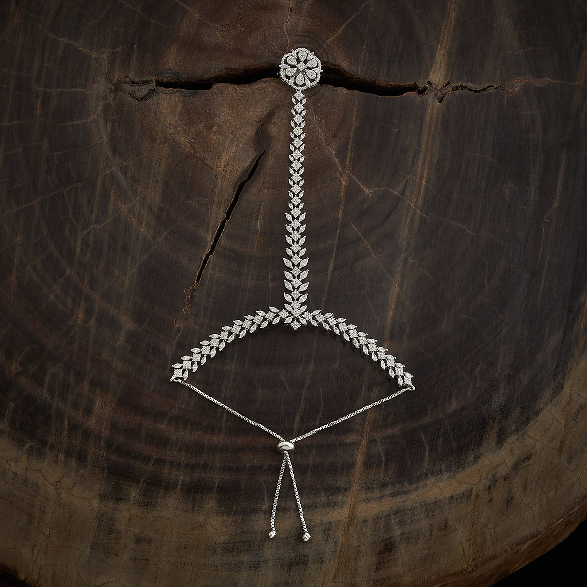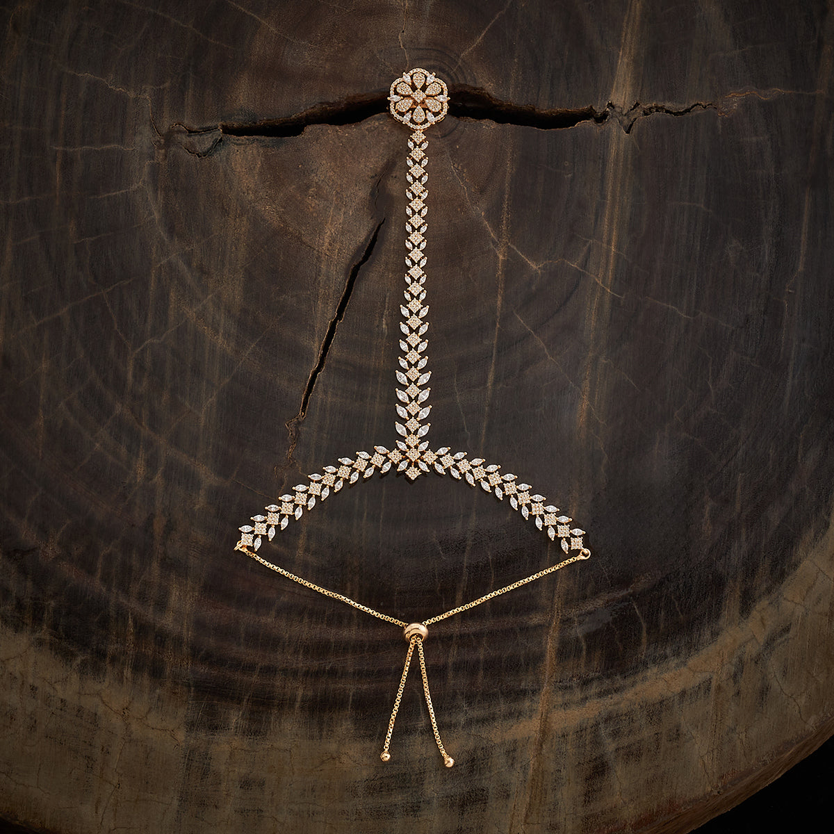 Witness the subtle charm of white zircon stones in this stunning zircon hathpan from Kushal's Fashion Jewellery. Crafted with copper alloy, this jewellery features a gold, rhodium, or rose gold finish to choose from. Style this hathpan with your favourite red saree for a delicate yet impactful presence.