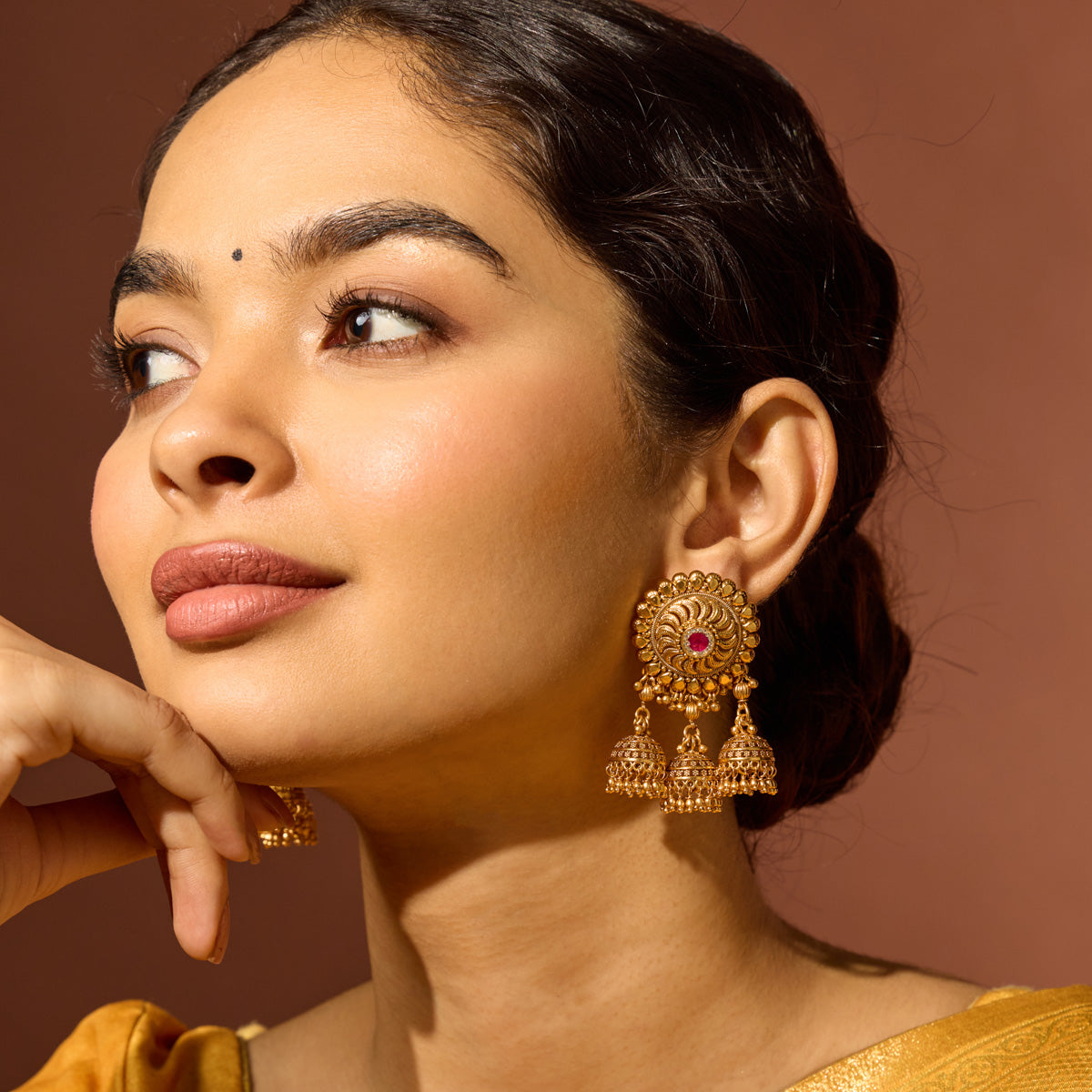 - Classic Gold Jhumkas: These are everyone's favorites when it comes to festivals and wedding seasons. Be it 22K or 24K, the sophistication is what gives you luxury. It will be quite elaborate with intricate designs, including some filigree or meenakari work.
