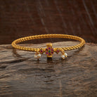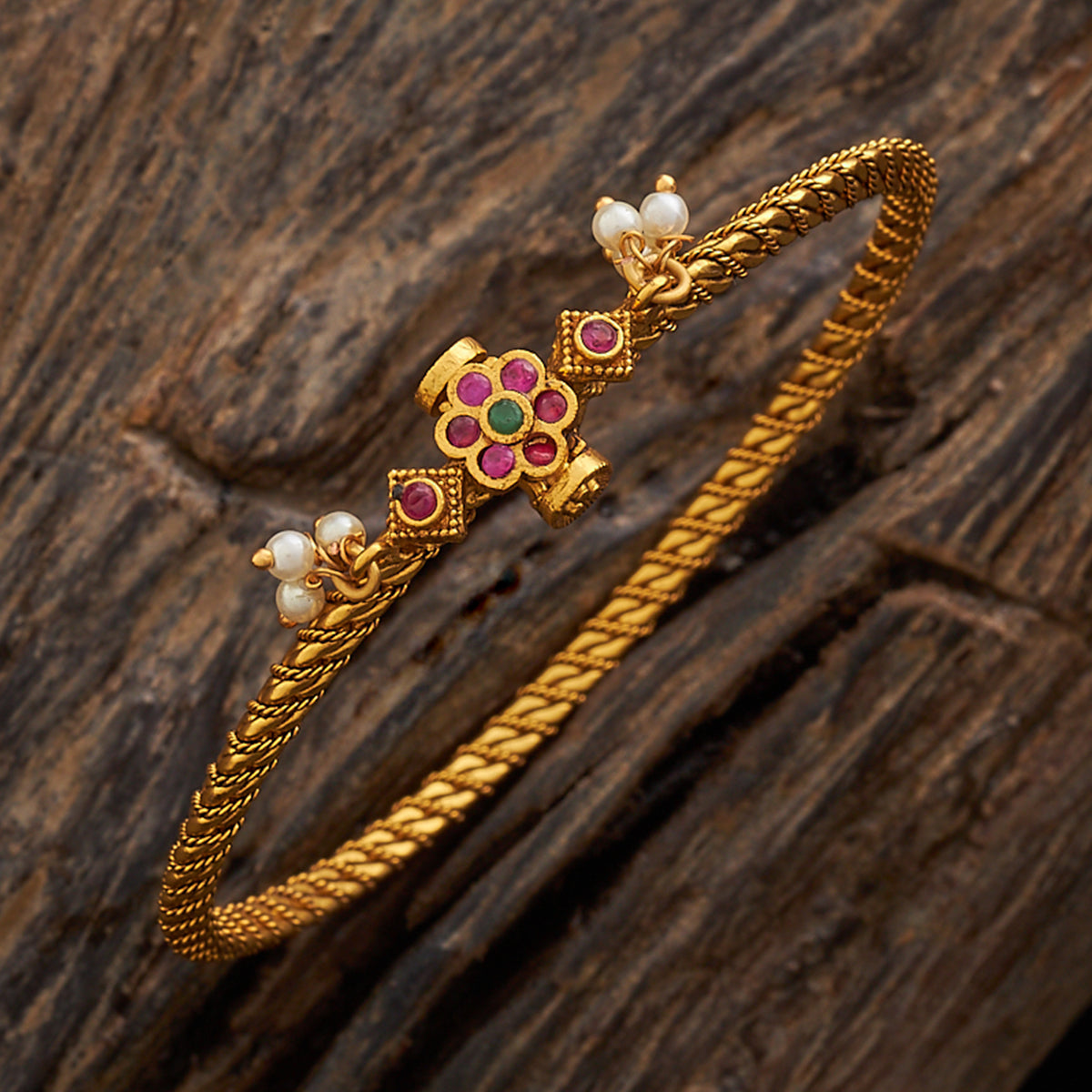 Add a touch of elegance to your ensemble with this antique kada. Featuring a small flower in the centre with ruby and green synthetic stones, surrounded by delicate white beads, it boasts a stunning gold polish. Perfect for traditional Indian outfits, it offers an exquisite and sophisticated look for any occasion.
