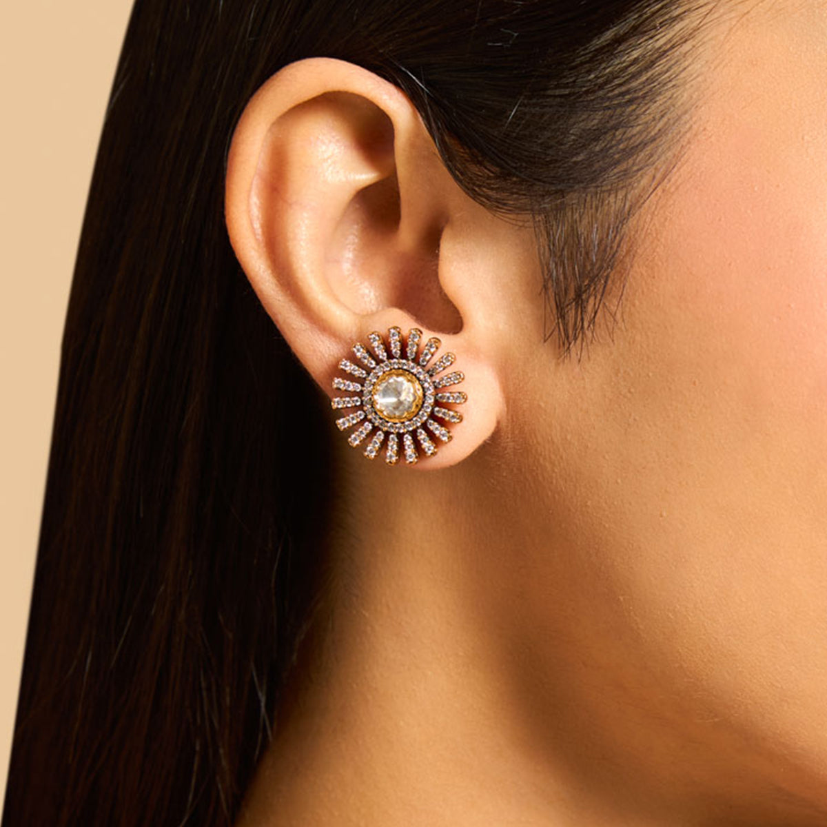 Sparkle and shine with these sun-shaped kundan earrings from Kushal's Fashion Jewellery. Crafted from copper alloy, these exquisite beauties feature white kundan stones set in a Victorian polish to enhance your regal charm. These studs feature a secure push-back closure, letting you style them with comfort all day long.