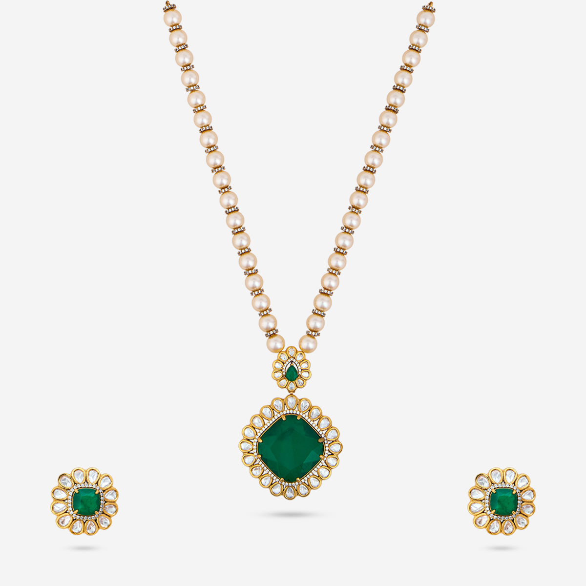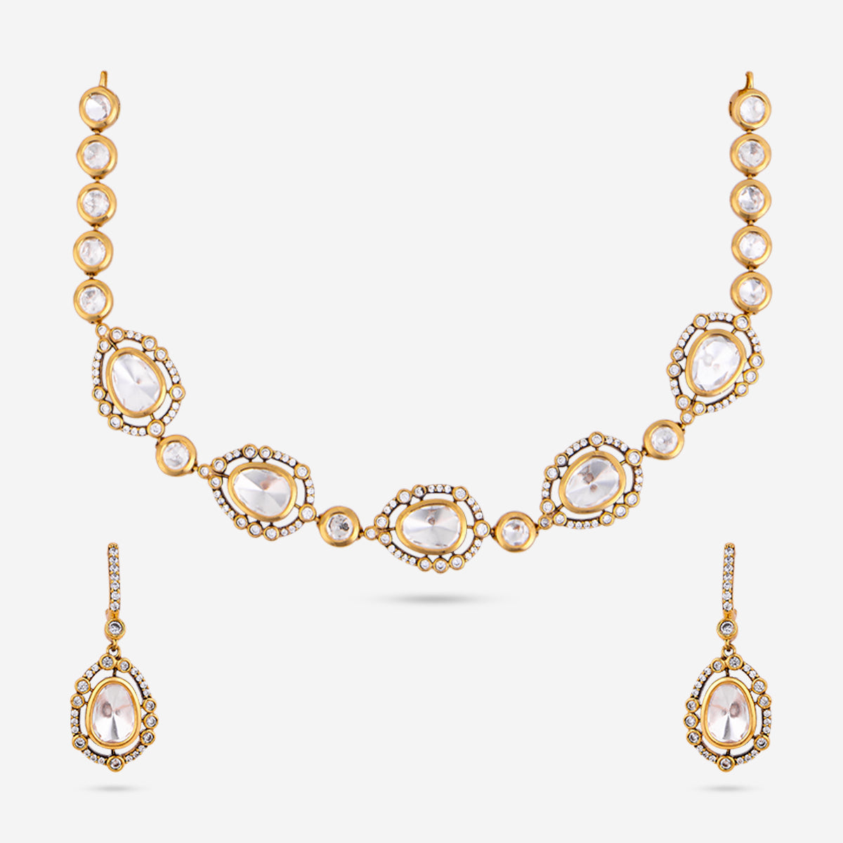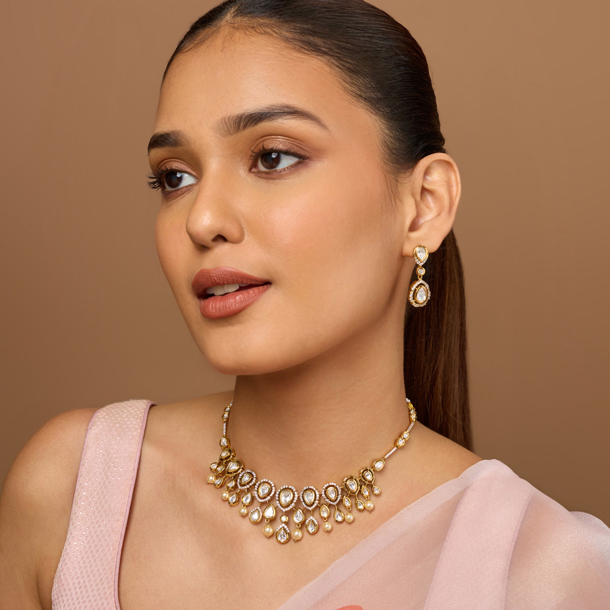 While both are used in traditional Indian jewelry, Kundan necklace sets use glass stones set with gold foil, whereas Polki uses uncut natural diamonds. Kundan jewelry necklace sets offer a similar royal look at a more affordable price, making them a popular choice for bridal and festive wear.