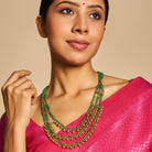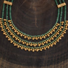 Add royalty to your look with Kushal's stunning antique necklace. Featuring green synthetic stones set in a gold-polished copper alloy, this layered haram-style necklace exudes timeless charm. The adjustable thread allows for a comfortable fit, making it perfect for any occasion. A classic piece that adds a royal touch to your ensemble.