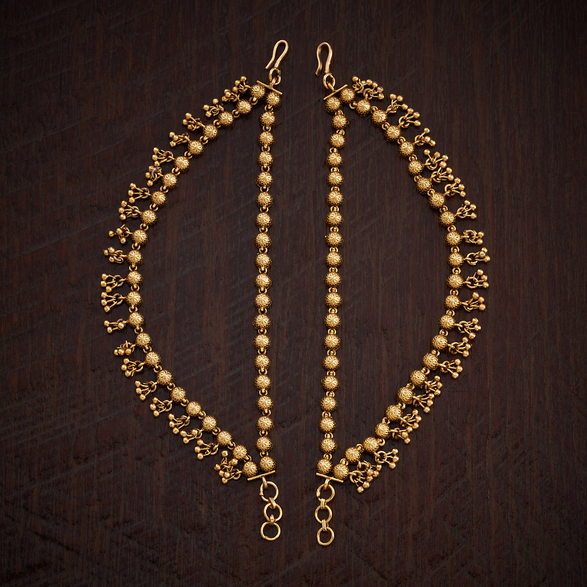 Elevate your traditional look with this pair of antique Matil this festive season. Its elegant design and impressive finishing will add an alluring charm to your Indian look and will make you stand out among the crowd. You can style it with both tied or loose hair. Its gold polishing will enhance your traditional look, complementing the all-ethnic vibes. Style up your attire with our antique matil this festive season.